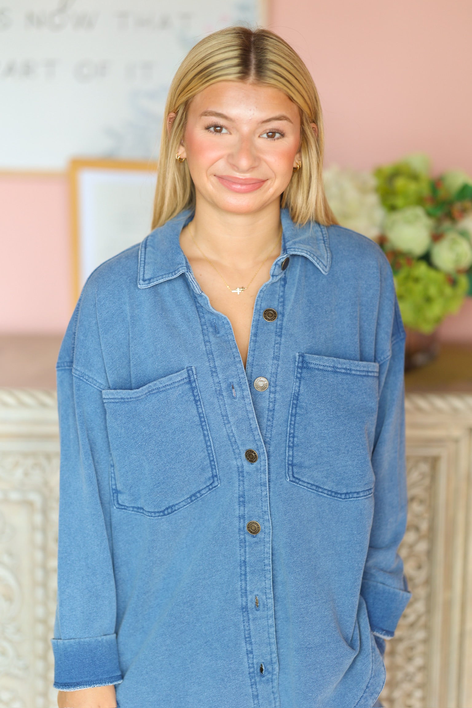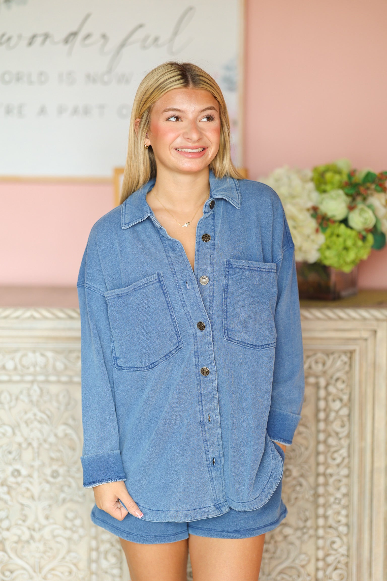 The All Day Knit Denim Jacket combines the laid-back look of denim with the unbeatable comfort of a soft knit. Designed with a relaxed fit, classic button-front closure, and versatile wash, it’s the perfect lightweight layer to wear from morning to night, keeping you stylish and comfortable all day long.