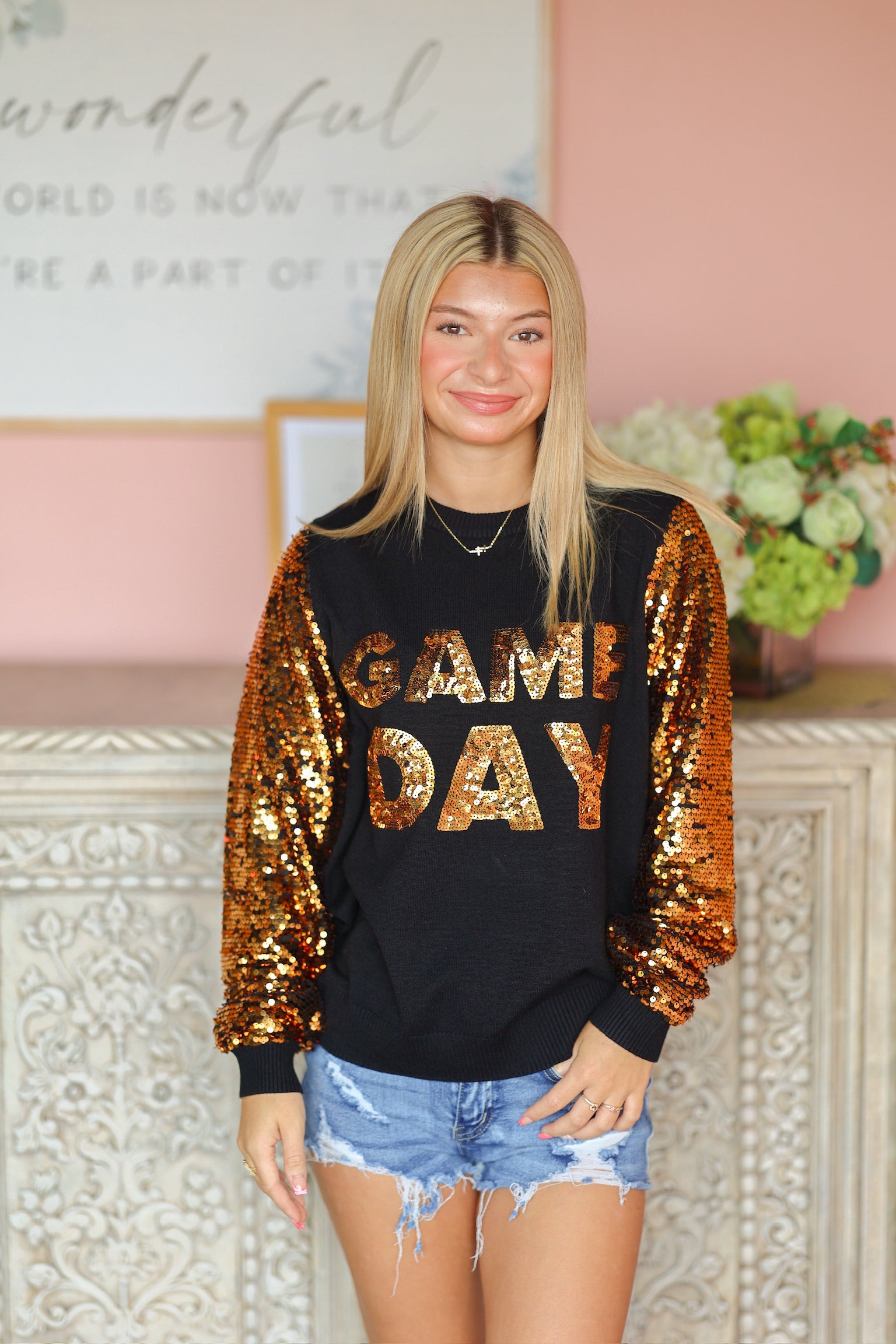 This gold game day sweater shines bright with its rich, warm hue and bold team-inspired graphics. Crafted from soft, cozy knit fabric, it offers a relaxed fit and ribbed cuffs for comfort and style—perfect for celebrating in standout fashion on game day.