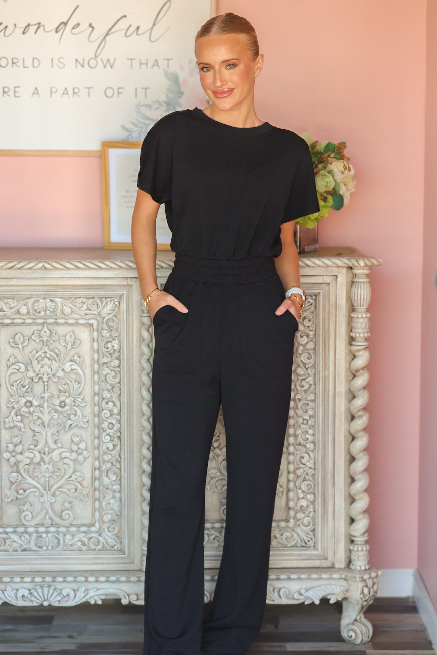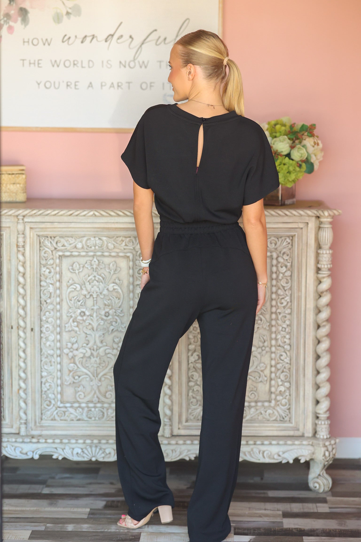 This plain black jumpsuit is a timeless wardrobe staple with endless versatility. Designed with a sleek, minimalist silhouette, it features a flattering cinched waist and a relaxed yet tailored fit through the legs. The soft, stretchy fabric offers comfort without compromising on style, making it perfect for dressing up with heels or keeping it casual with sneakers. Effortlessly chic, this one-piece is ideal for any occasion.