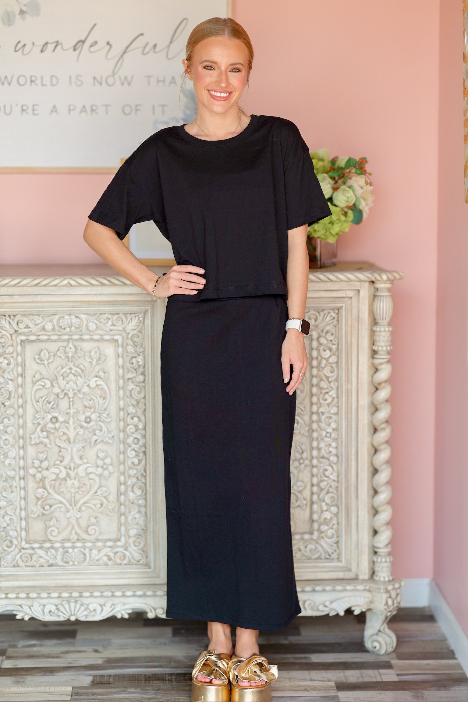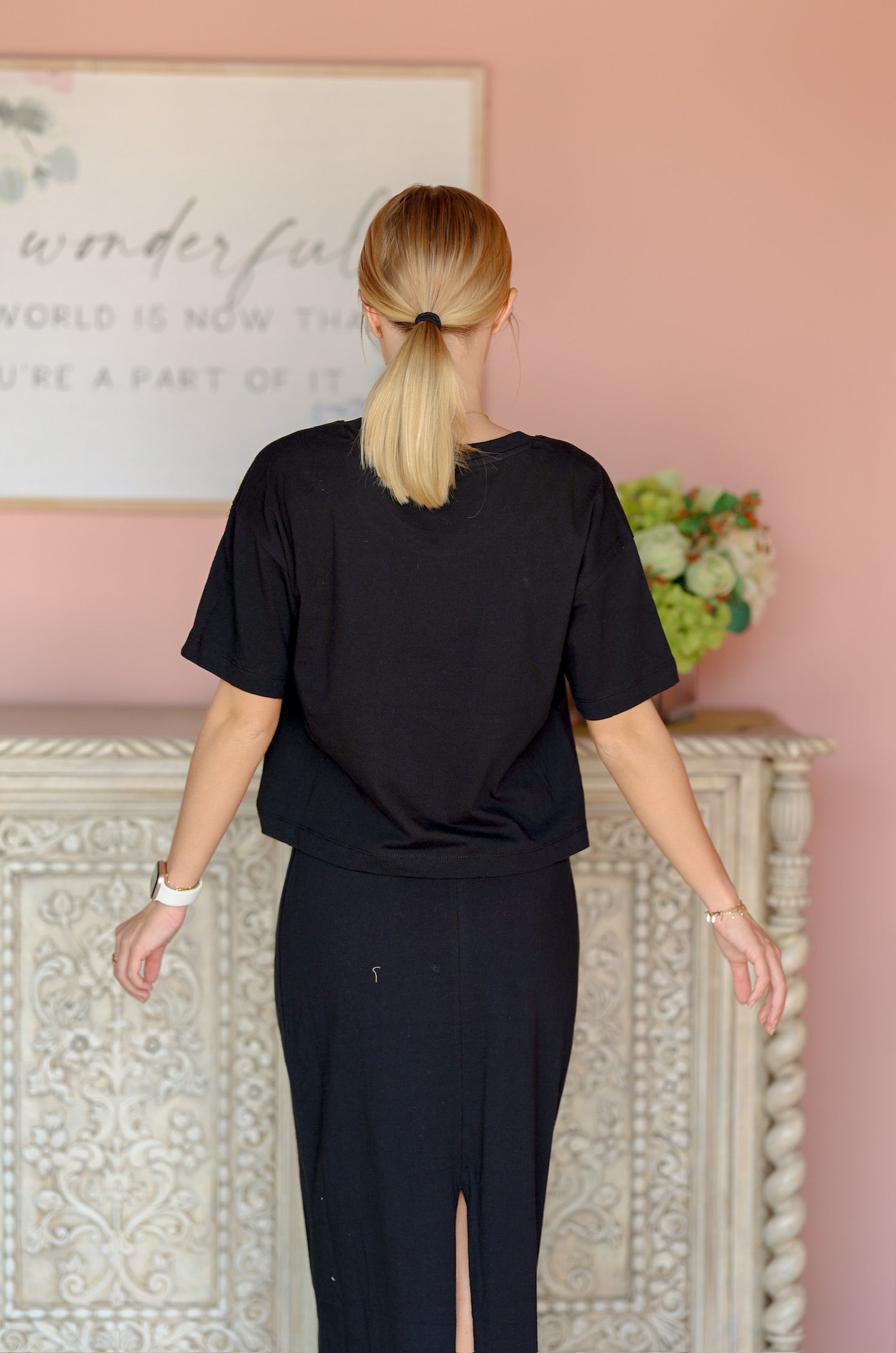 A classic black tee that’s effortlessly versatile and endlessly comfortable. Designed with a soft, breathable fabric and a relaxed fit, it’s the perfect staple piece to layer or wear on its own. The clean crew neckline and short sleeves make it easy to style—pair it with jeans, skirts, or joggers for a timeless look that works for any occasion.