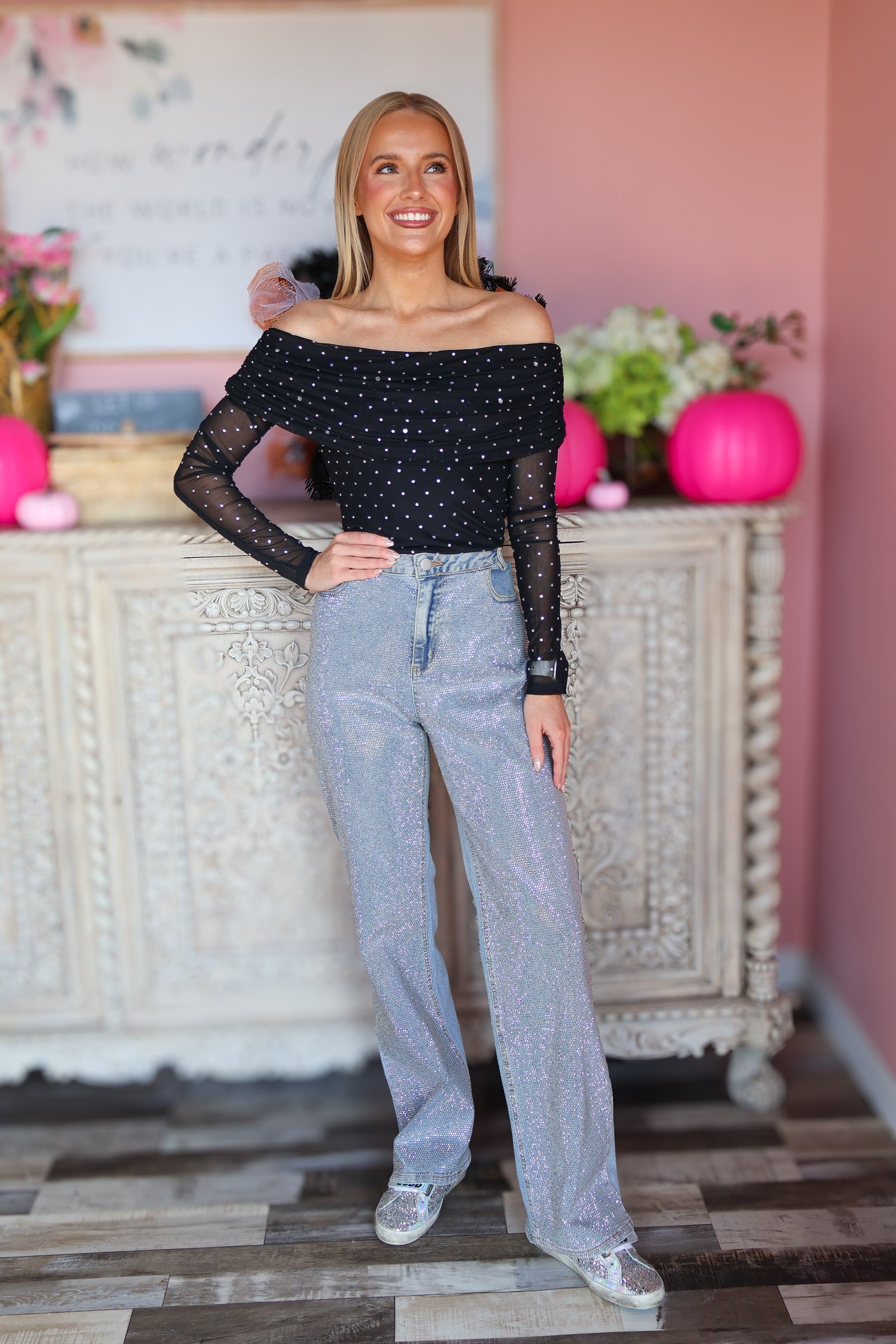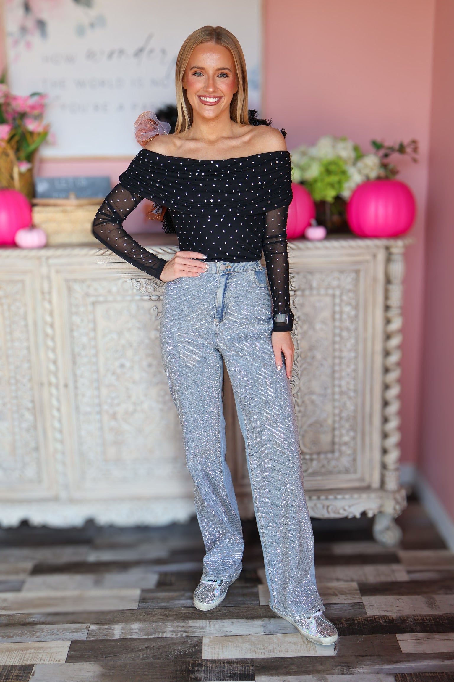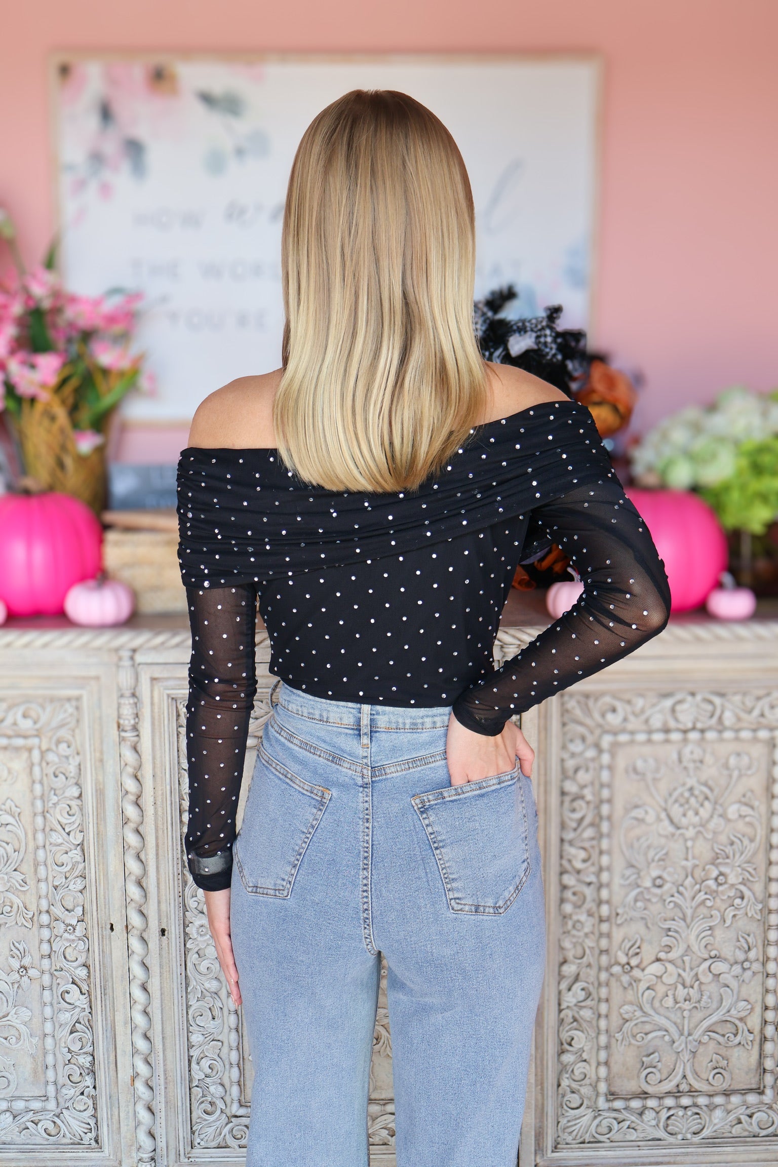 This black stoned off-the-shoulder top is a chic and glamorous statement piece. Designed with a flattering off-the-shoulder neckline, it beautifully highlights the collarbone and shoulders. The fitted silhouette is adorned with sparkling stone embellishments that add the perfect touch of shimmer and sophistication. Made from a soft, comfortable fabric with a hint of stretch, this top pairs effortlessly with high-waisted pants or a sleek skirt for a stunning evening or event-ready look