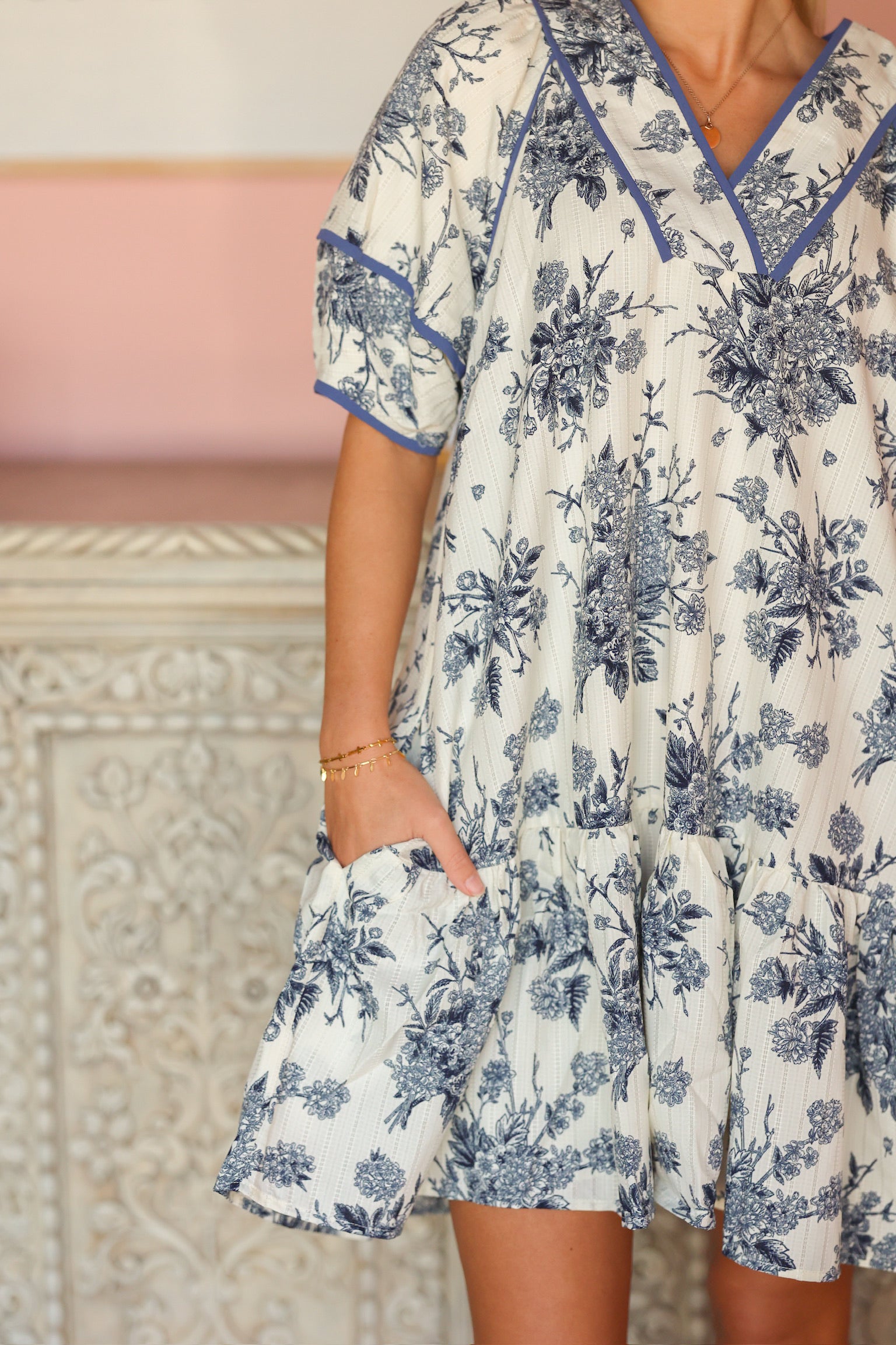 This blue floral v-neck dress features a flattering neckline that adds a touch of femininity and elegance. The fabric is adorned with a delicate floral print in soft, complementary hues, creating a romantic and breezy vibe. It typically has a fitted bodice that flows into a relaxed skirt, offering comfort and ease of movement. Whether it's styled with sandals for daytime or heels for an evening out, this dress is perfect for warm-weather occasions.