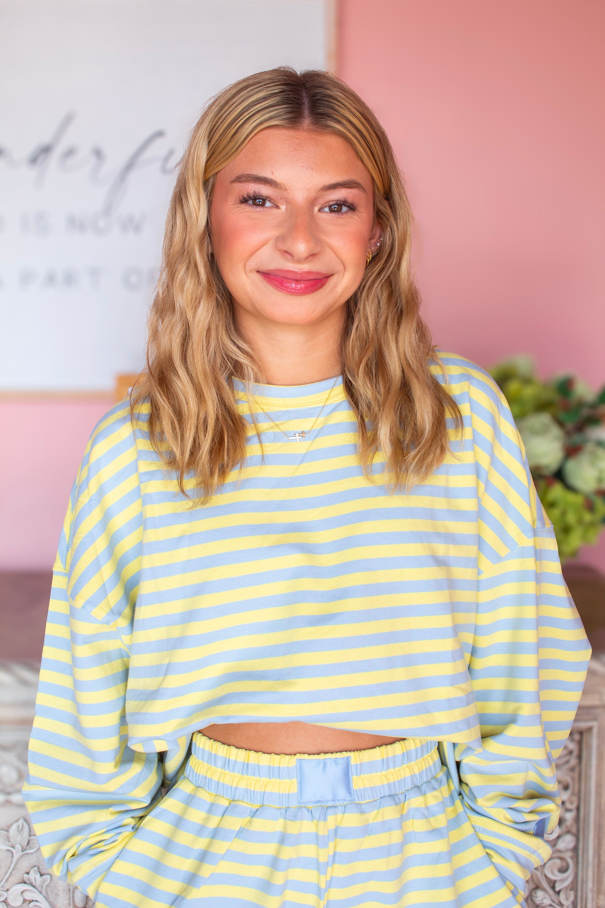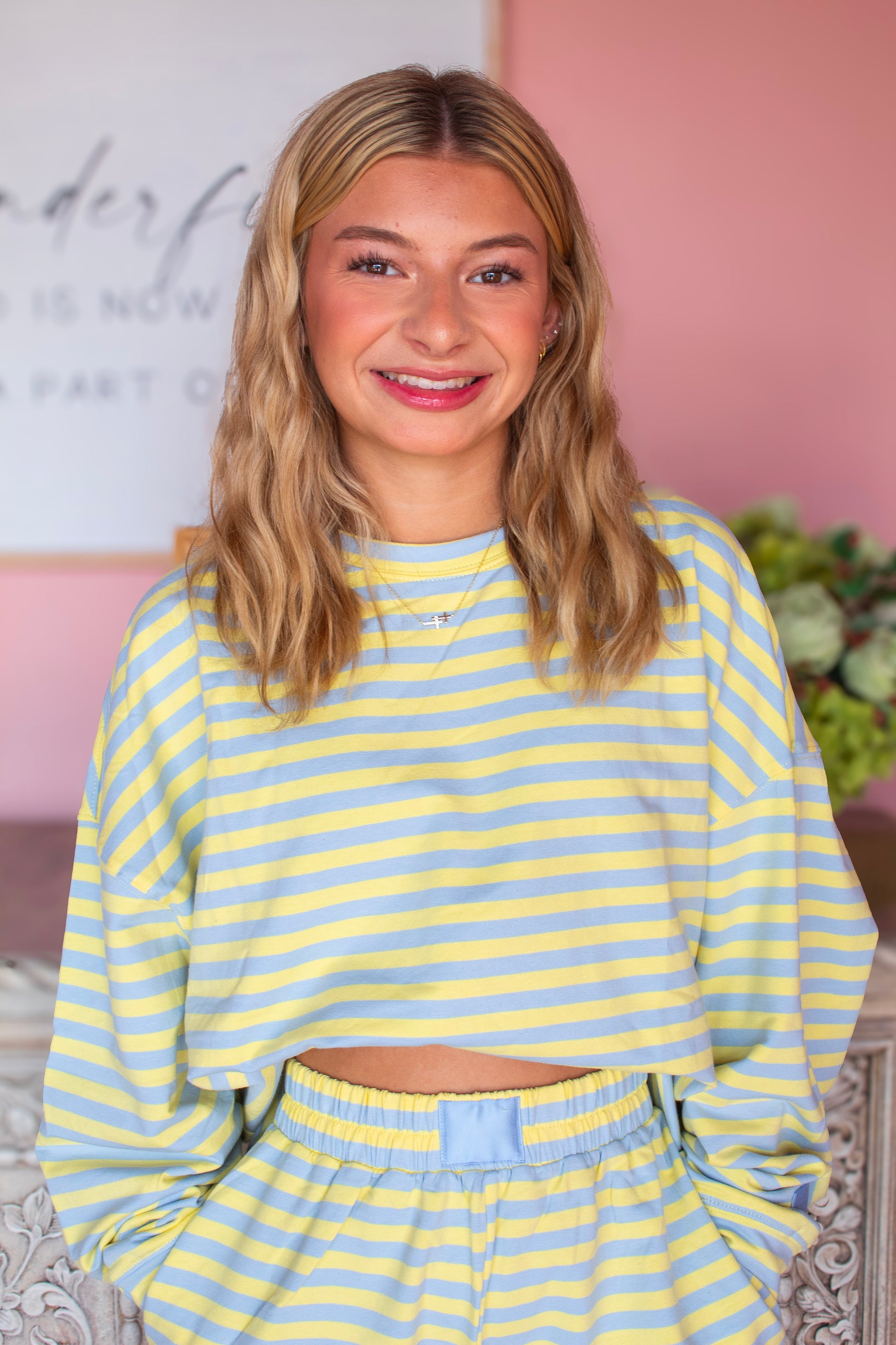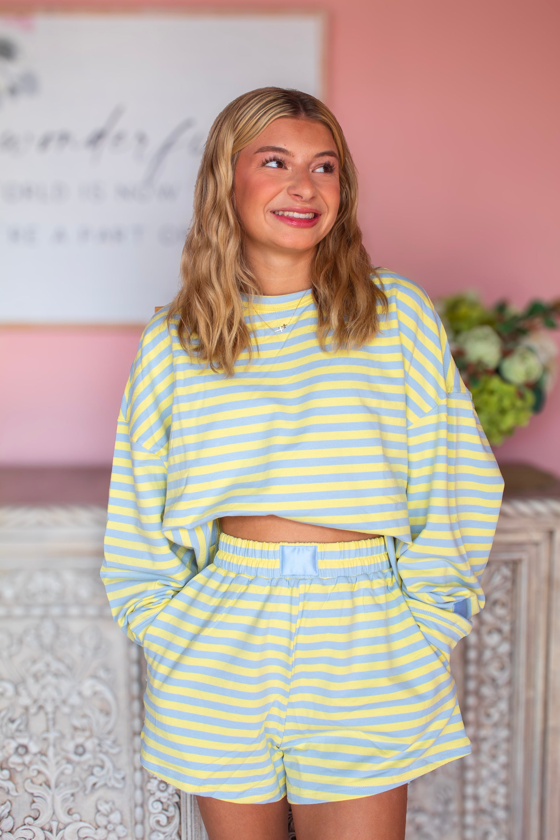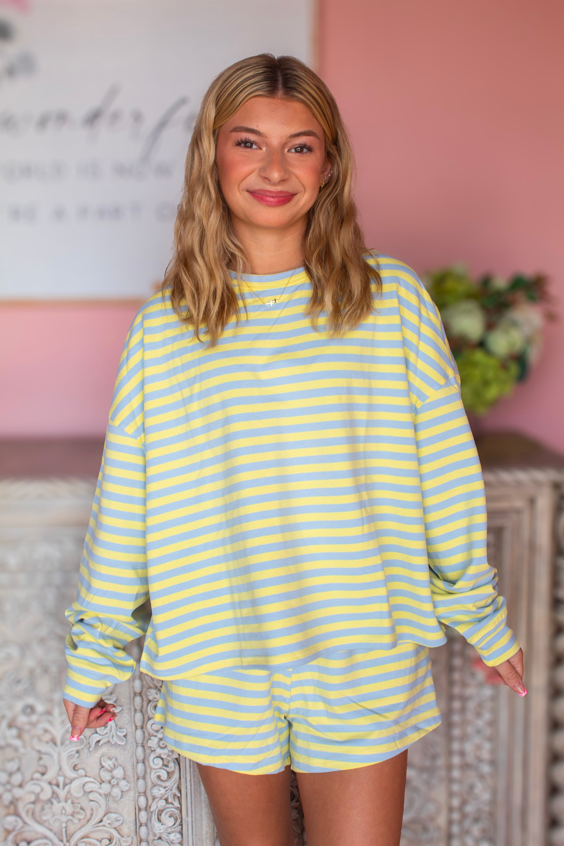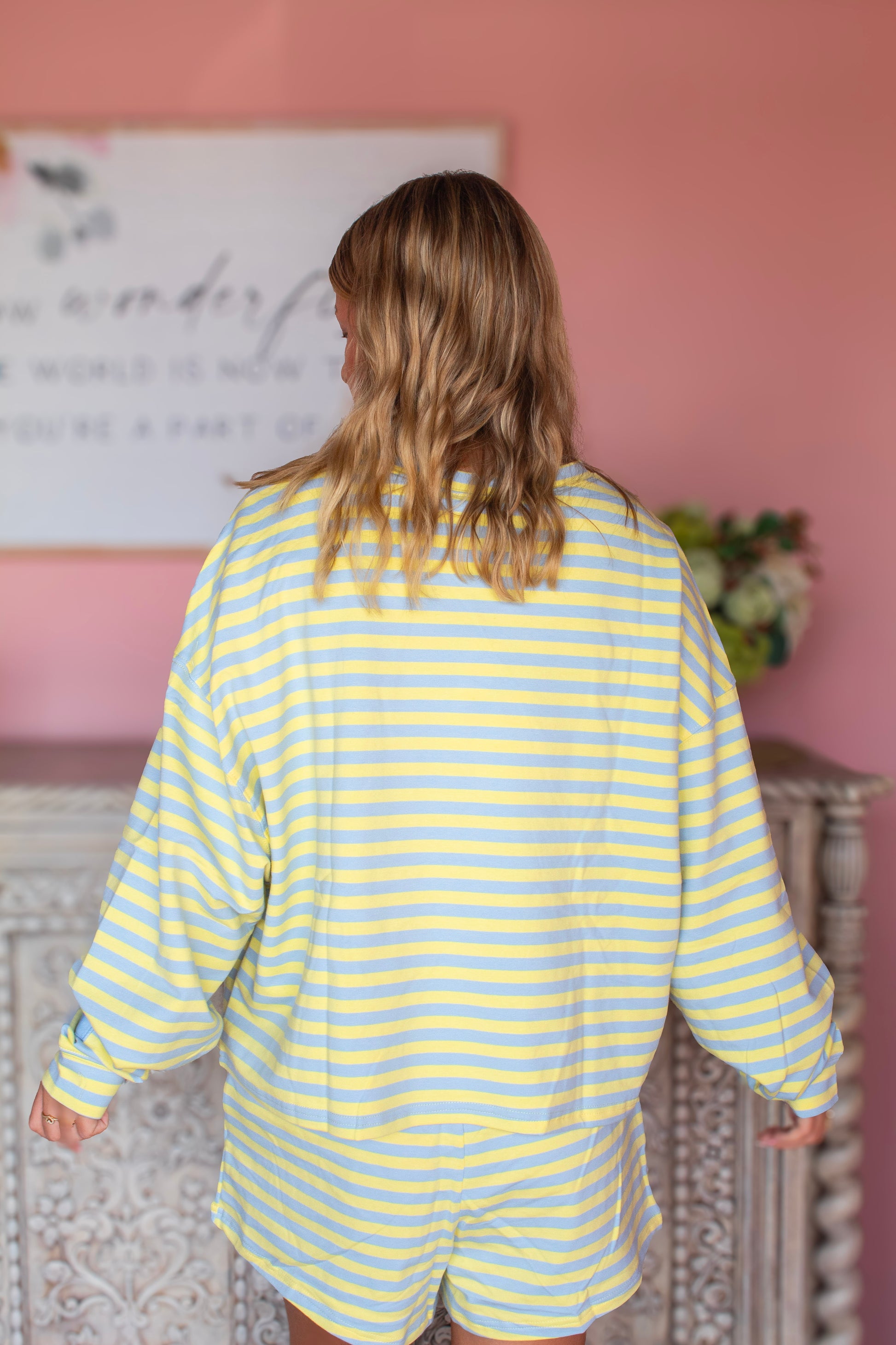 A playful and eye-catching set featuring a blue and yellow striped long sleeve top paired with matching shorts. The lightweight fabric offers comfort and ease, while the bold color combo gives it a fresh, sporty feel. Perfect for casual outings, lounging, or adding a pop of color to your everyday wardrobe.
