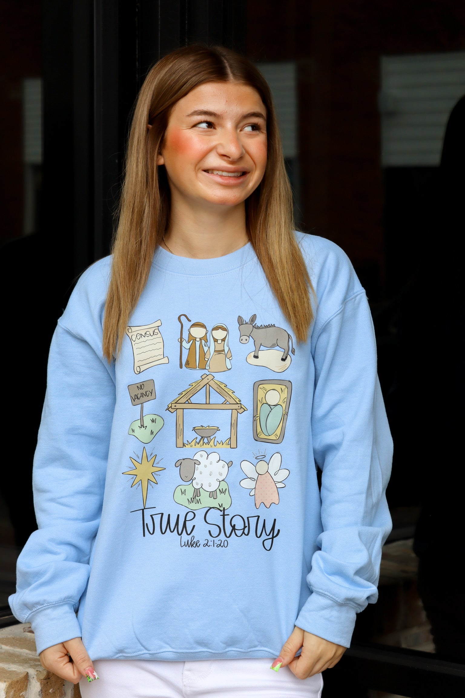 The Blue True Story Christmas Sweatshirt is a meaningful and festive way to celebrate the season. Crafted from soft, cozy fabric, it features the phrase “True Story” alongside a nativity-inspired design — a beautiful reminder of the real reason for Christmas. The rich blue color adds a touch of winter charm, while the relaxed fit keeps it comfy for everyday wear. Perfect for pairing with jeans or joggers, this sweatshirt blends faith, comfort, and holiday spirit in one timeless piece.