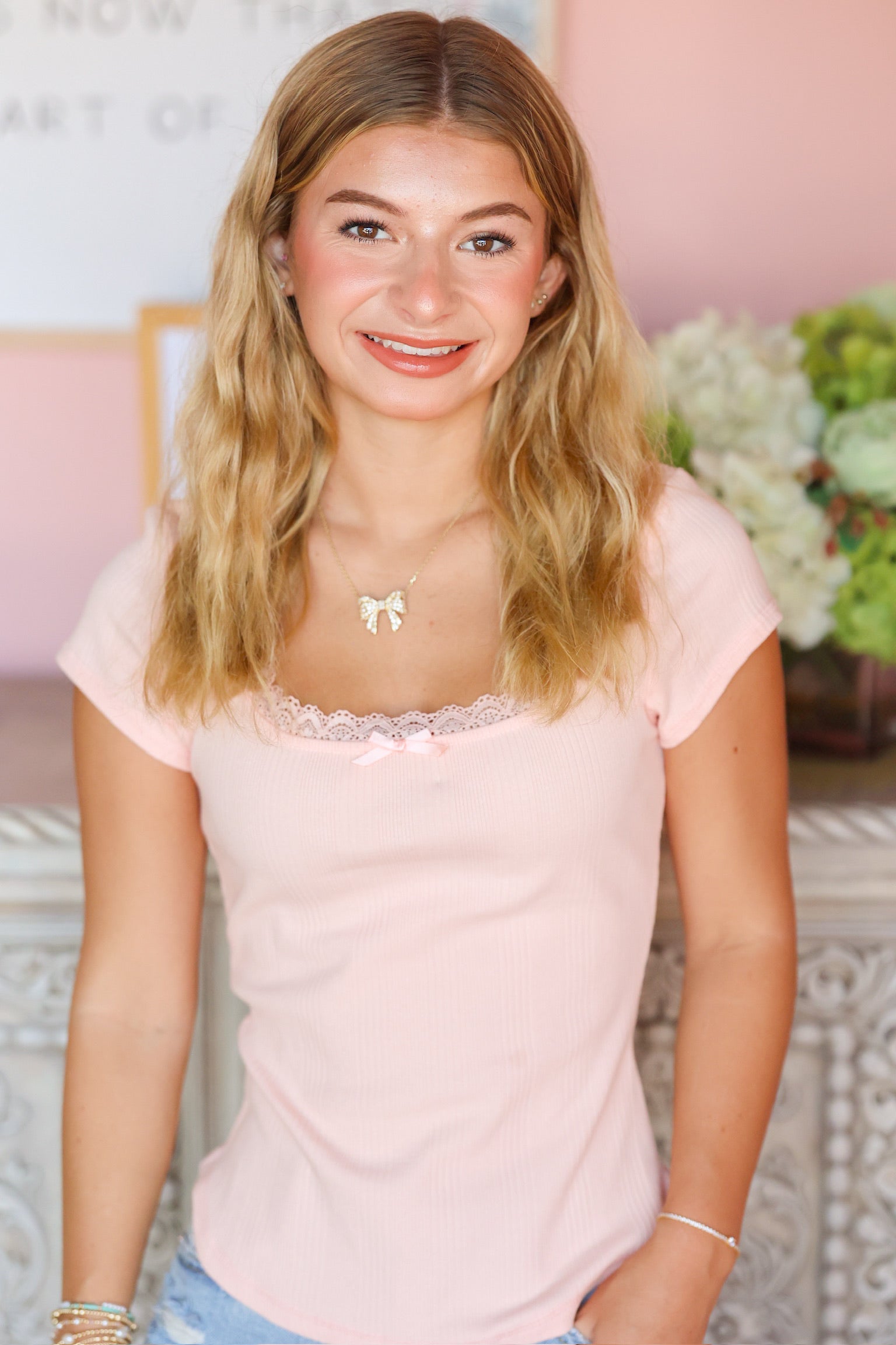 This blush pink ribbed lace top is romantic with a touch of vintage charm. Crafted from a soft, stretchy ribbed fabric, it hugs the body for a flattering fit. Delicate lace trim along the neckline, sleeves, or hem adds a feminine and elegant detail. The blush pink hue brings a soft, dreamy feel, making it perfect for layering or wearing on its own. Dress it up with a skirt or keep it casual with jeans for a versatile, pretty look.