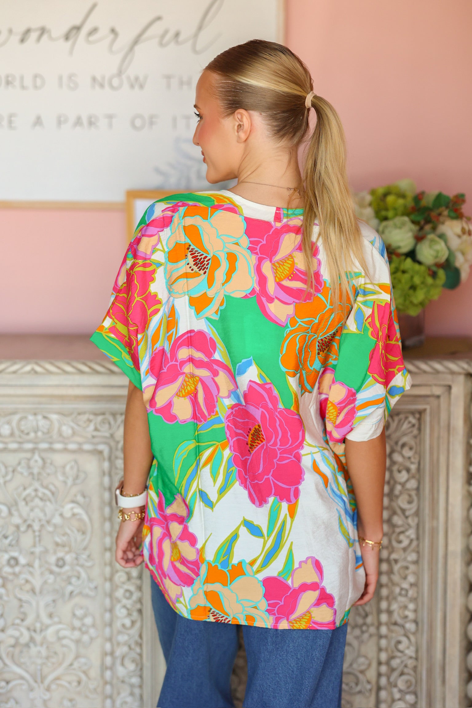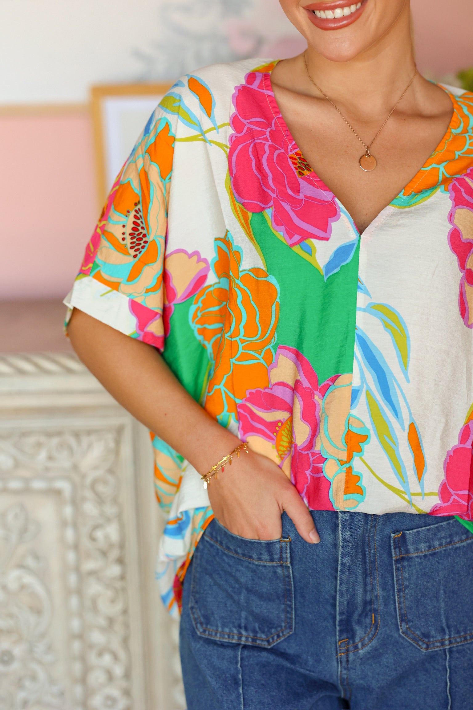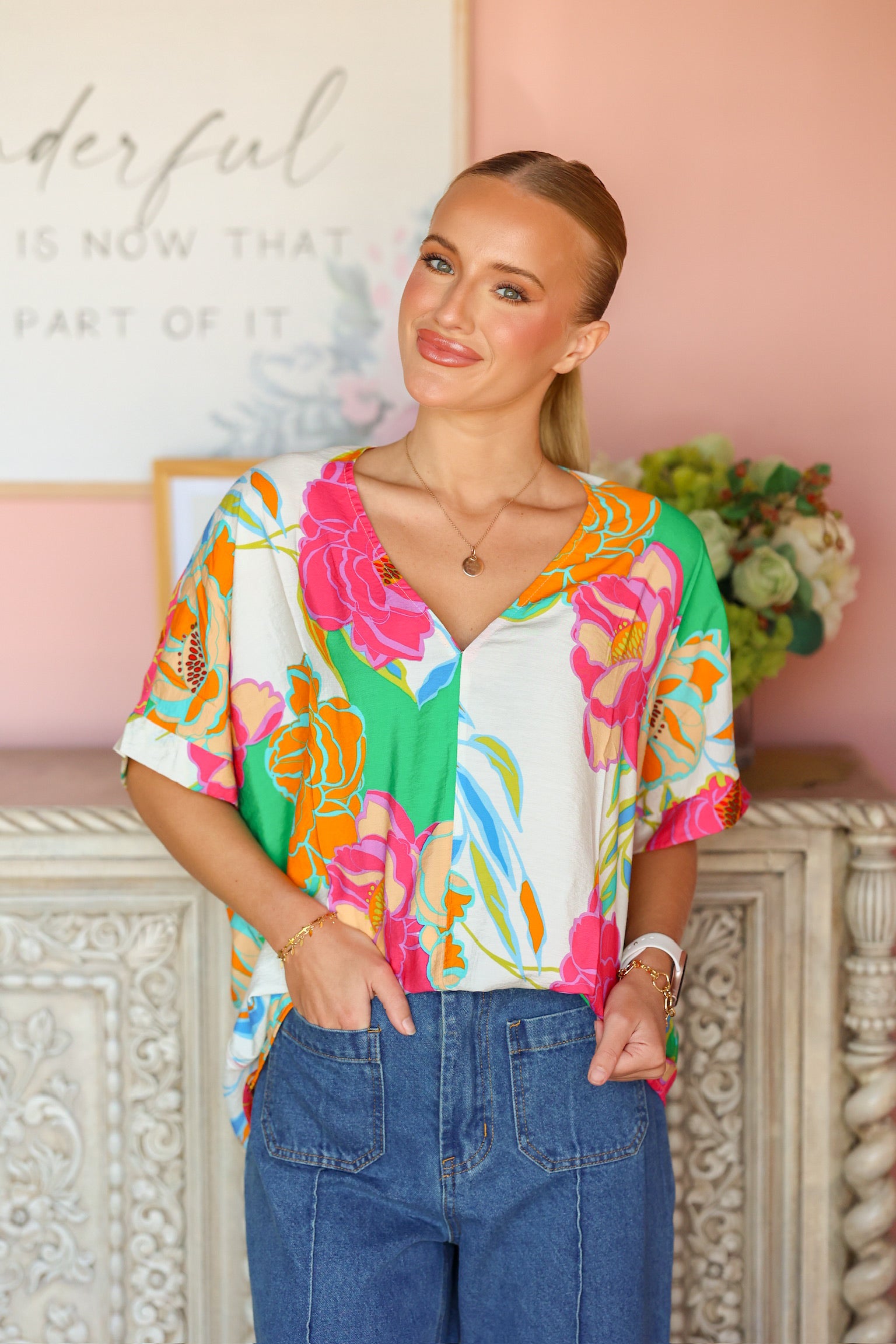 This cream floral top is soft, feminine, and timelessly elegant. Set against a creamy neutral background, delicate floral prints in pastel shades—like blush pink, sage green, or lavender—add a romantic touch. The silhouette is typically lightweight and flowy, often featuring subtle details like ruffled sleeves, a peplum hem, or a gentle scoop or V-neckline. Perfect for pairing with jeans, skirts, or linen pants, this top brings a fresh, graceful vibe to both casual and dressy outfits.