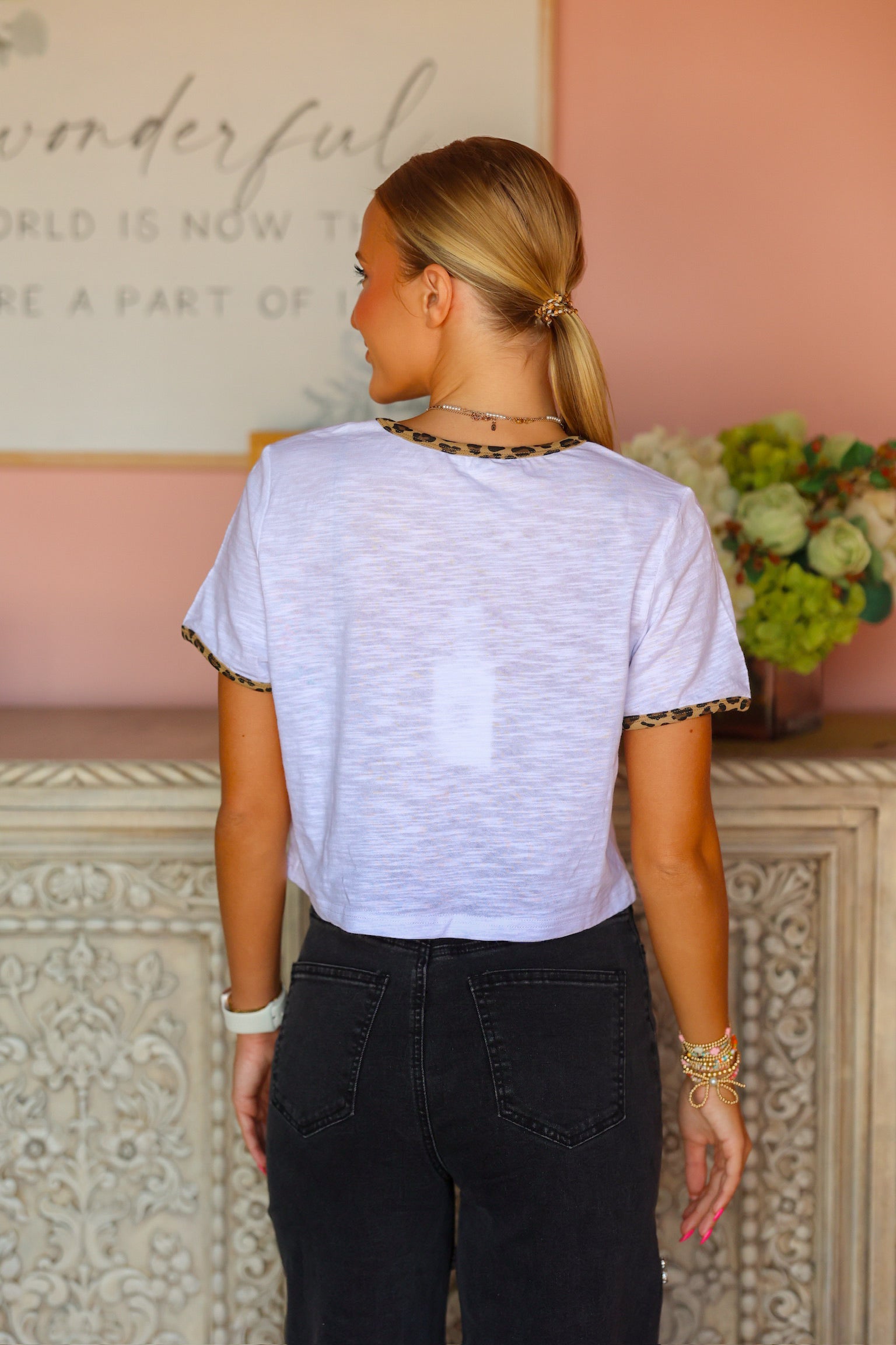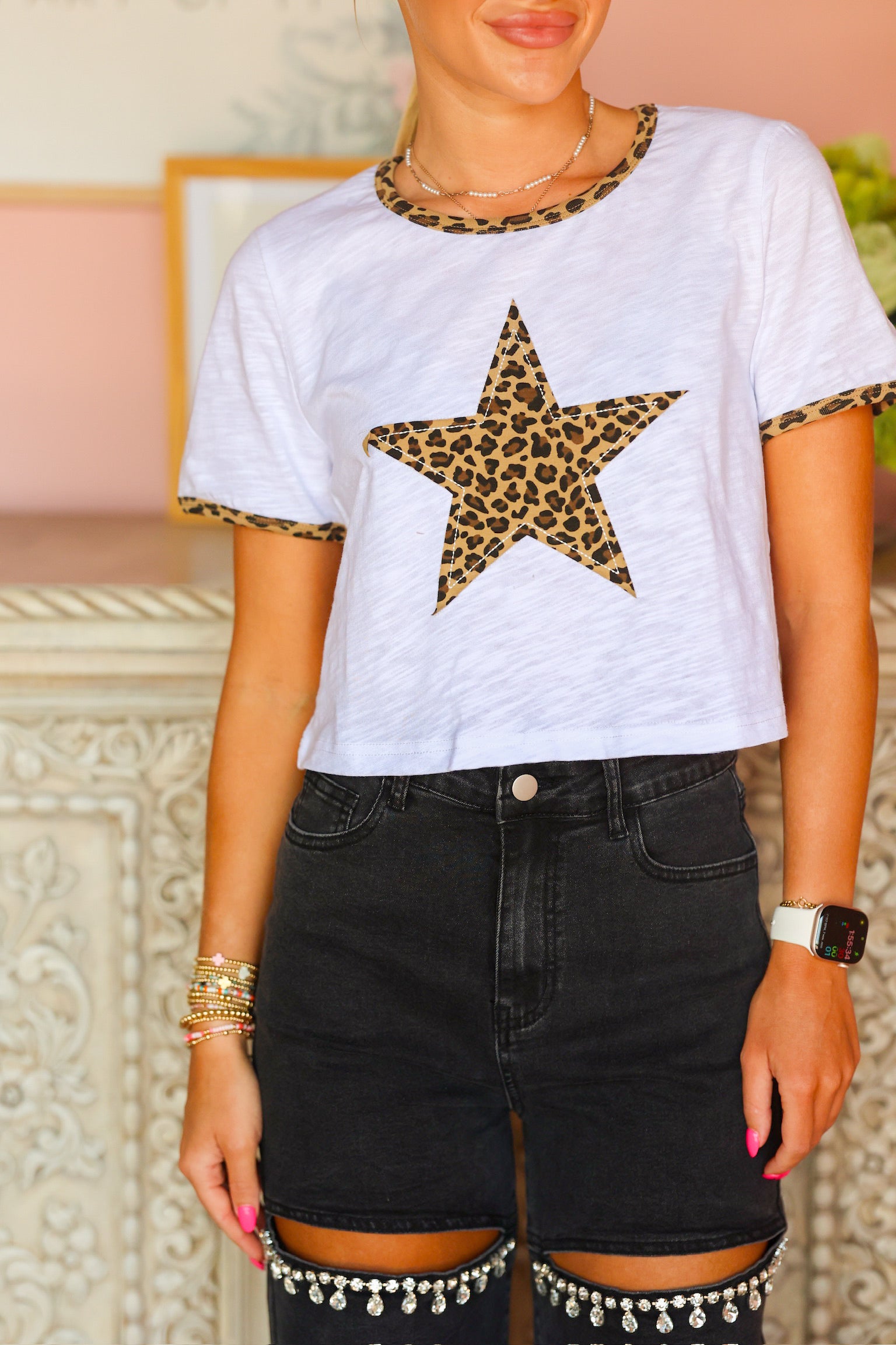 This white baby tee is a playful mix of classic and bold. Made from soft fabric, it features a flattering, silhouette with a cropped length. Front and center, a striking leopard-print star adds a fierce pop of personality, making it the perfect statement piece for casual days with a wild side.