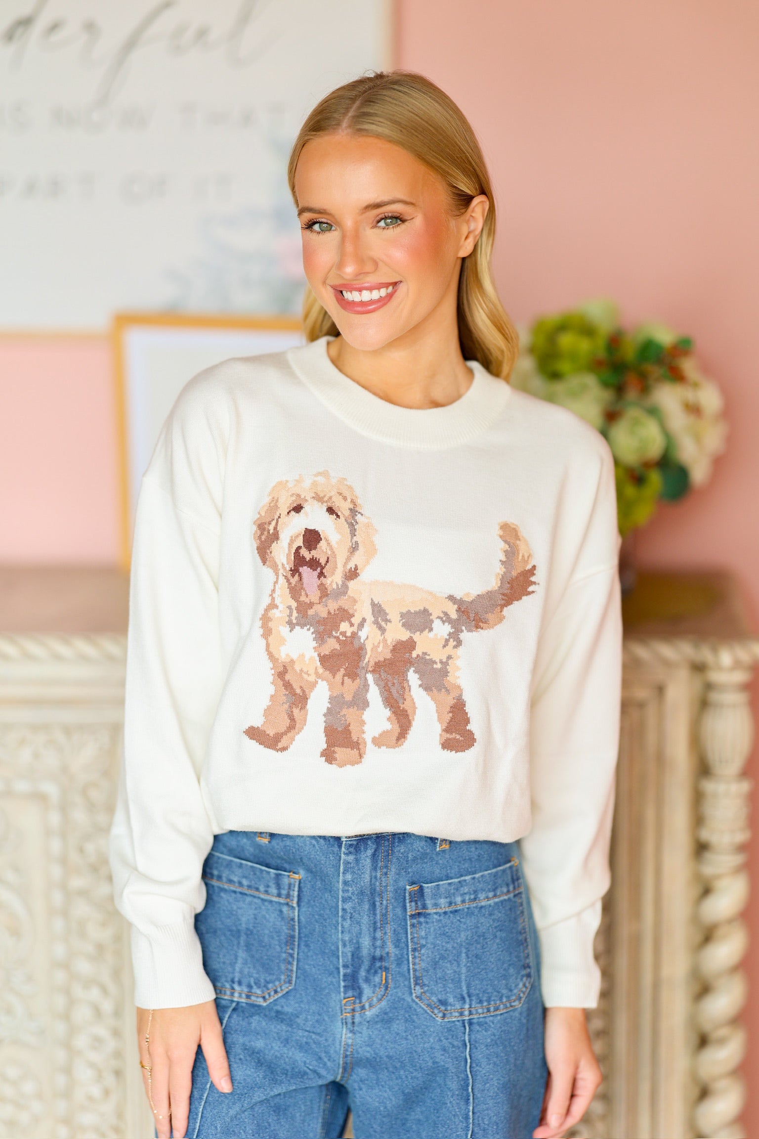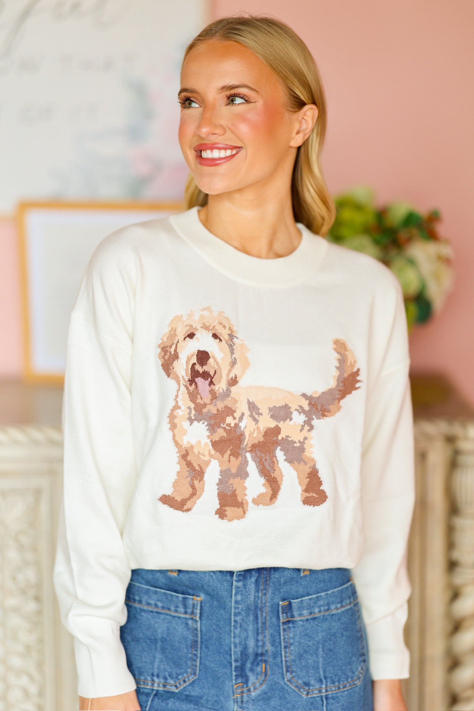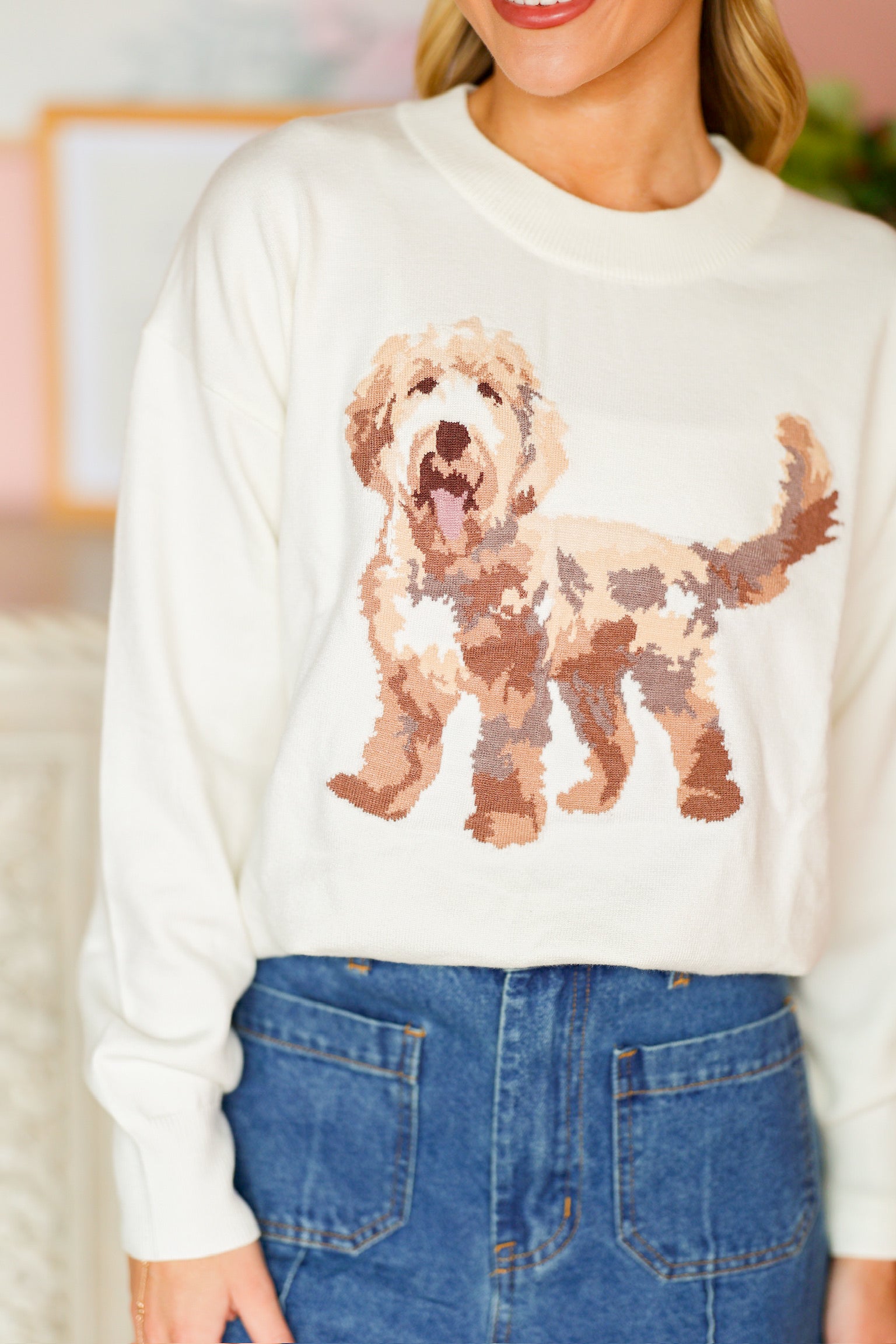 The Golden Doodle Sweater is a cozy and playful knit made to bring a smile to your wardrobe. Crafted from soft, comfortable fabric, it features a charming golden doodle design that adds a fun and lighthearted touch. With its relaxed fit and classic sweater silhouette, it’s perfect for layering on chilly days or wearing solo for a standout look. A must-have piece for dog lovers and anyone who loves a mix of comfort and personality.