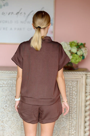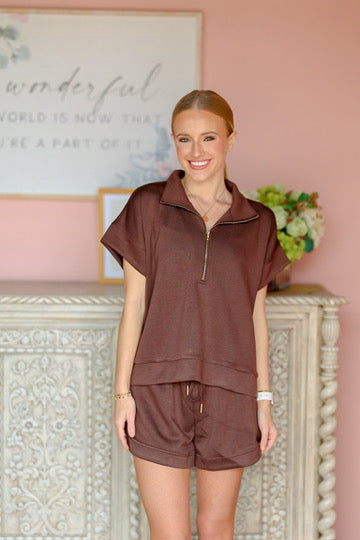 This espresso brown lounge set is the perfect blend of comfort and elevated style. Made with a smooth, soft-touch material, it features a quarter zip pullover accented with a sleek gold zipper that adds just the right amount of shine. The relaxed fit pairs effortlessly with the matching shorts, designed with an easy, comfortable silhouette for all-day wear. Chic yet laid-back, this set is ideal for lounging at home or stepping out in casual style.