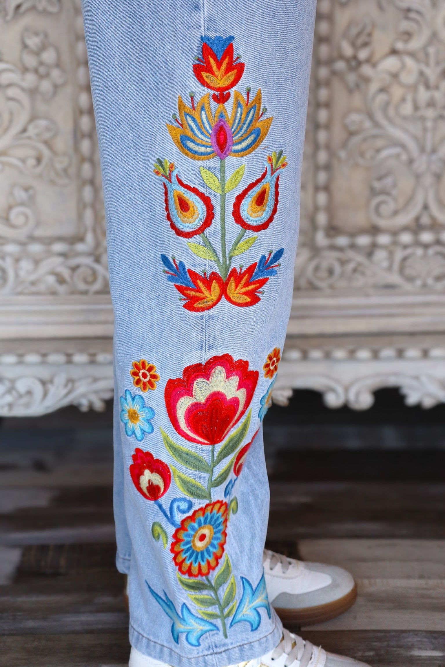 These light-wash denim jeans feature a relaxed, straight-leg fit with a flattering high-rise waist. They’re detailed with vibrant, colorful floral embroidery throughout, adding a bold, eye-catching statement to the soft denim. The wide-leg silhouette gives them an effortless, trendy feel while still keeping the look feminine and fun.