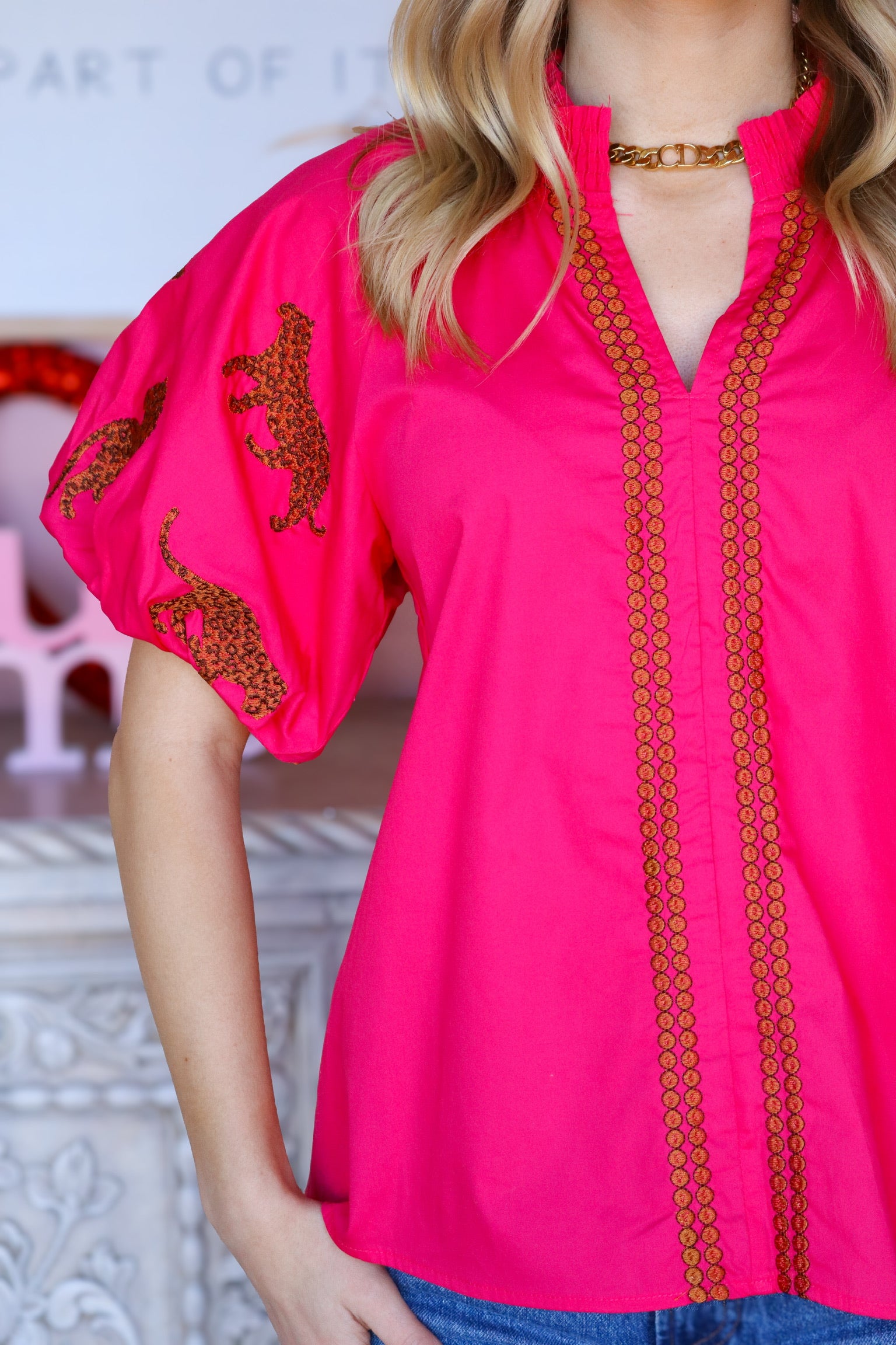 This bold hot pink top makes a striking statement with its vibrant color and playful cheetah-print accents. The cheetah pattern runs along the sleeves and down the front, adding an edgy, trendy contrast to the bright pink base. It’s a fun, fashion-forward piece that combines wild print with vibrant color for an eye-catching look