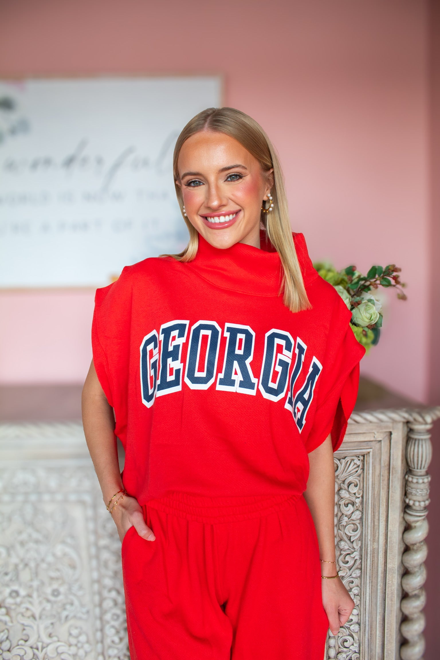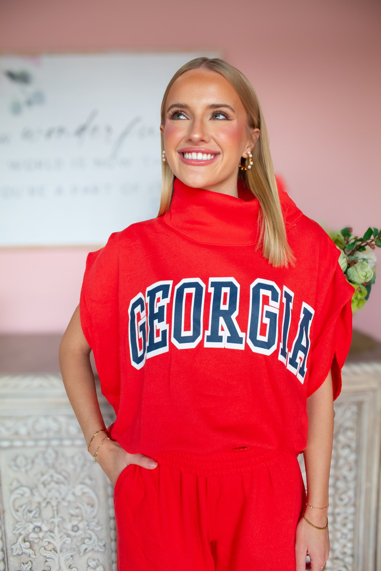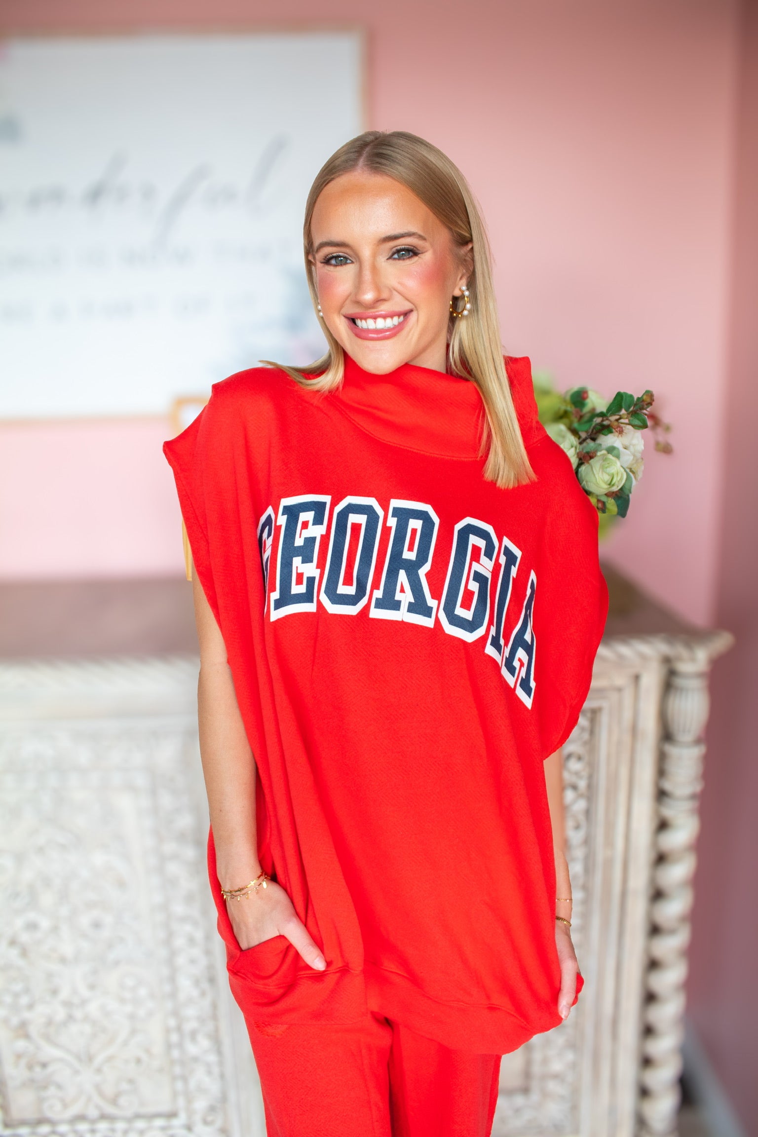 Show your Bulldog pride in style with this bold red mock neck sweater. Featuring “Georgia” lettering across the front, it’s cozy yet polished, perfect for game days, tailgates, or casual wear. The mock neck adds a modern touch while keeping you warm and spirited.