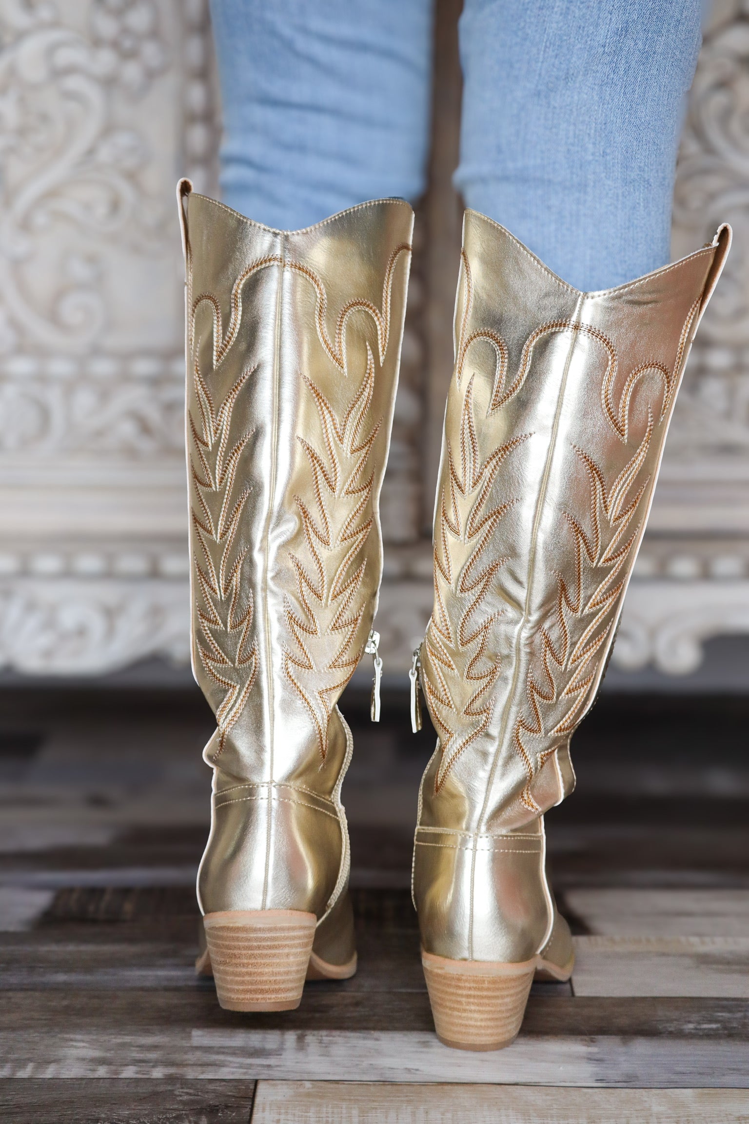 Shine bright in these gold cowgirl boots. Featuring a striking metallic finish and classic western stitching, they blend bold glamour with timeless country charm. Perfect for concerts, nights out, or adding a little sparkle to your everyday style, these boots are made to stand out with every step.