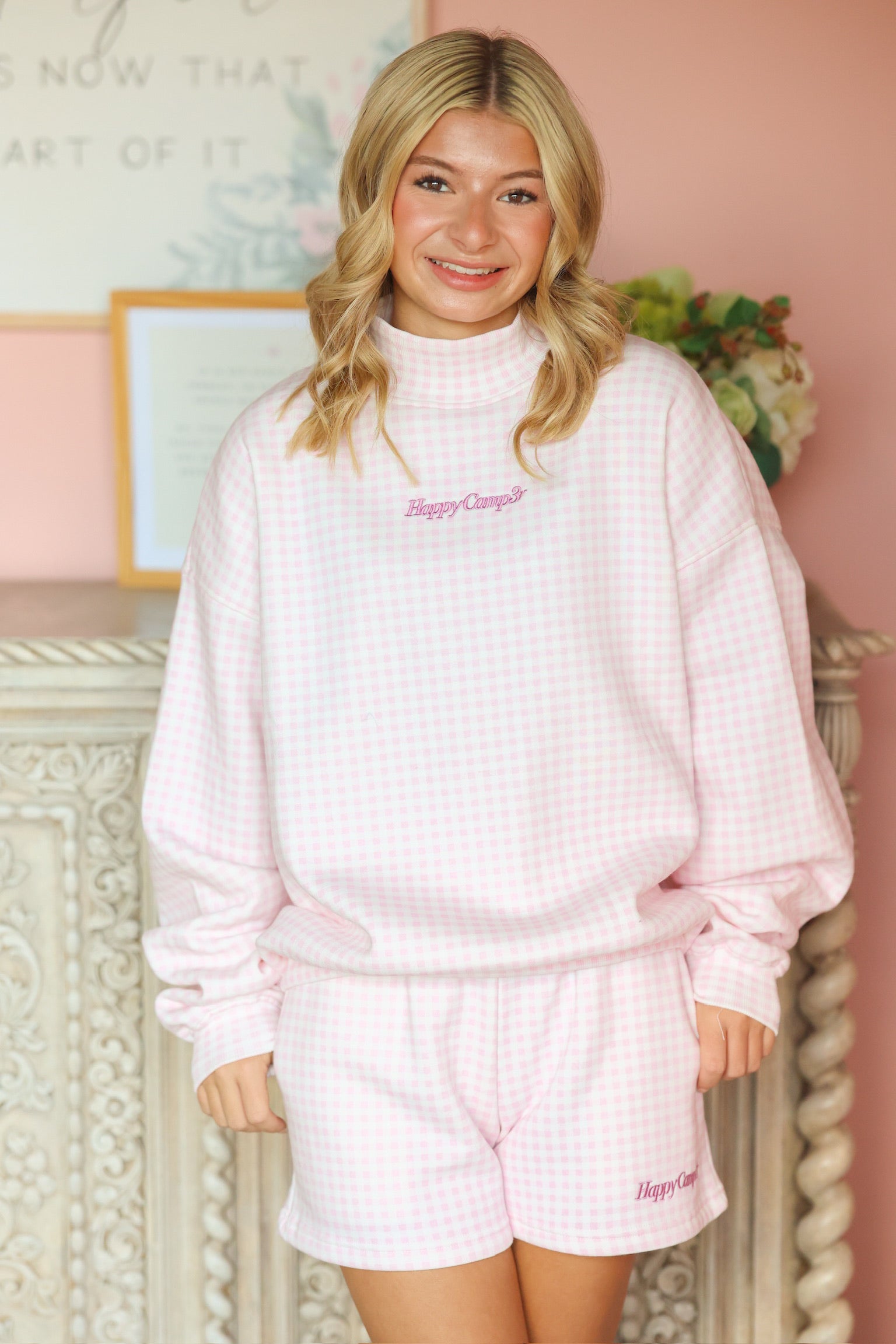 The Happy Camper Pink and White Checkered Shorts are fun, comfy, and perfect for laid-back days. Featuring a bold pink and white checkered pattern and a playful "Happy Camper" graphic, these shorts bring a cheerful, outdoorsy vibe to your look. The soft, lightweight fabric and elastic waistband ensure a relaxed fit that's ideal for lounging, sleep, or casual adventures. Pair them with the matching sweatshirt for the ultimate cozy-cute set.