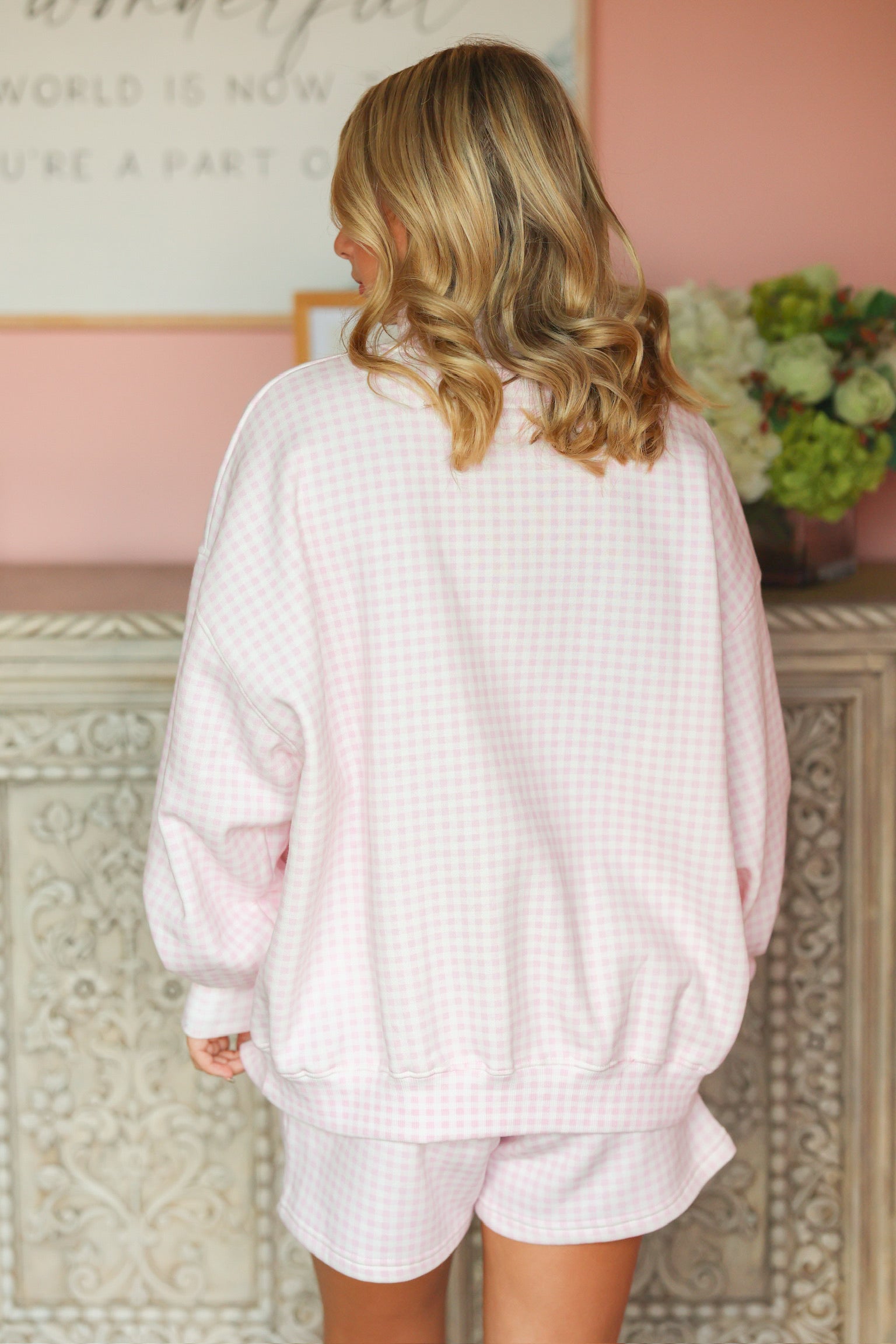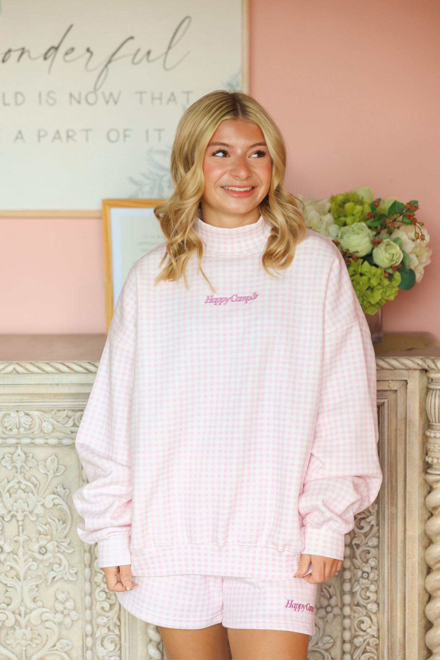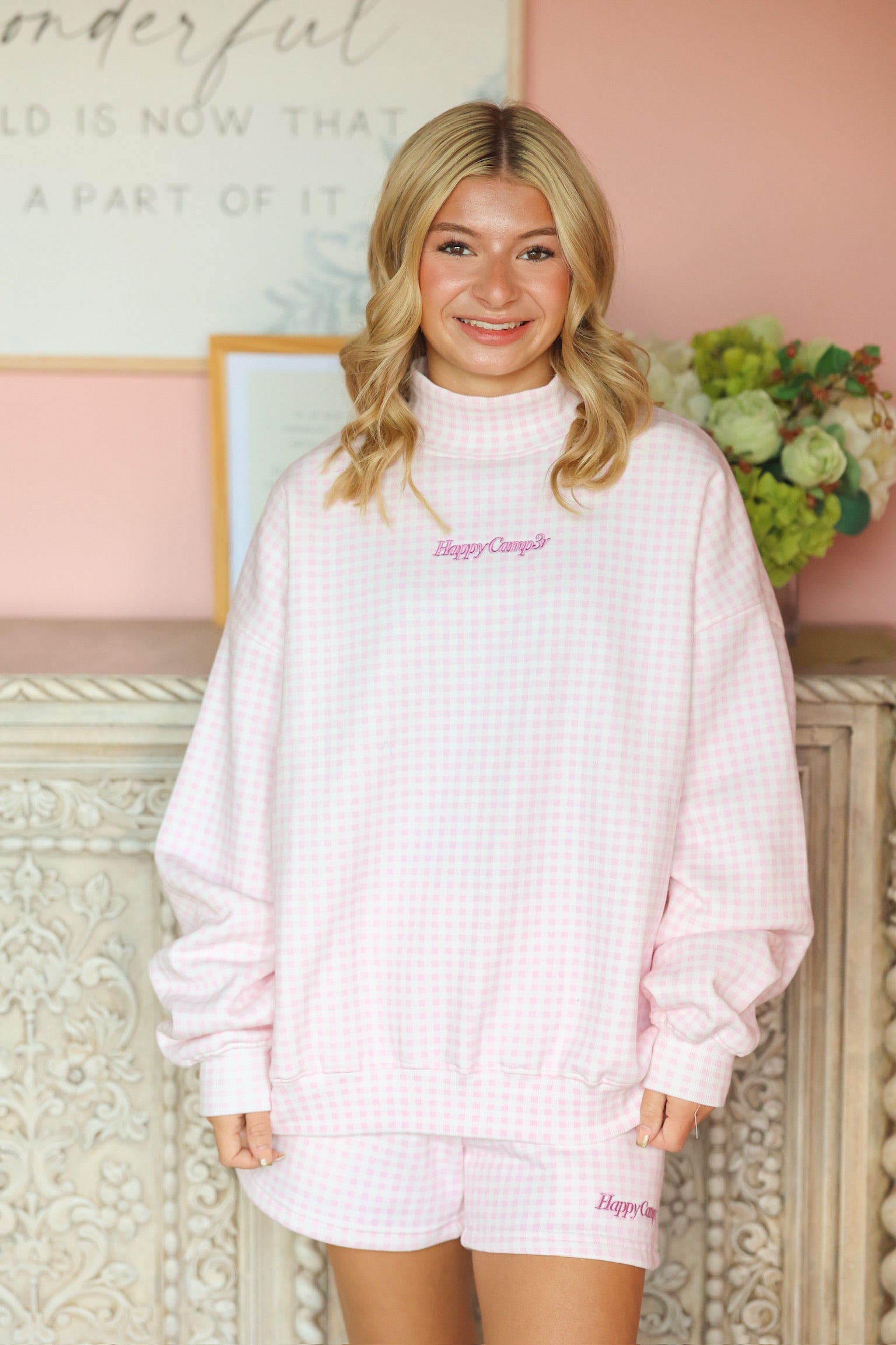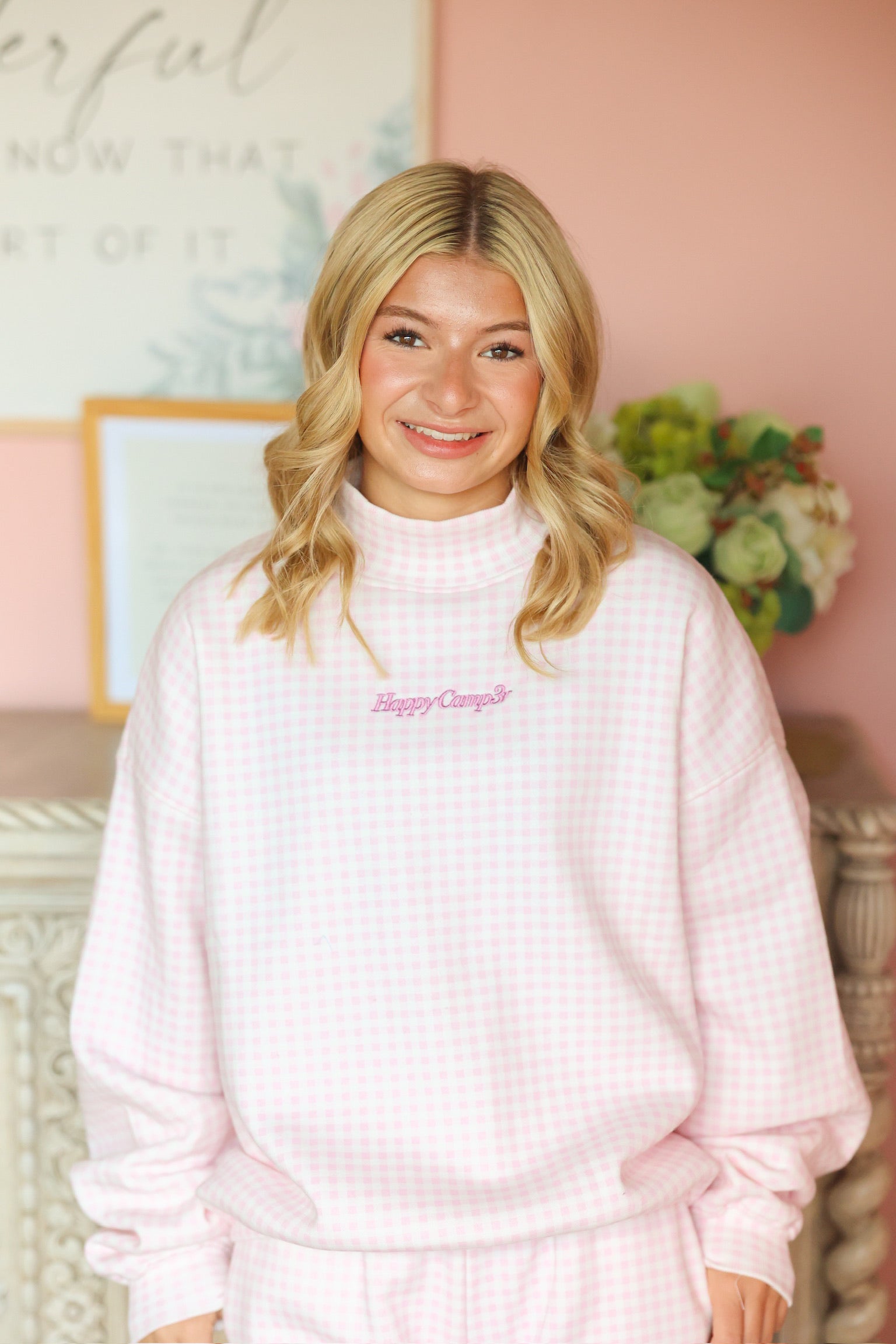 The Happy Camper Pink and White Checkered Sweatshirt is playful, cozy, and full of feel-good vibes. Featuring an allover pink and white checkered pattern, this sweatshirt stands out with its bold, cheerful style. The "Happy Camper" graphic adds a fun, outdoorsy touch, perfect for those who love adventure or just cozy nights in. Made from soft, fleece-lined fabric with a relaxed fit, it’s the ultimate comfy-cute piece for laid-back days.