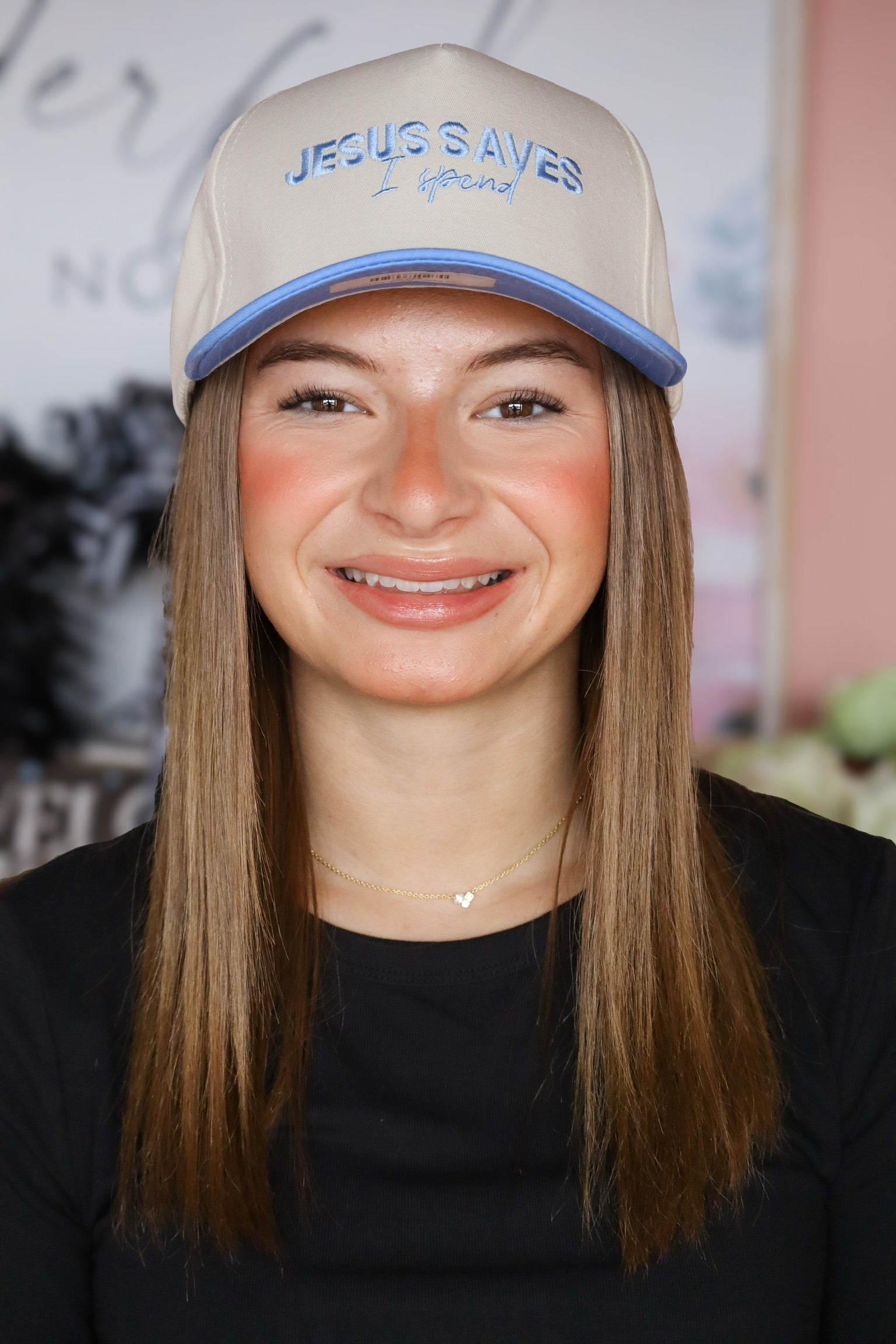 The hat is a classic white trucker style with a breathable mesh back and a structured front panel. Across the front, in playful baby blue script, the phrase “Jesus Saves, I Spend” stands out, blending humor with a touch of irony. The curved brim adds a vintage vibe, while the adjustable snapback ensures a comfortable fit. This hat makes a bold, tongue-in-cheek statement that's both stylish and thought-provoking.
