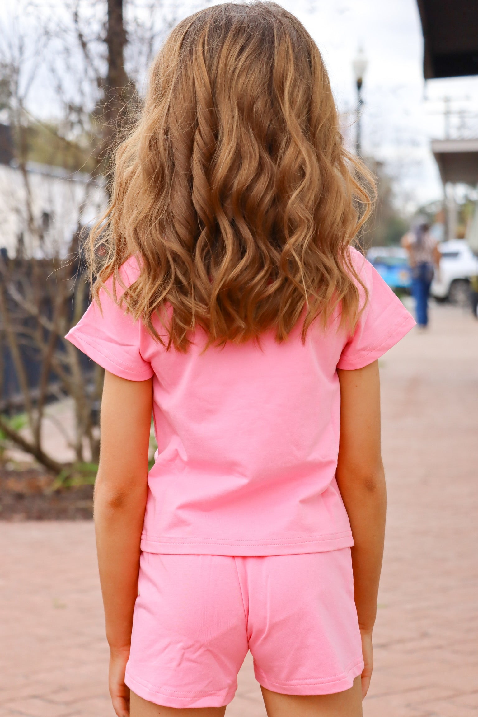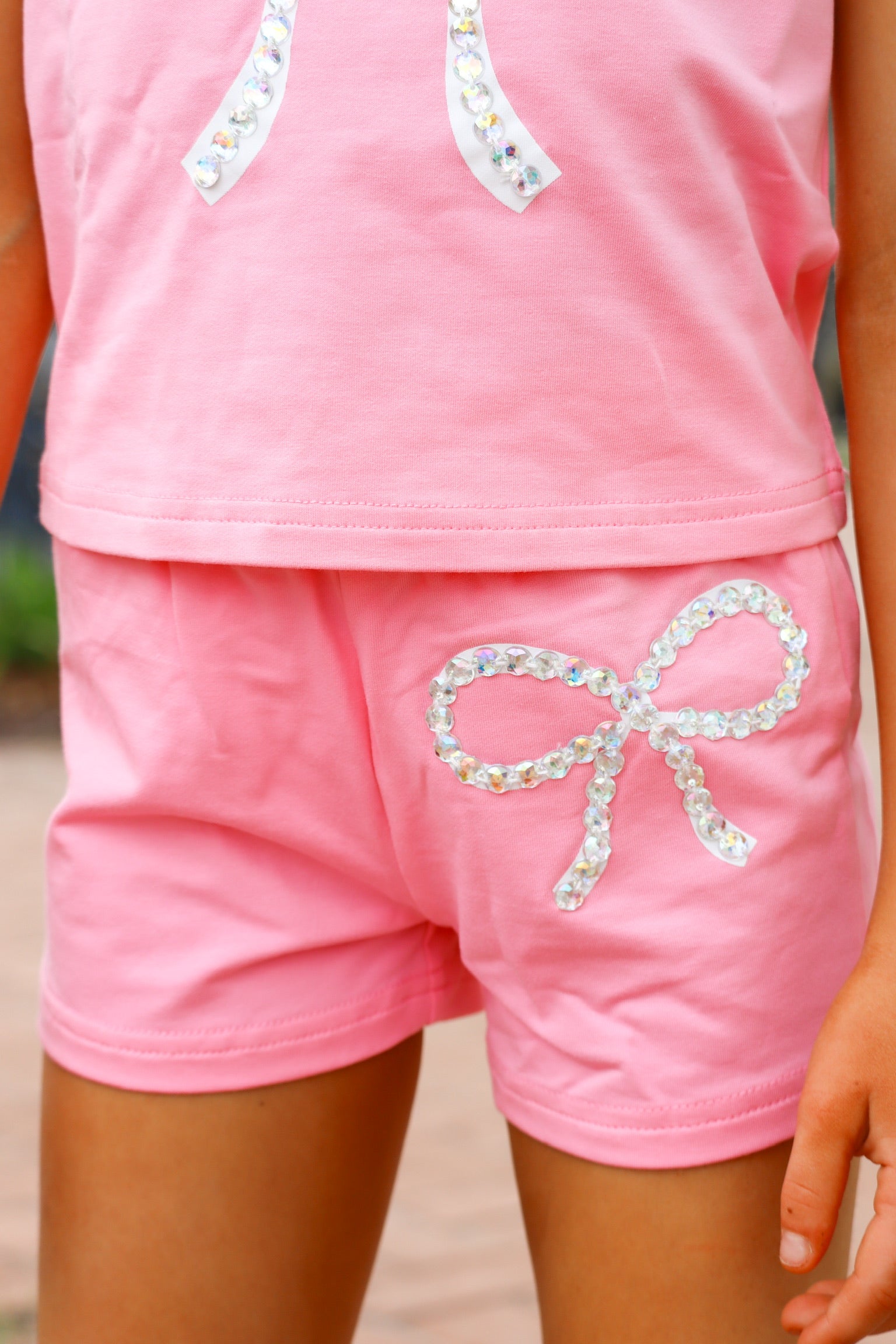 This adorable pink two-piece set is the perfect mix of sweet and stylish. The soft pink short-sleeve top features a sparkling rhinestone bow across the front, adding just the right amount of shine. Paired with matching pink shorts that showcase a coordinating rhinestone bow detail, this set creates a fun and polished look. Comfortable, cute, and easy to wear, it’s perfect for playdates, outings, or any day she wants to shine.