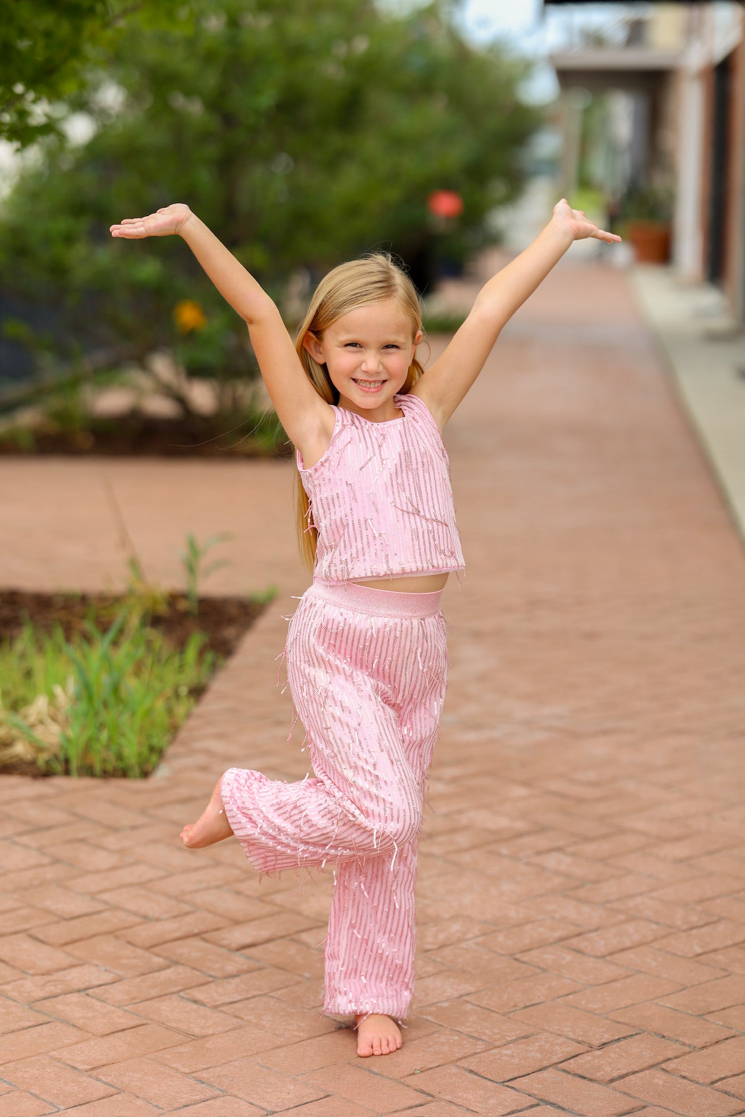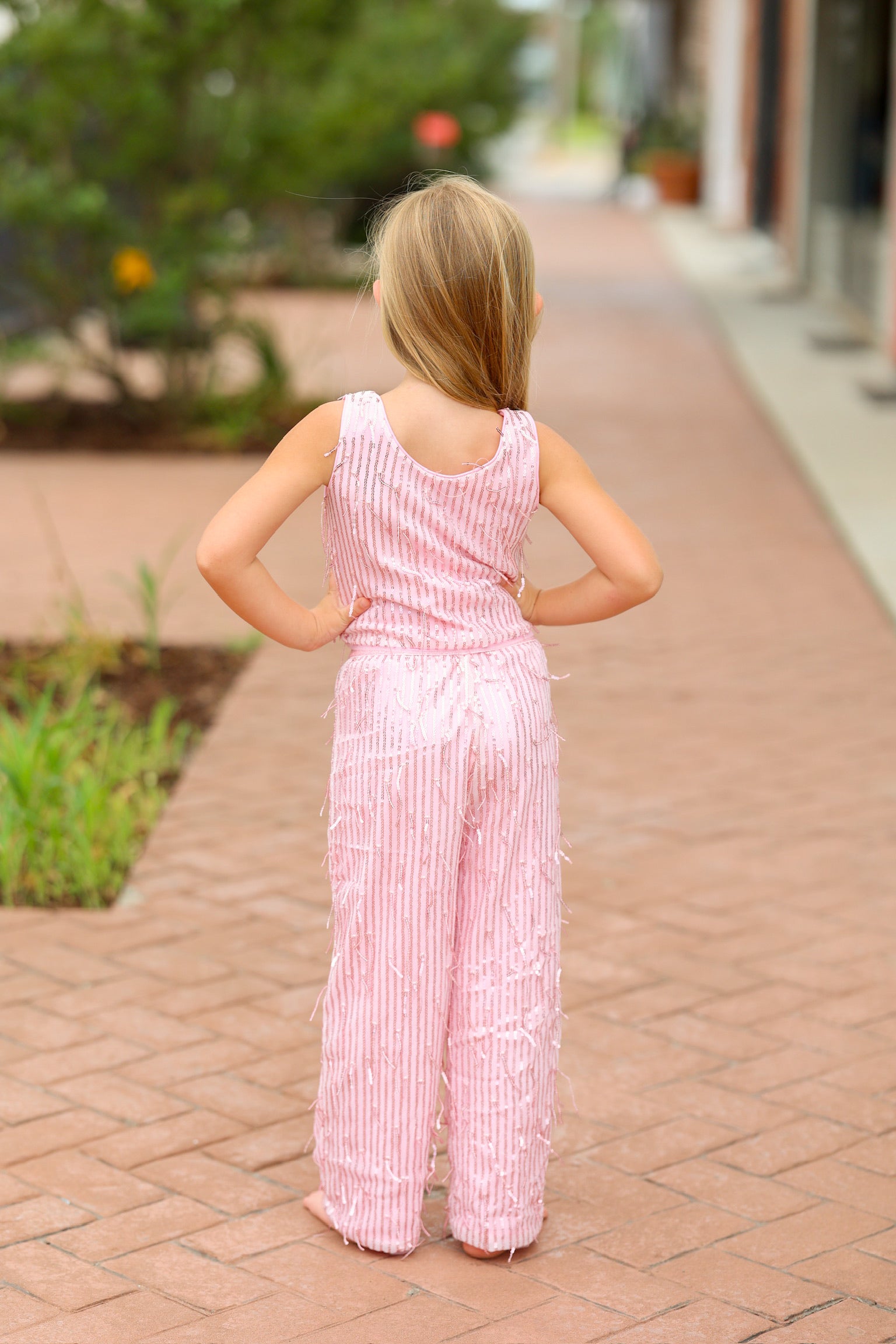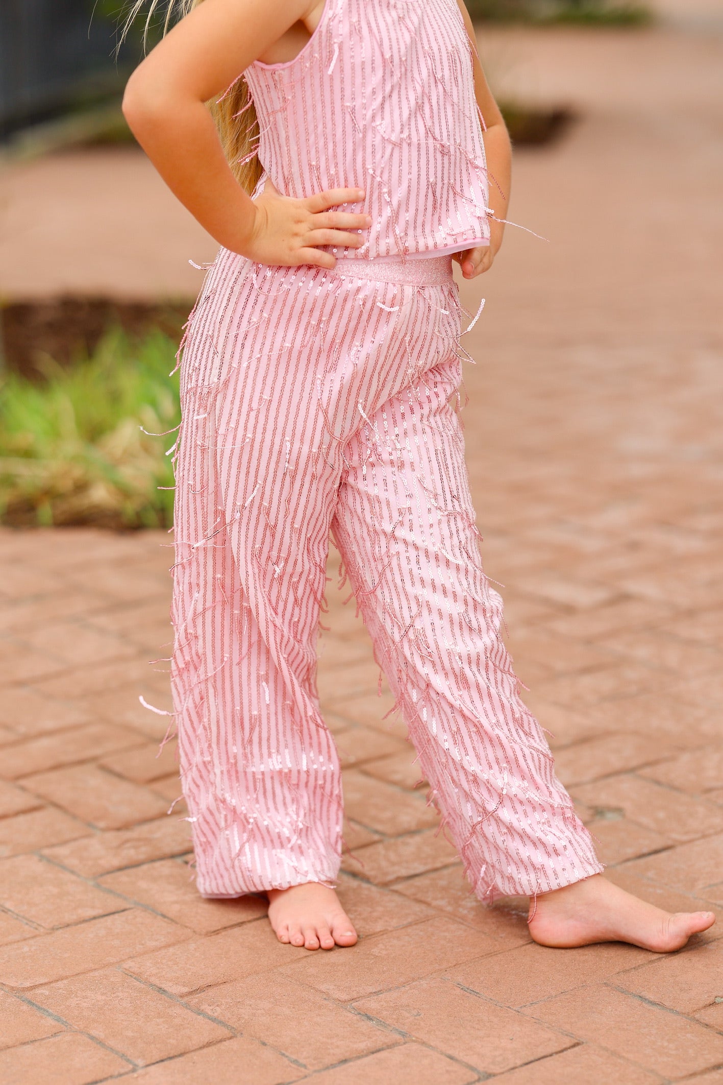 This pink kids top and pants set is full of fun and flair, featuring playful fringe all over that adds movement and texture to every step. Made from soft, comfortable fabric, the set combines cozy wearability with eye-catching style. Perfect for dress-up, parties, or any time your little one wants to stand out, this fringed outfit brings energy and charm to their wardrobe.