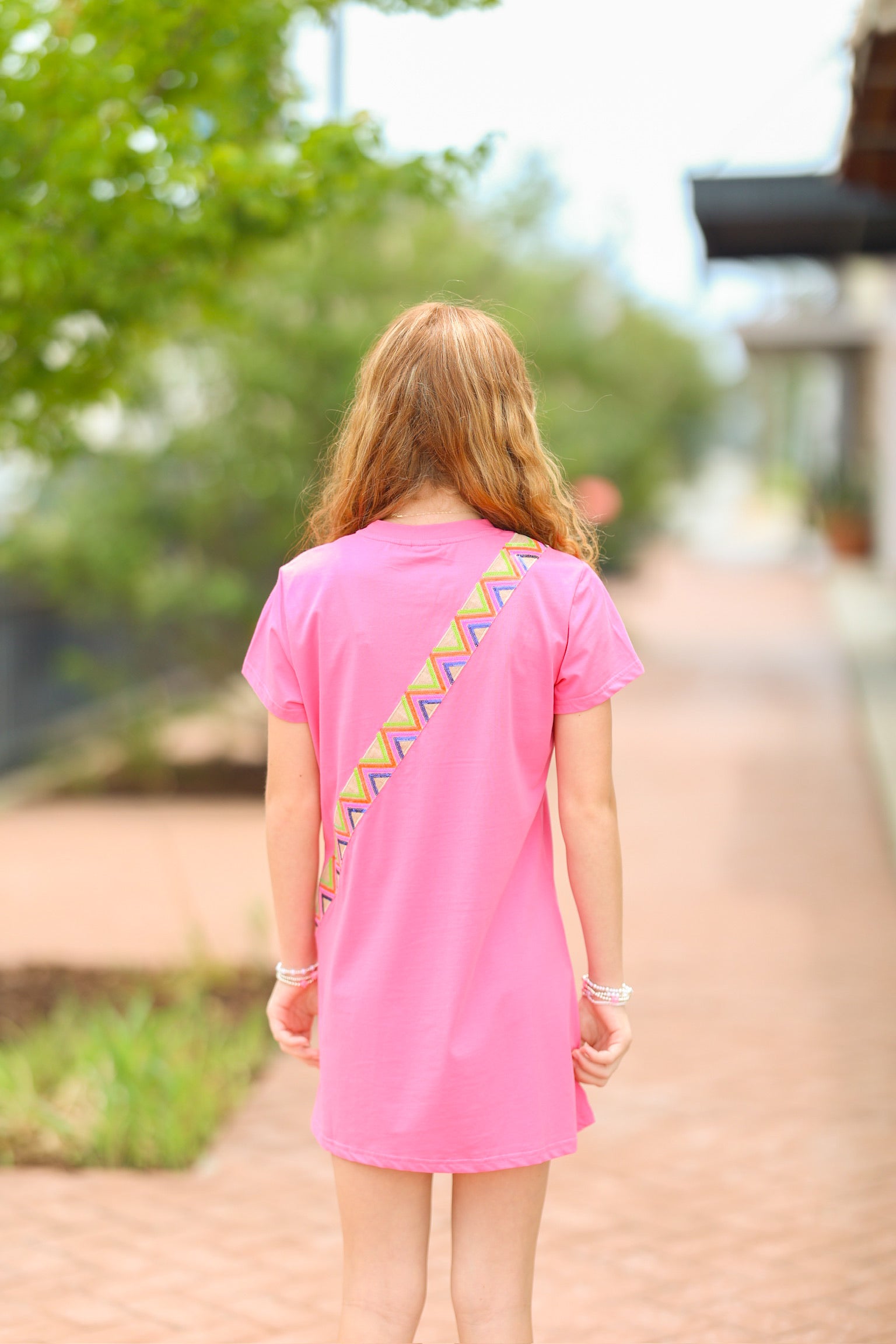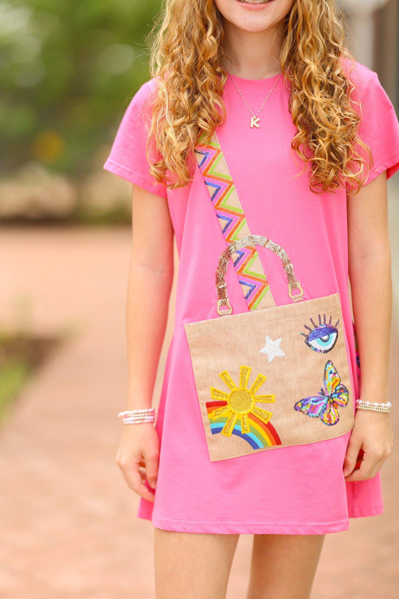 Turn heads in this playful and unique pink Queen of Sparkles dress, featuring a standout purse detailing that adds a touch of charm and whimsy. The dress is designed with a flattering, relaxed fit and vibrant pink hue that radiates fun and femininity. Sequin accents highlight the purse motif, giving it a sparkly, fashion-forward flair. Whether you're heading to brunch or a themed party, this dress brings personality and shine to any look.