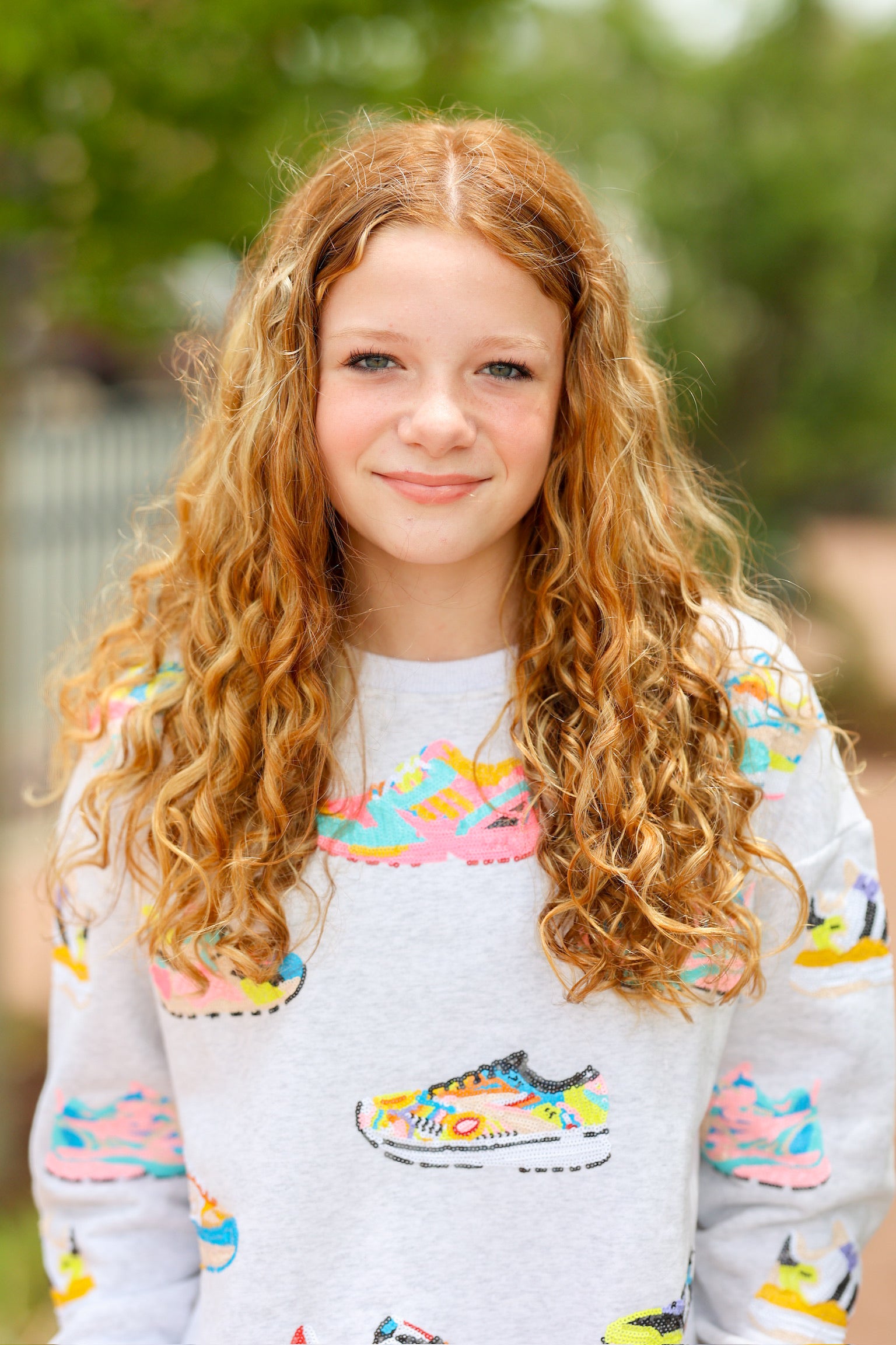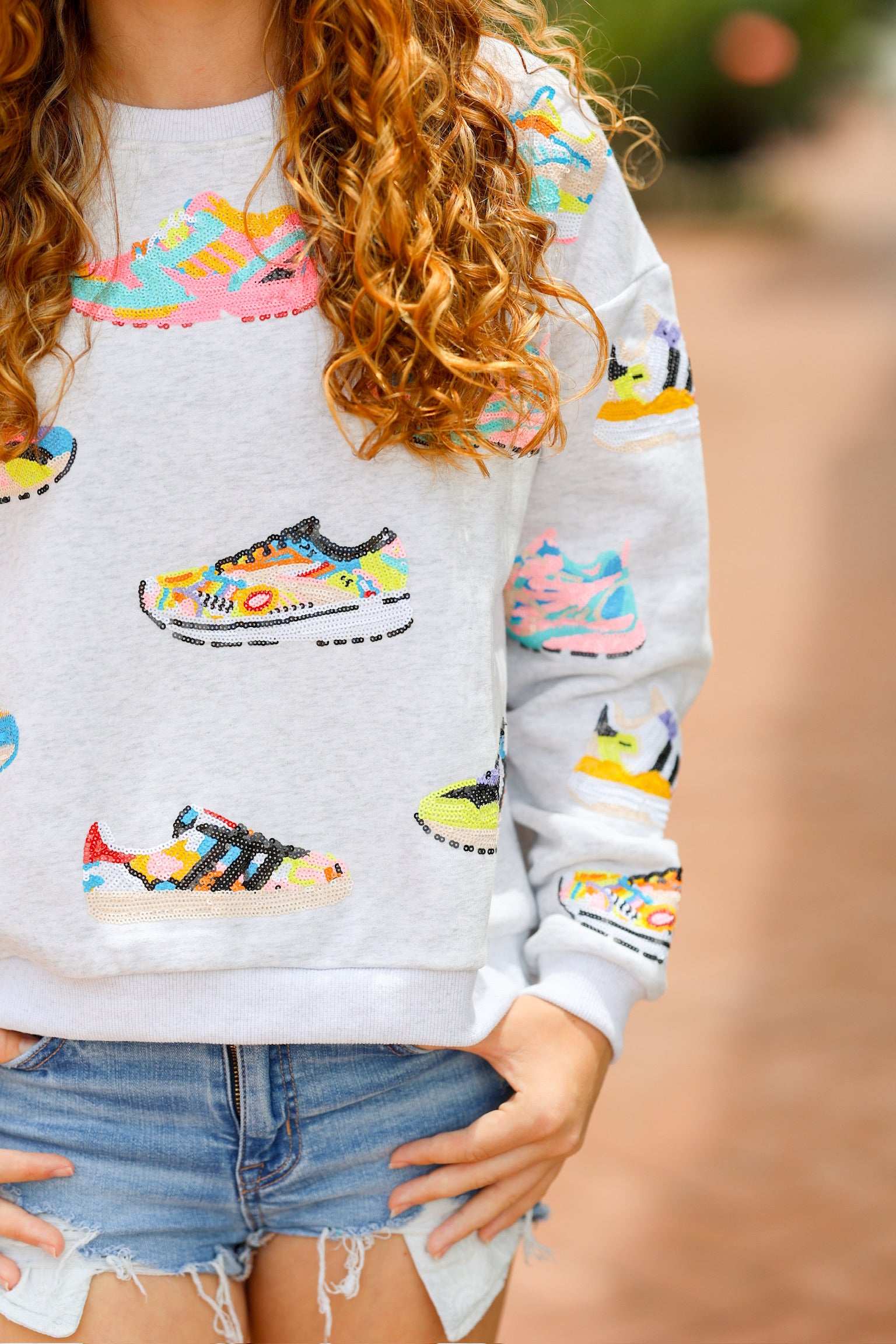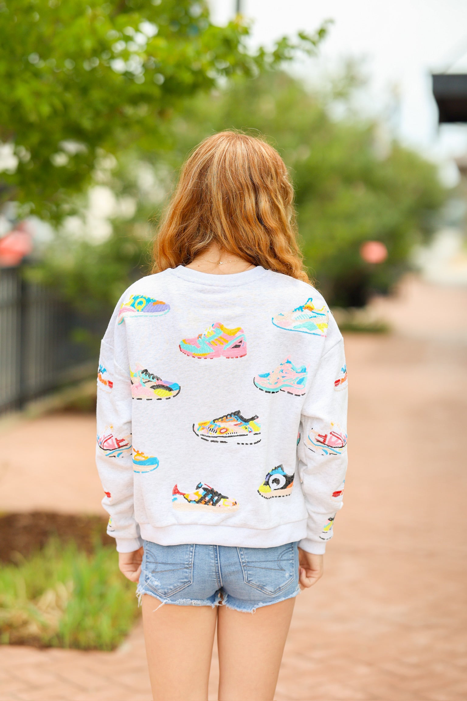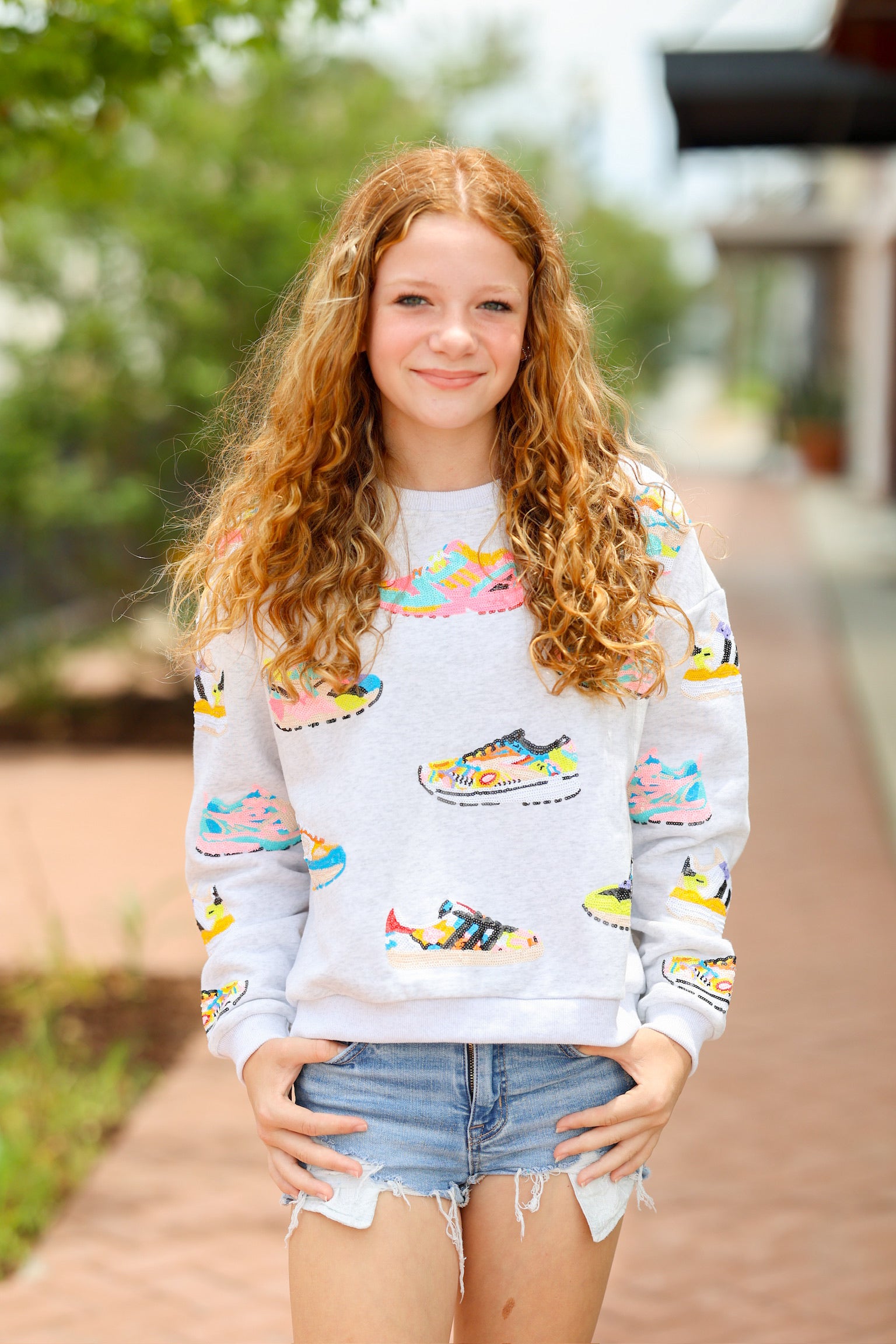 This grey Queen of Sparkles kids sweatshirt is full of playful personality, featuring colorful sequin sneakers scattered all over. The fun, eye-catching design adds a bold pop of color to the soft, neutral base. Cozy and comfortable, it’s perfect for staying warm while standing out in style. Whether it’s for school, playdates, or just everyday fun, this sweatshirt brings sparkle and energy to any look.