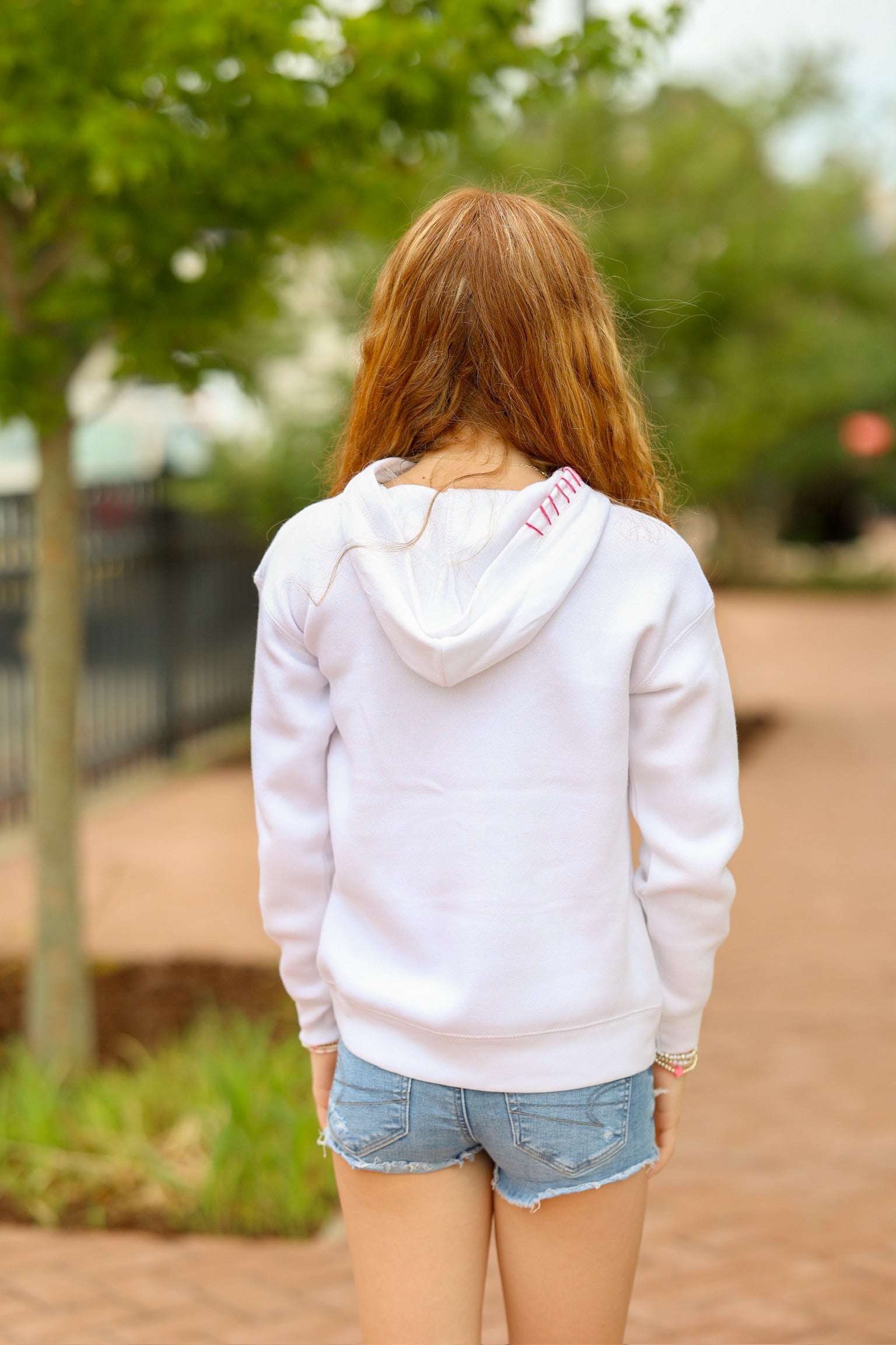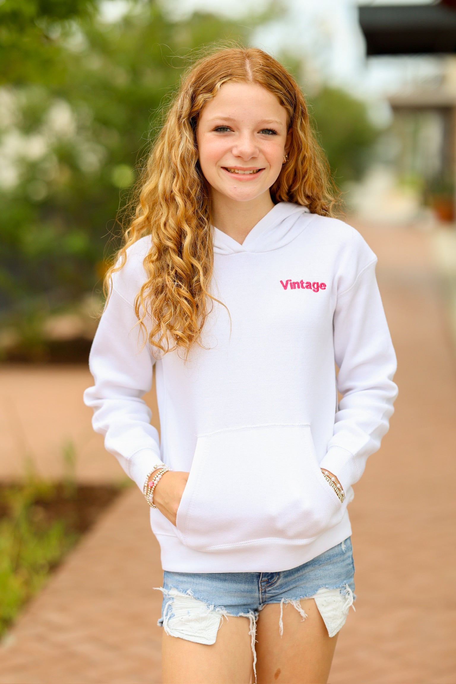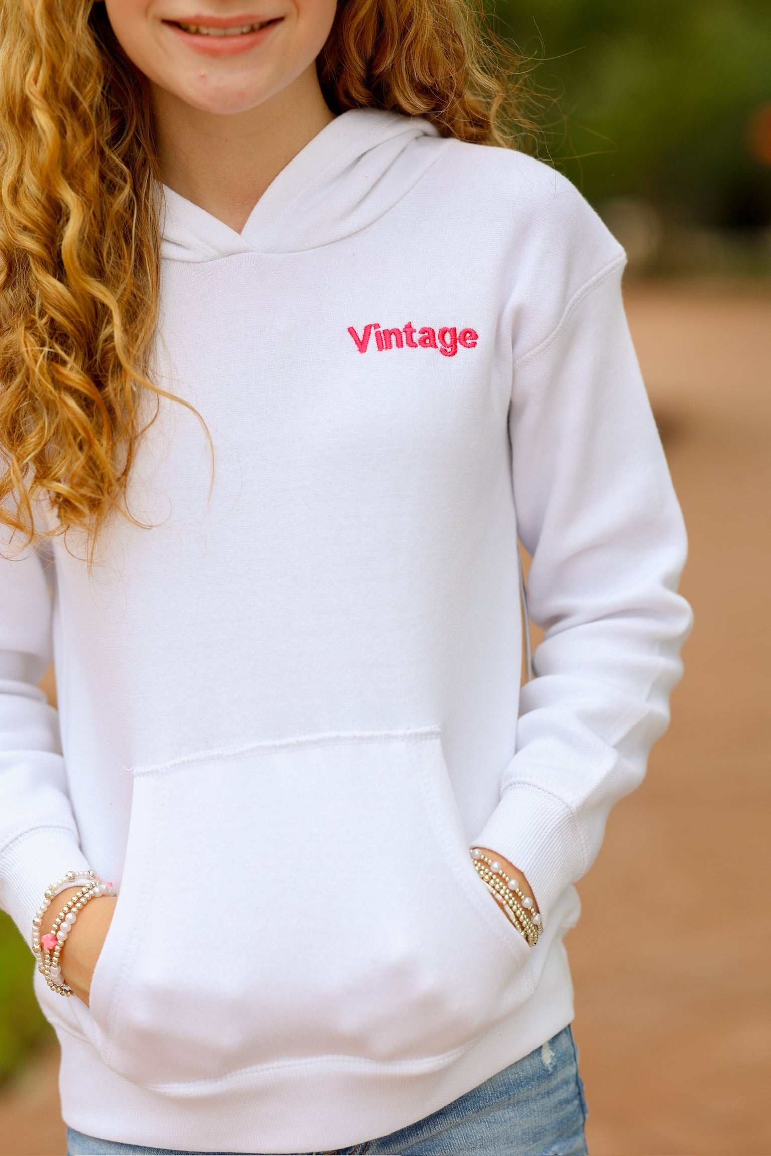 This white kids hoodie blends classic comfort with a touch of retro flair. Featuring the word "vintage" stitched in soft pink on the top side, it adds a stylish and playful detail to the clean, cozy design. Made from soft, warm fabric, it's perfect for layering on cooler days. The relaxed fit and subtle pop of color make it a go-to piece for both comfort and charm.