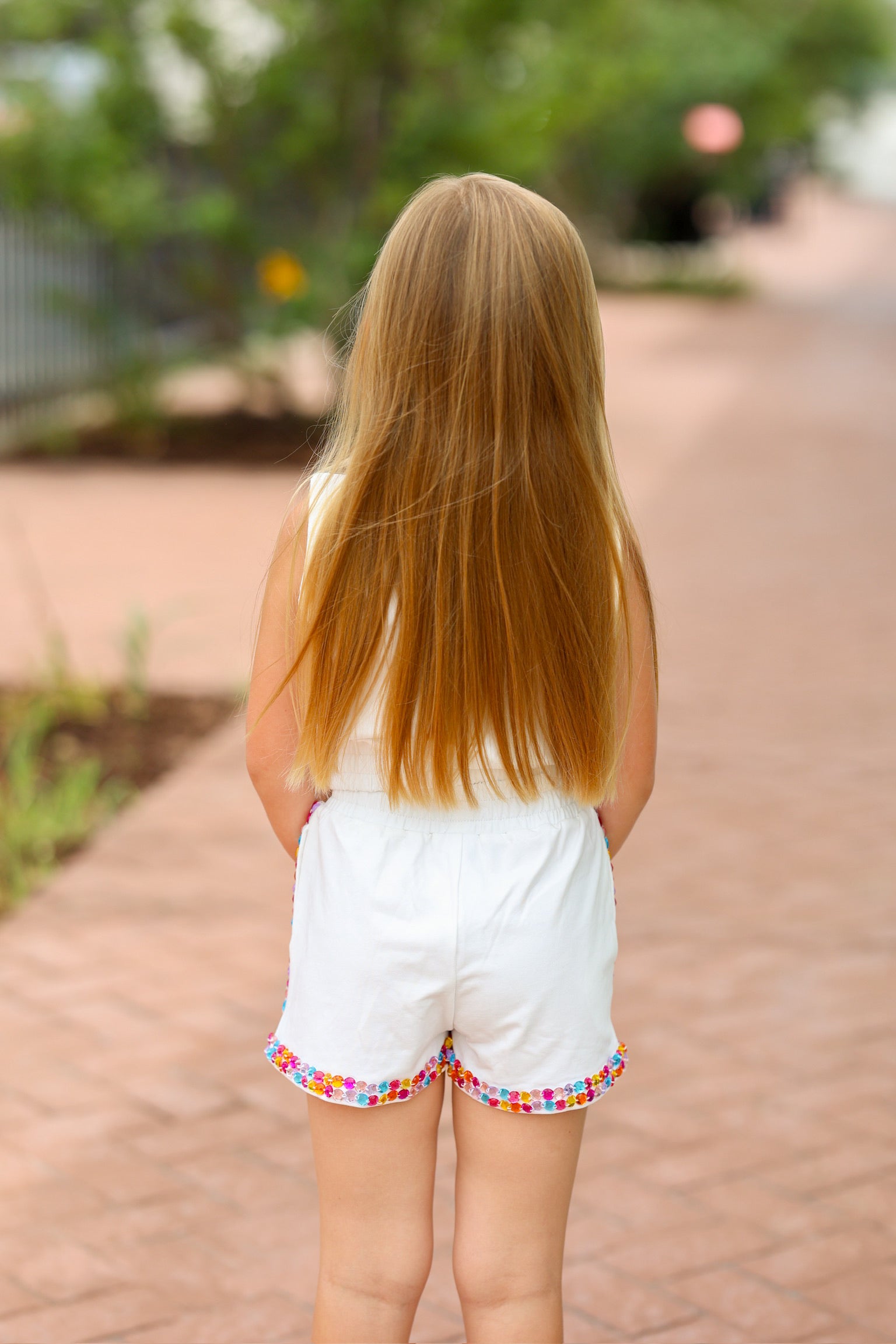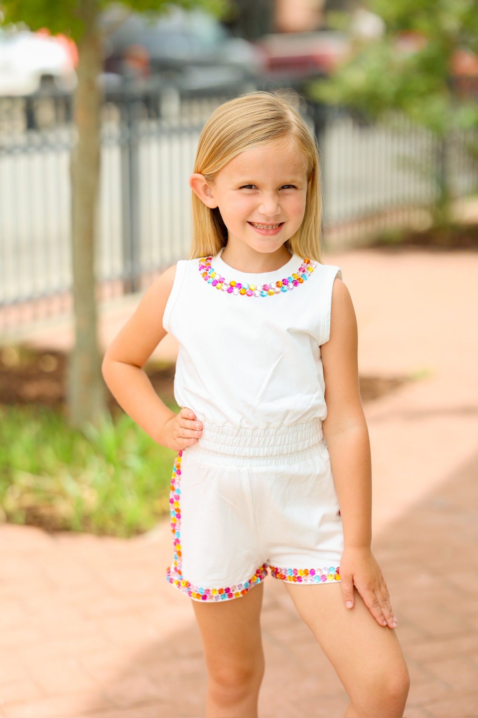 This white kids tank and shorts set shines with colorful fun, featuring sparkling rainbow jewels running down the sides of both pieces. Made from soft, breathable fabric, it offers all-day comfort and easy movement for active play. The bright jewels add a playful pop of color and sparkle, making this set perfect for sunny days, parties, or anywhere your little one wants to stand out with vibrant style.