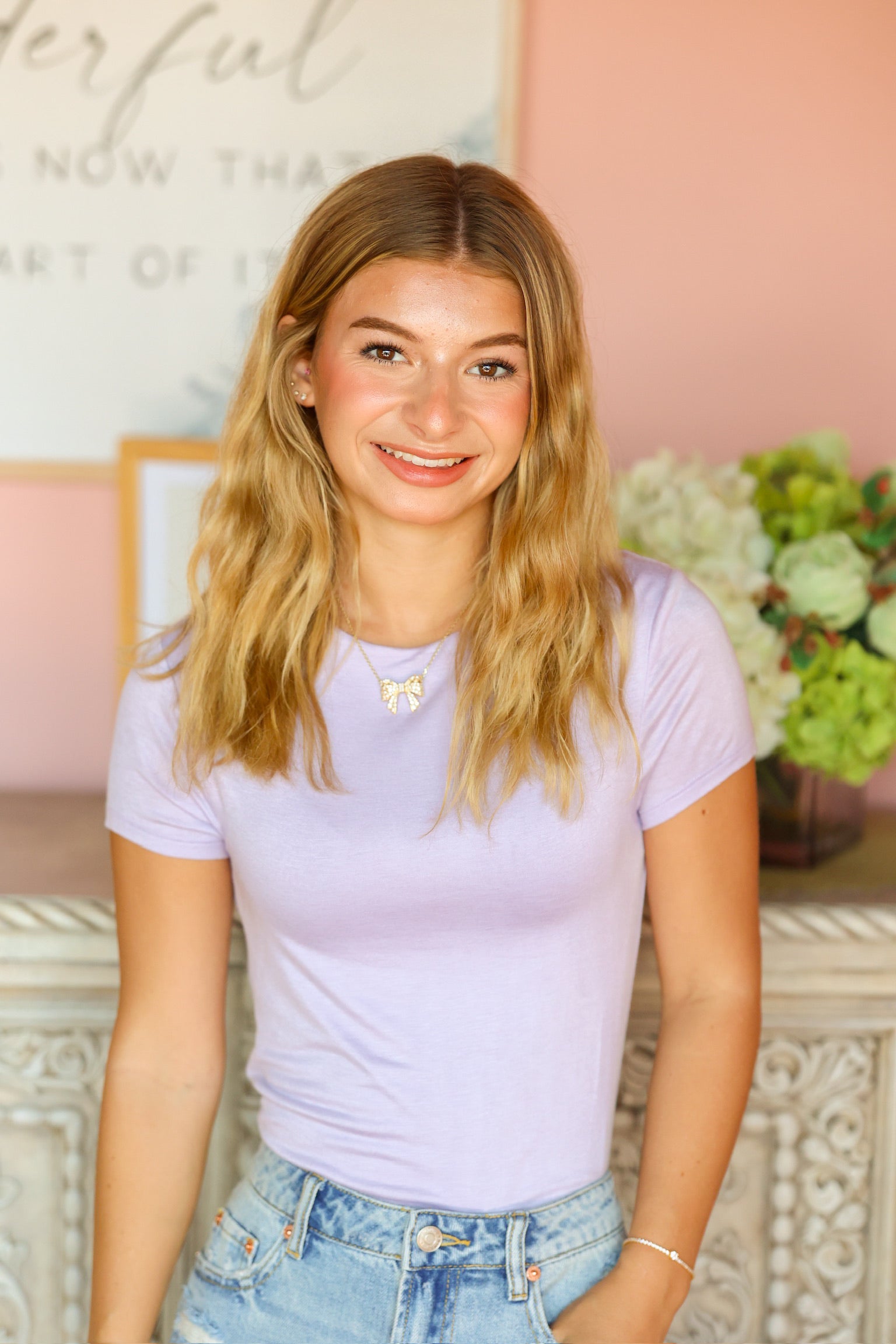 This lavender bodysuit is sleek and stylish with a soft, feminine touch. Crafted from smooth, stretchy fabric, it hugs the body for a flattering, seamless fit. The gentle lavender shade adds a calming pop of color, perfect for both casual and dressier looks. Designed to tuck effortlessly into skirts, pants, or shorts, it’s a versatile piece that blends comfort and elegance with ease.