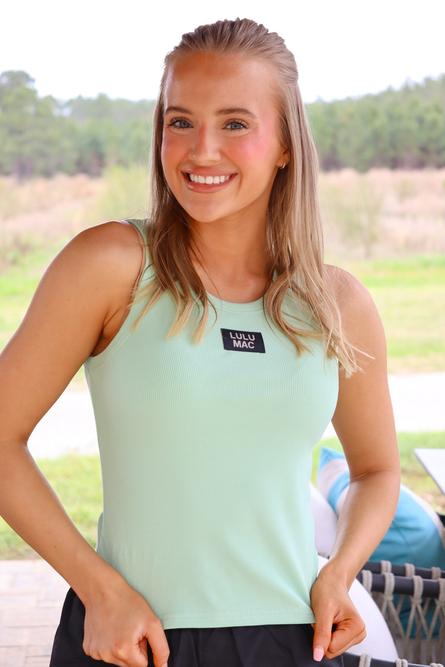 A mint green ribbed tank top featuring a flattering fitted silhouette and classic crew neckline. The soft, stretchy fabric provides all-day comfort while keeping a sleek, sporty look. Finished with a small LULU MAC logo detail at the center chest for a simple branded touch.