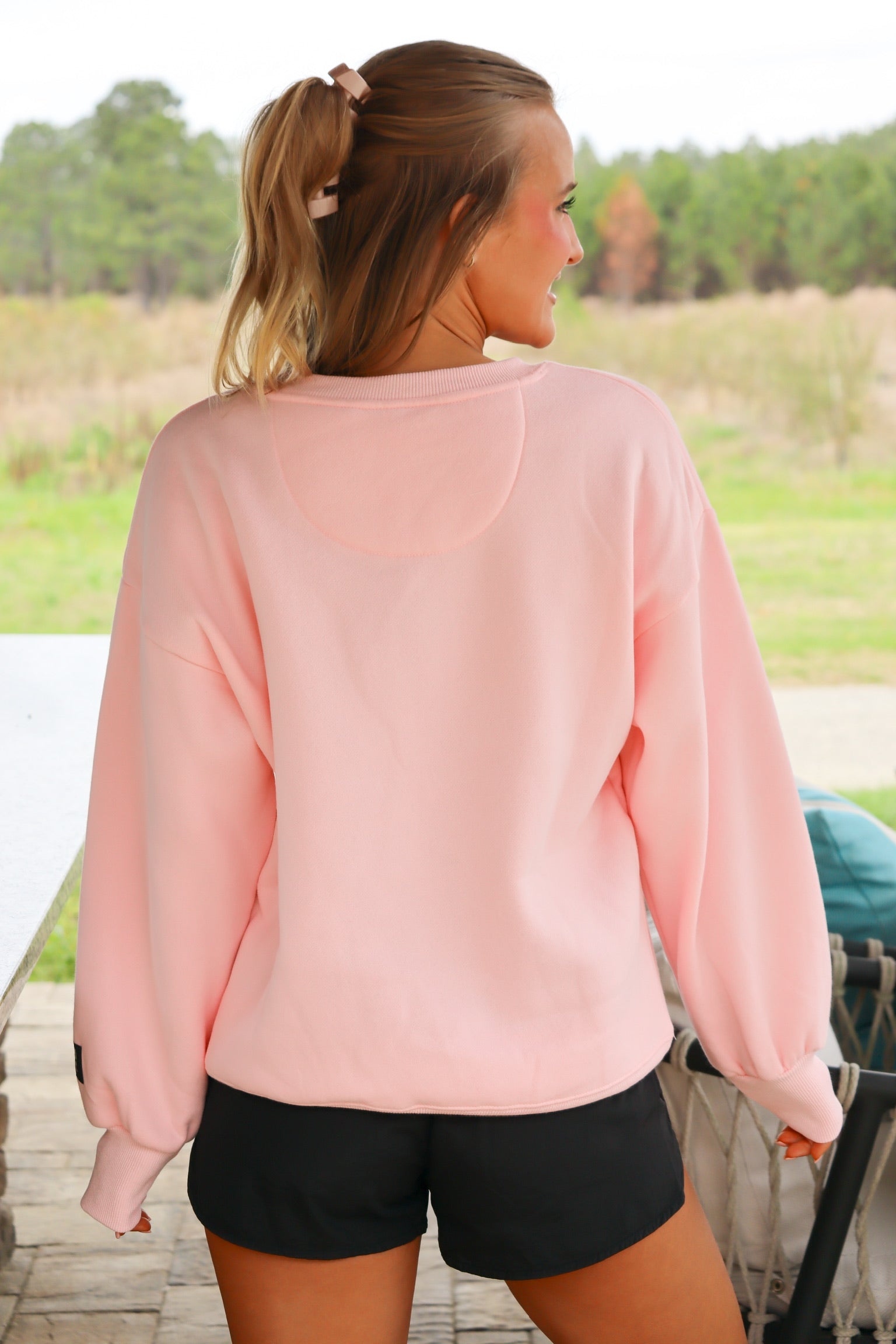 A light pink oversized crewneck sweatshirt featuring bold collegiate-style “LULUMAC” lettering in a tan and black leopard print. Designed with a relaxed fit, dropped shoulders, and ribbed cuffs for a cozy, comfortable feel.