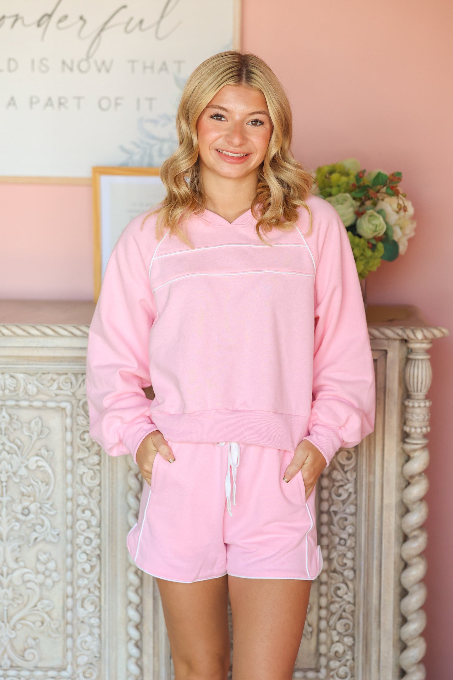 This pink and white sweatshirt and short set is the ultimate combo of cozy and cute. The sweatshirt features a relaxed, slightly oversized fit adding a fun, sporty vibe. The matching shorts have a comfortable elastic waistband and a flattering, easy-going cut perfect for lounging or casual outings. Made from plush, lightweight fabric, this set keeps you comfy while serving a fresh, laid-back look.