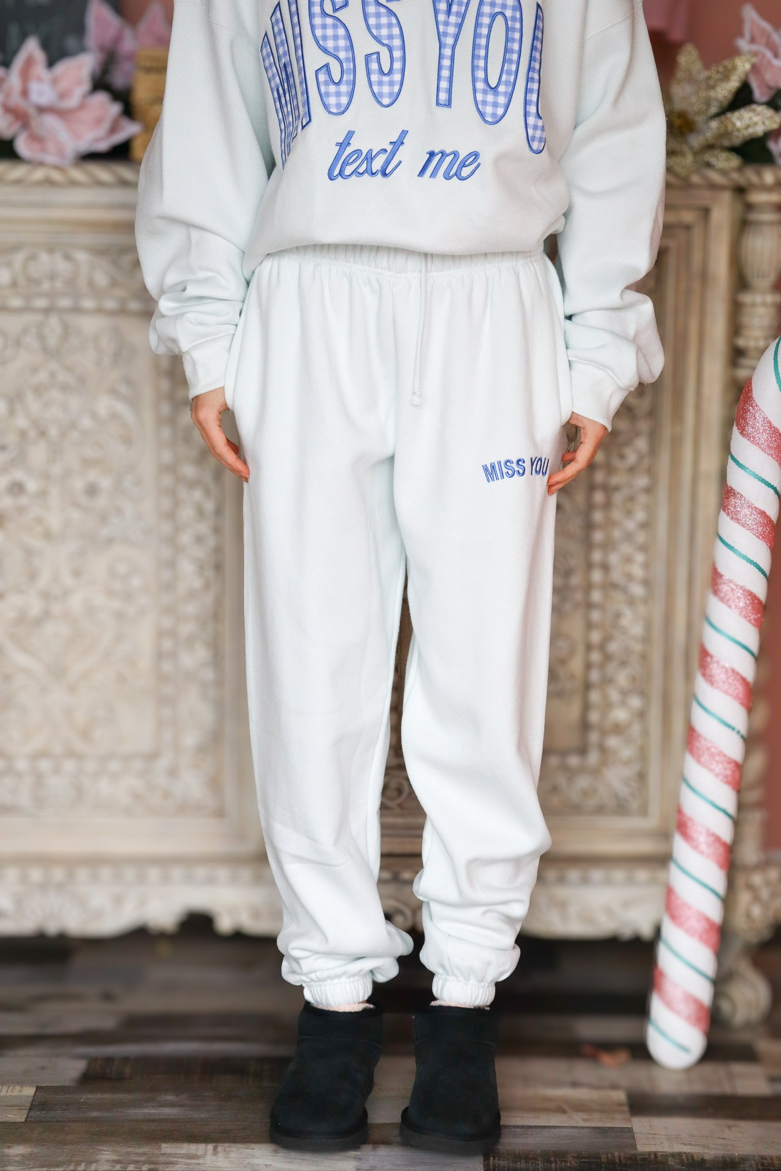 Cozy with a touch of cute, these joggers bring all the comfy vibes. Designed with a soft, breathable fabric and a relaxed fit, they’re perfect for lounging, errands, or pairing with the matching sweatshirt. The subtle “Miss You” graphic adds a flirty little detail that keeps things fun and stylish. Finished with an elastic waistband and cuffed ankles for that perfect stay-put feel—your new go-to lazy-day bottoms