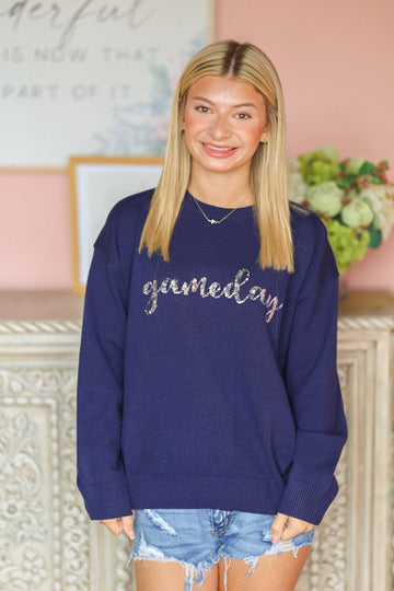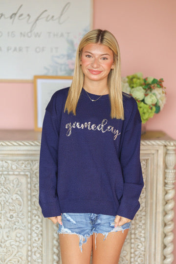 This navy and silver gameday sweater combines classic team colors with cozy comfort. Featuring a rich navy base accented by shimmering silver details and bold graphics, it offers a relaxed fit and soft knit fabric—ideal for staying warm and spirited during every game.