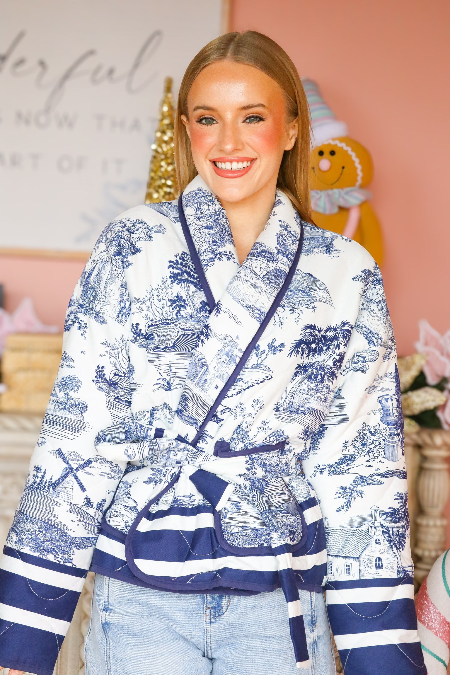 Elevate your look with this stunning navy and white jacket, featuring an elegant print. The intricate pattern adds a touch of timeless charm, while the lightweight, structured fit makes it perfect for layering. Dress it up with a blouse and trousers or keep it casual with a simple tee and jeans—either way, this piece brings effortless sophistication to any outfit. Classic, chic, and beautifully unique.