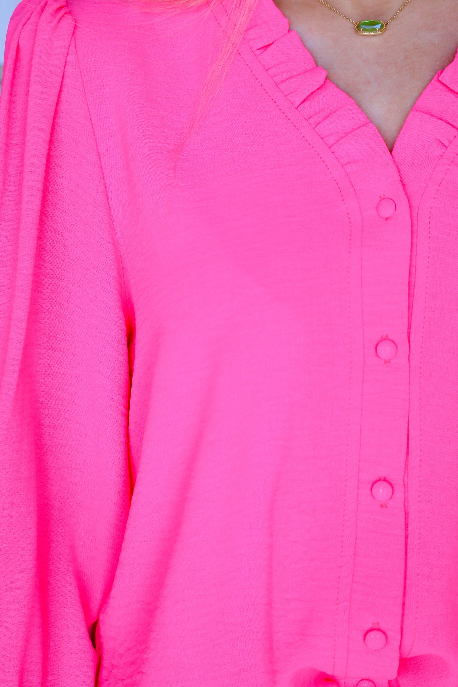 This top features a vibrant neon pink hue that instantly stands out. It has a loose, flowy silhouette that drapes effortlessly for a flattering and comfortable fit. The long sleeves are lightweight and airy, adding movement with every step, while the soft fabric gives it a breezy, relaxed feel. Perfect for dressing up with jeans or keeping it casual with shorts, this top makes a statement while staying easy and wearable.