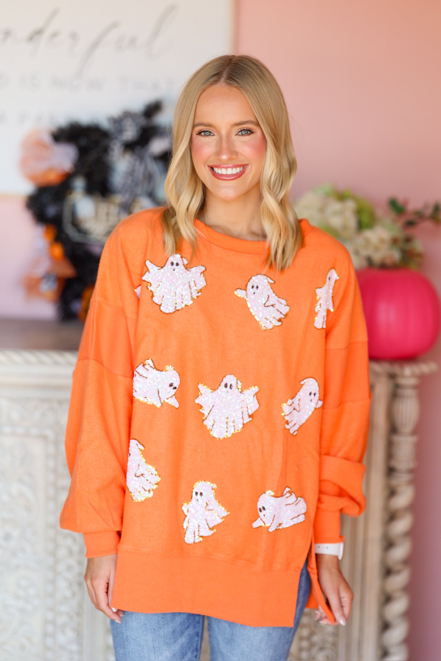 Get cozy and festive in this Orange Ghost Sweatshirt! With its bright pumpkin-orange base and playful ghost design, it’s the perfect mix of cute and spooky. Soft, comfy, and just right for fall nights, pumpkin patches, or Halloween fun.