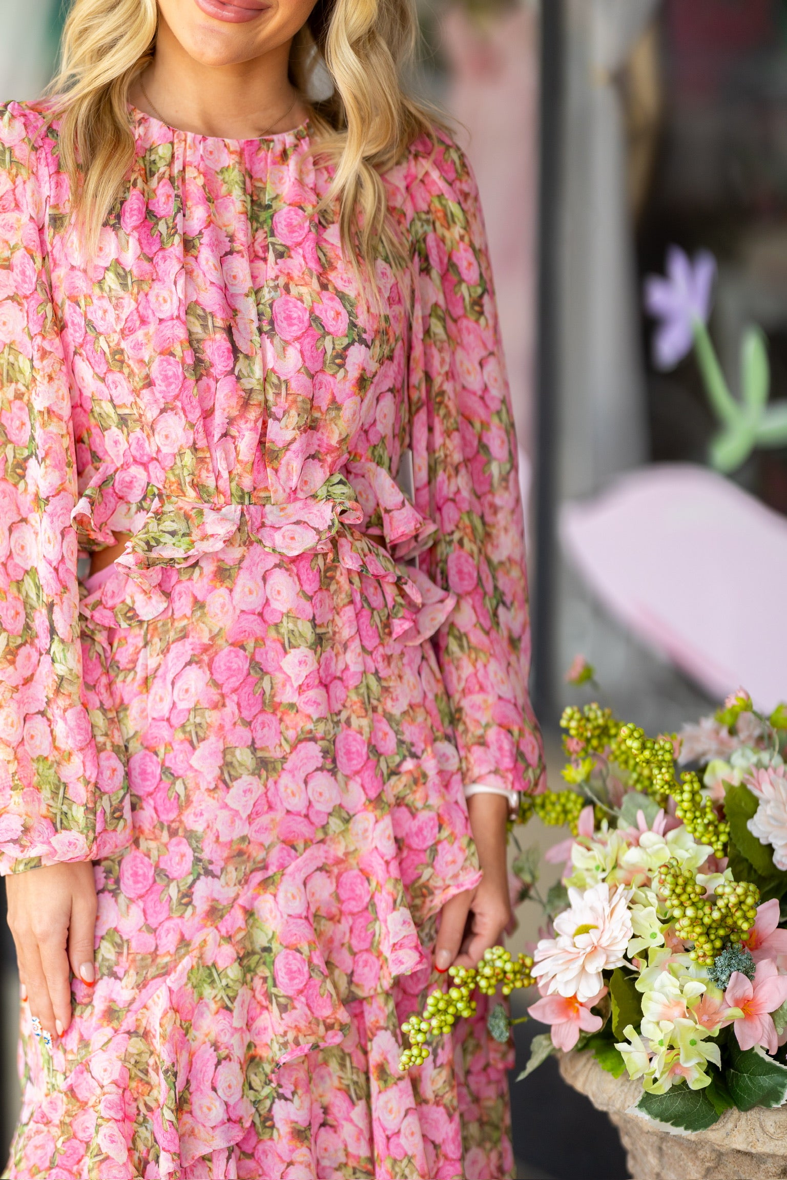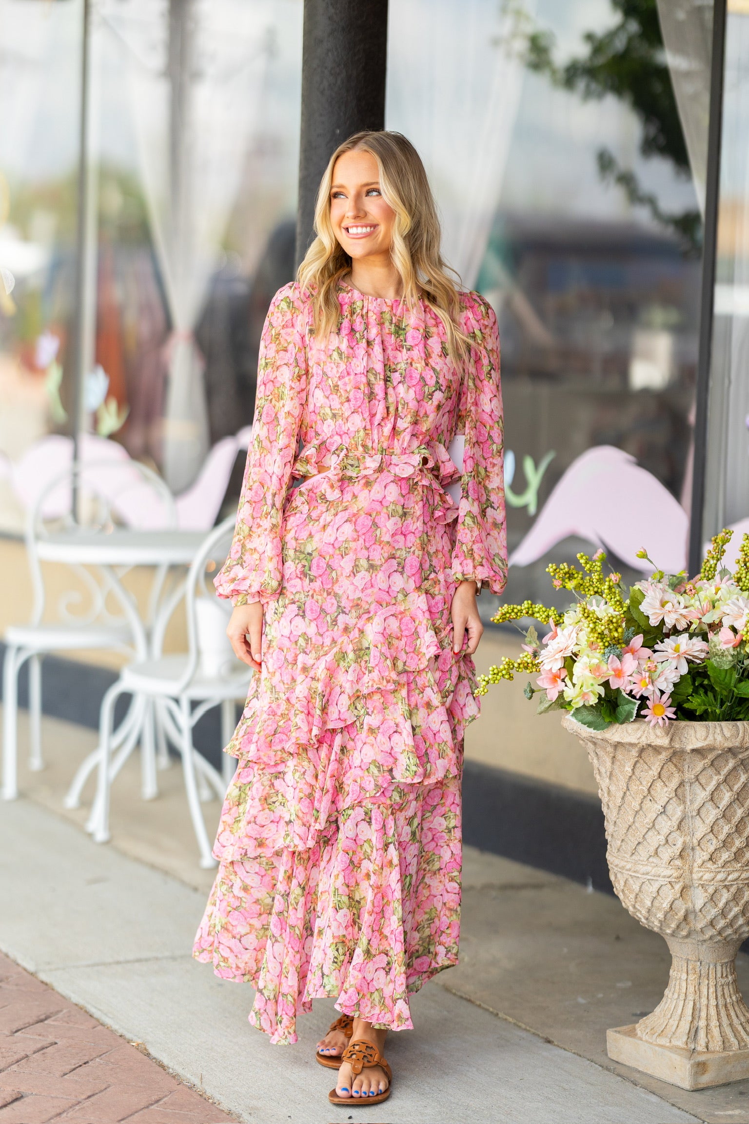 This pink long flowy dress exudes romance and bold elegance, with soft fabric that drapes beautifully as it moves. Delicate rose patterns bloom across the fabric, enhancing its feminine charm. The standout feature is the chic hip cutouts on each side, adding a modern, flirty twist to the classic silhouette. Perfect for a summer evening or a garden event, it blends sweetness with subtle allure.