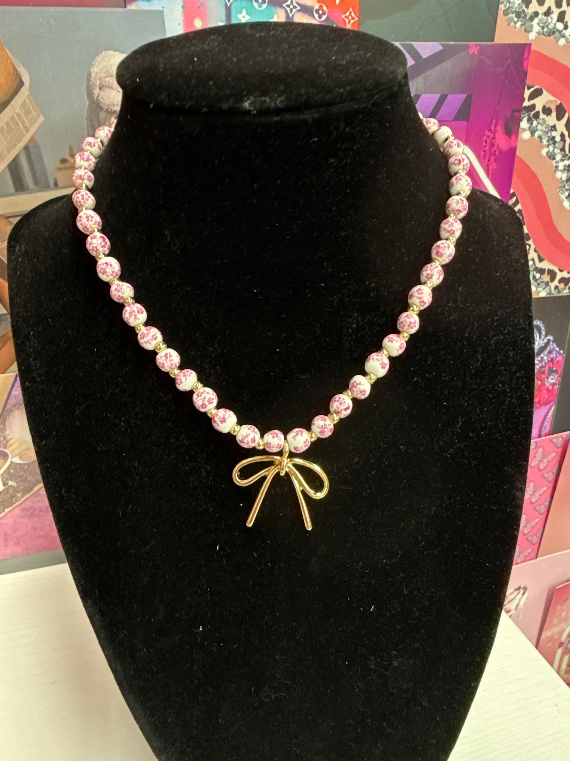 Pink and white bow necklace