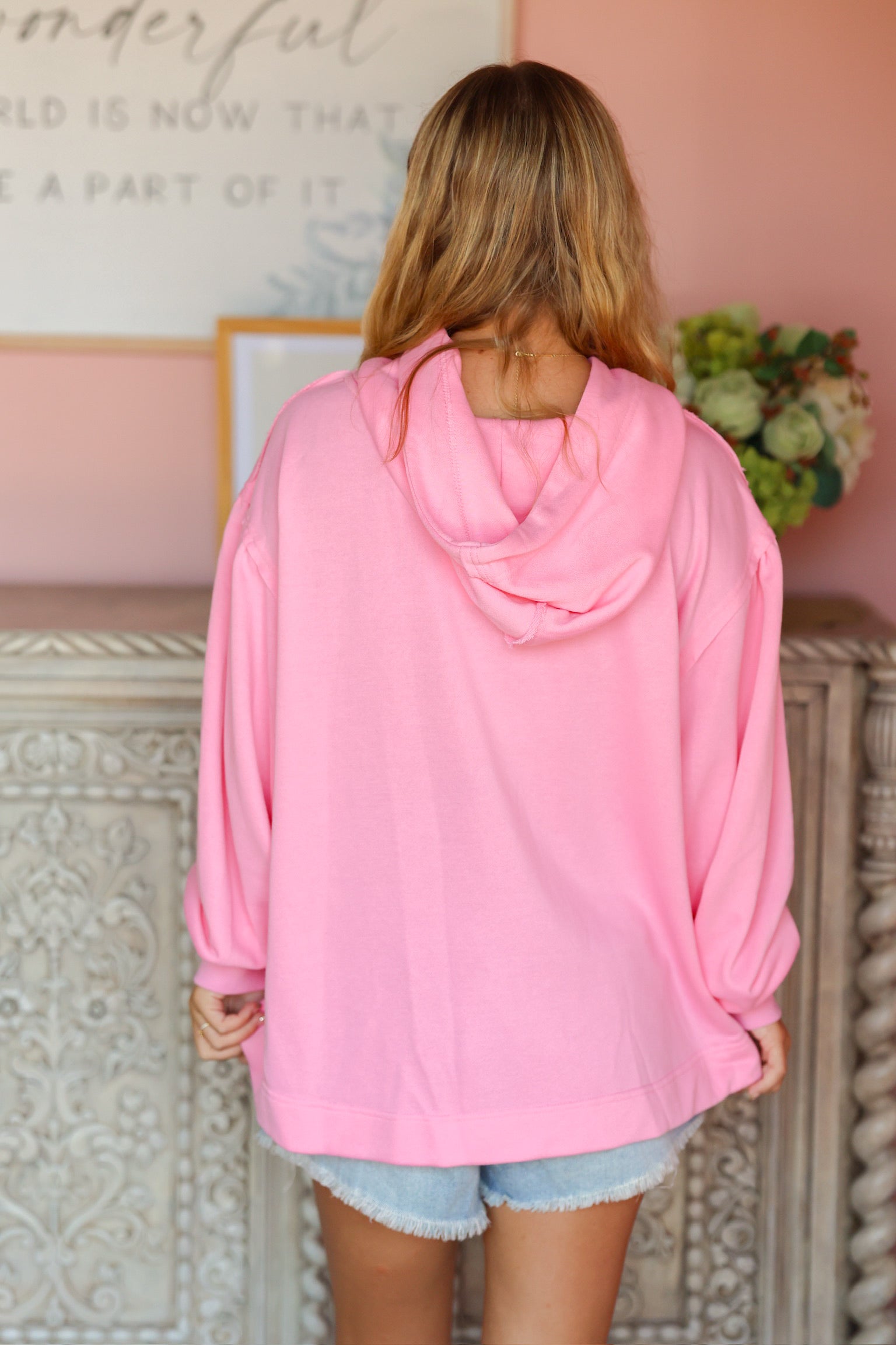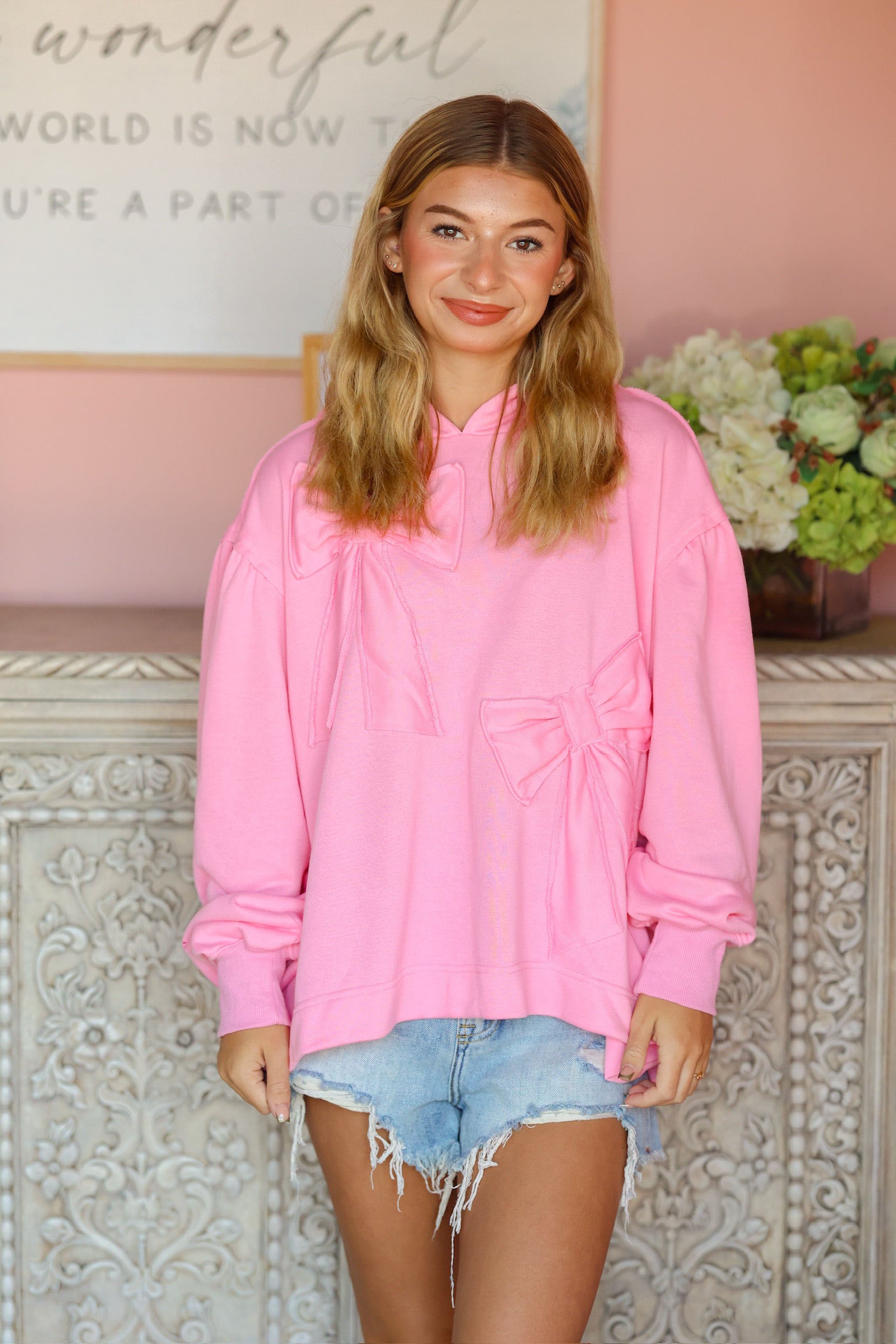This pink bow pullover hoodie adds a playful twist to a cozy classic. Made from soft, comfortable fabric, it features a relaxed fit. A charming bow detail adds a girly touch, making it perfect for lounging or casual days out. Sweet, stylish, and ultra-comfy—it’s a go-to piece for laid-back looks with a fun flair.