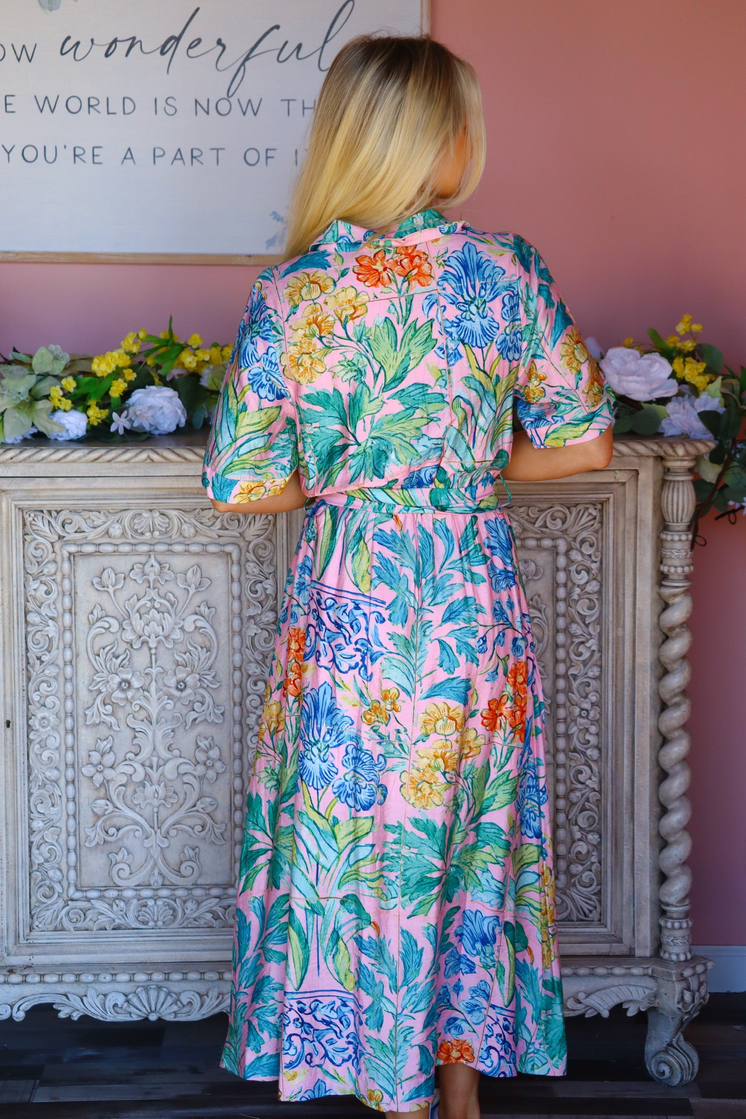 This pink printed dress features a vibrant mix of colors for a playful, eye-catching look. Designed with a flattering tie waist that defines your shape, this dress offers both style and comfort. Finished with functional side pockets, it blends boutique charm with everyday practicality—perfect for brunch, shopping days, or casual outings with a polished feel.