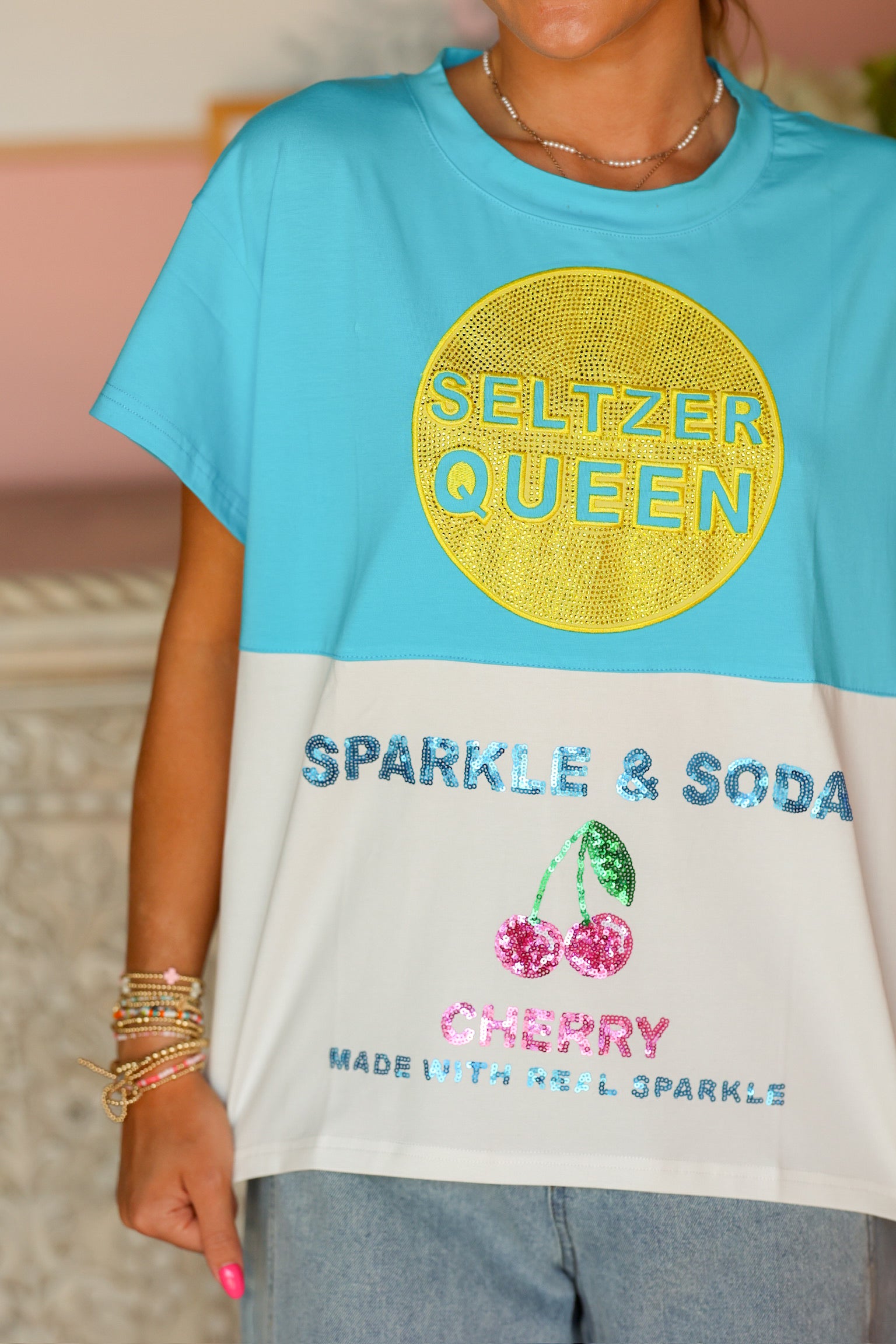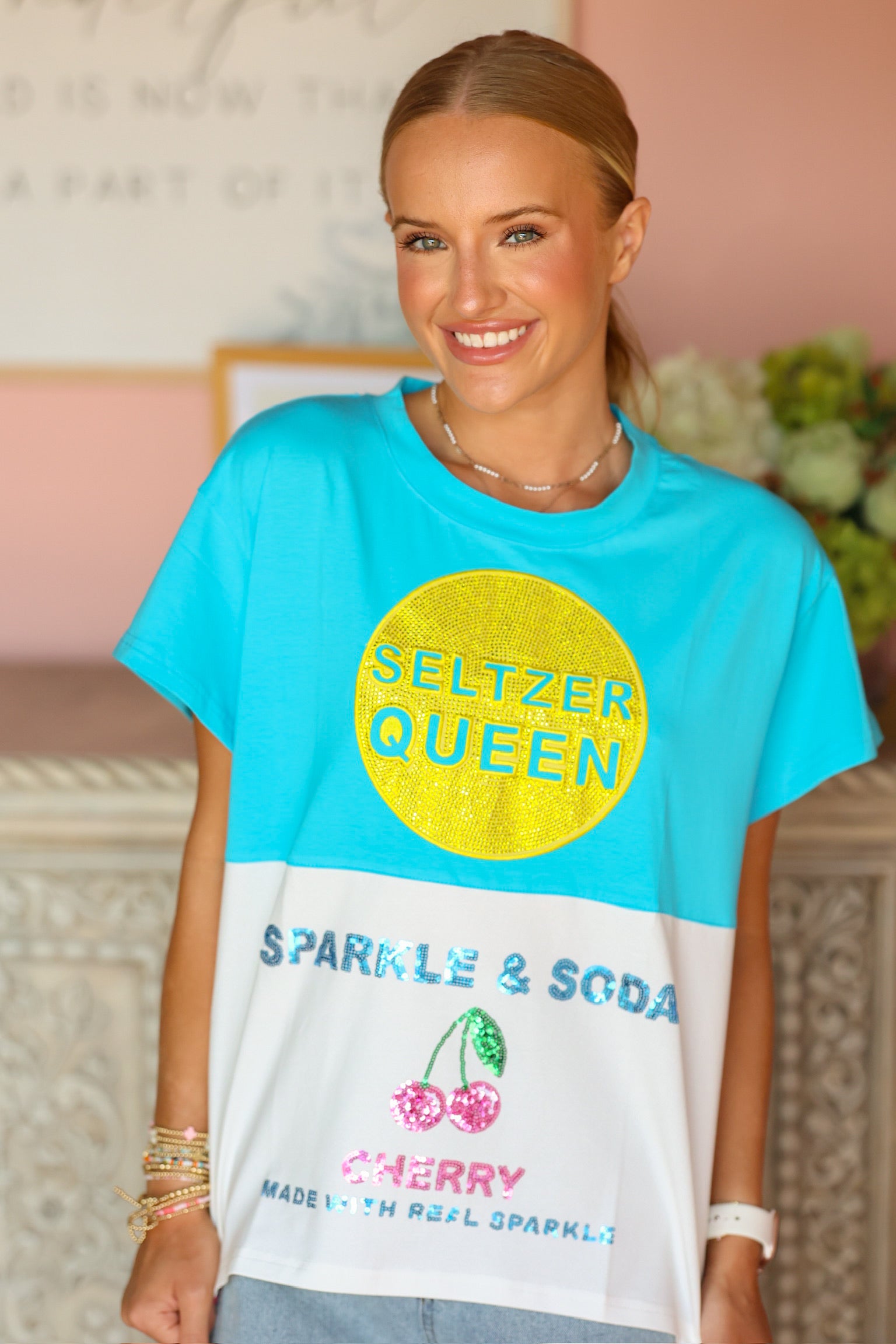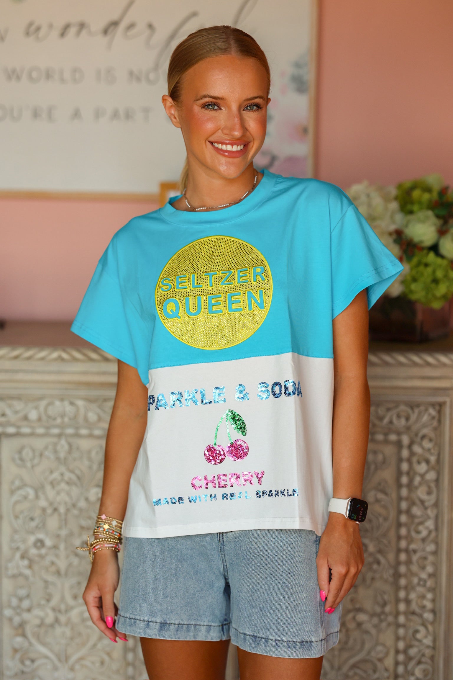 This playful tee features a bold split design with half aqua and half white for a fresh, eye-catching look. Across the chest, "Seltzer Queen" is printed inside a yellow diamond-shaped circle, adding a fun, retro vibe. Near the bottom, the phrase "Sparkle & Soda" is written in glittery text alongside a pair of sparkling red cherries, giving it a whimsical and fizzy finish. The relaxed fit and vibrant graphics make it perfect for summer days or lounging in style.