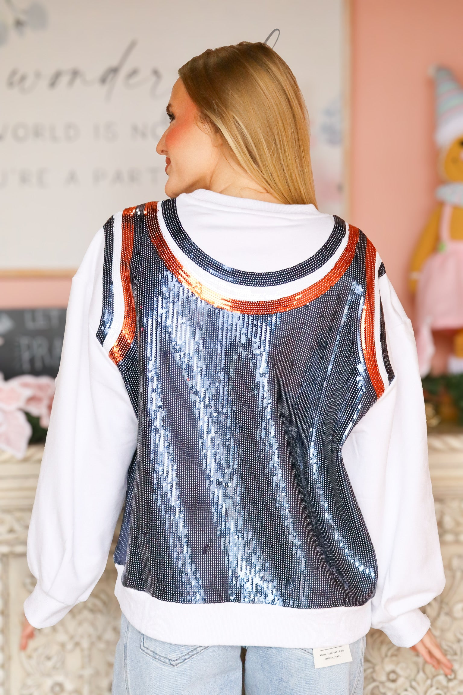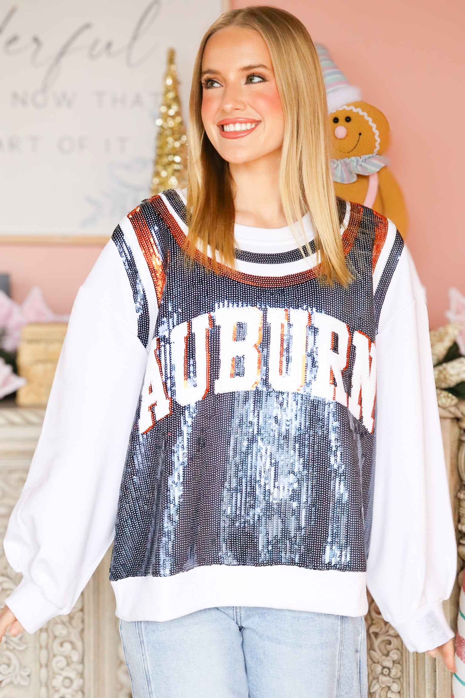 Rep your team with effortless style in this QOS Auburn Jersey Sweatshirt. Designed with bold jersey-inspired graphics and classic Auburn colors, this cozy sweatshirt gives you that game-day energy with everyday comfort. The soft, fleecy interior and relaxed fit make it perfect for tailgates, errands, or lounging at home. Pair it with jeans or joggers for a winning, sporty-cute look.
