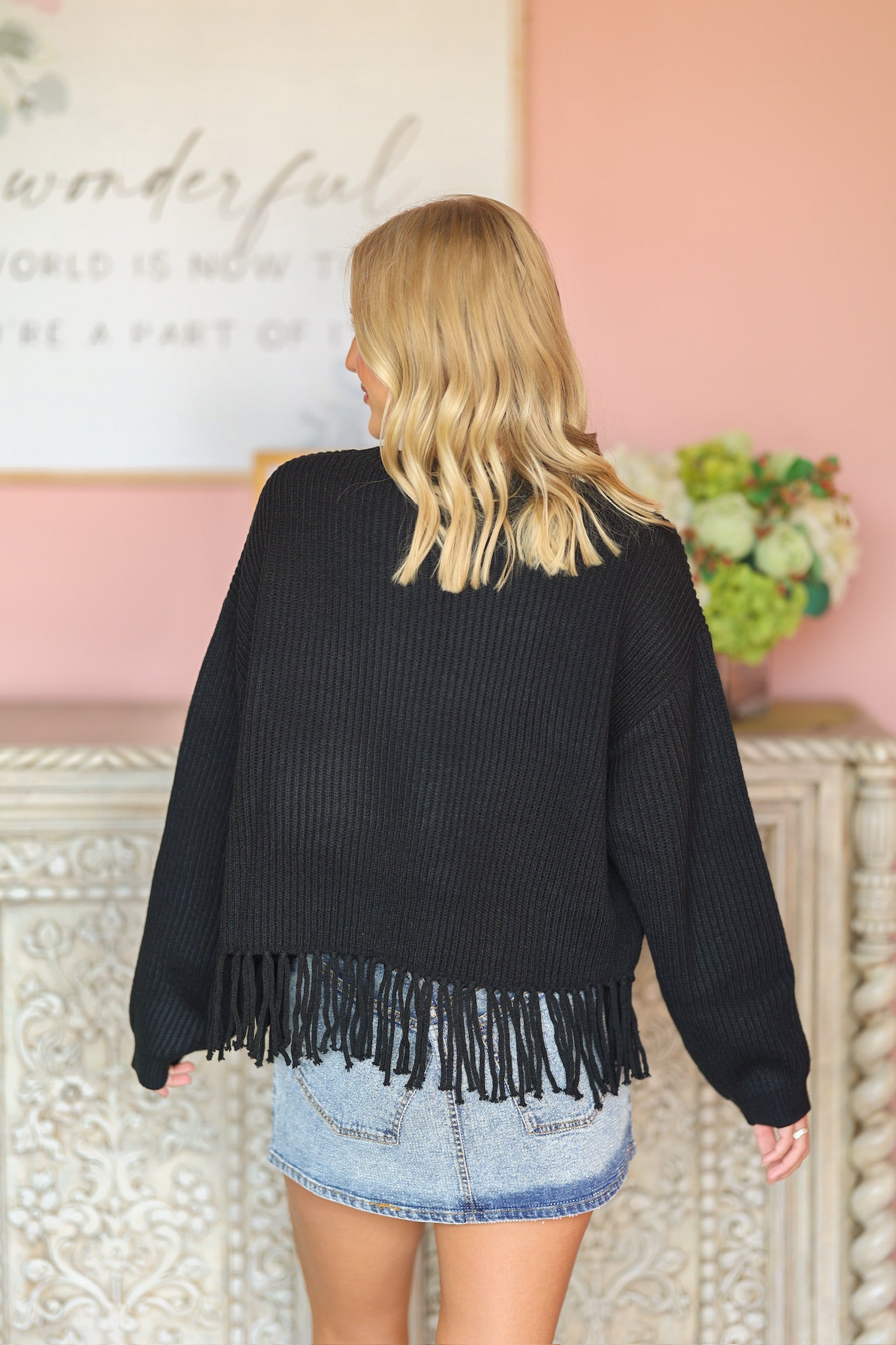 This QOS black fringe tiger sweater makes a bold statement with its fierce tiger graphic and playful fringe detailing along the sleeves. Crafted from soft, cozy knit, it offers a relaxed fit that’s perfect for staying warm while showing off your wild side in game-day style.