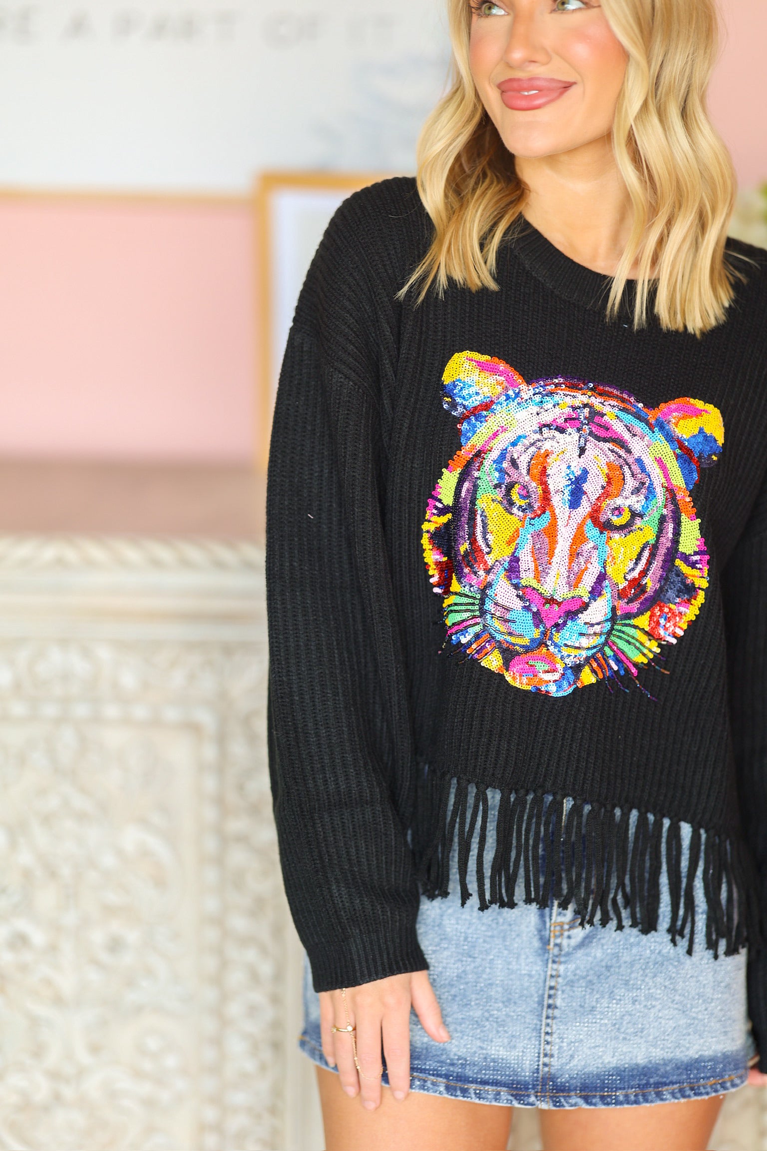 QOS Black Fringe Sweater Rainbow Tiger Head