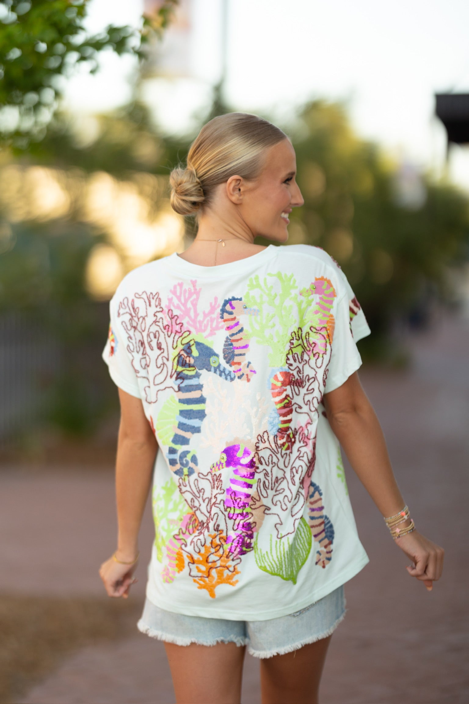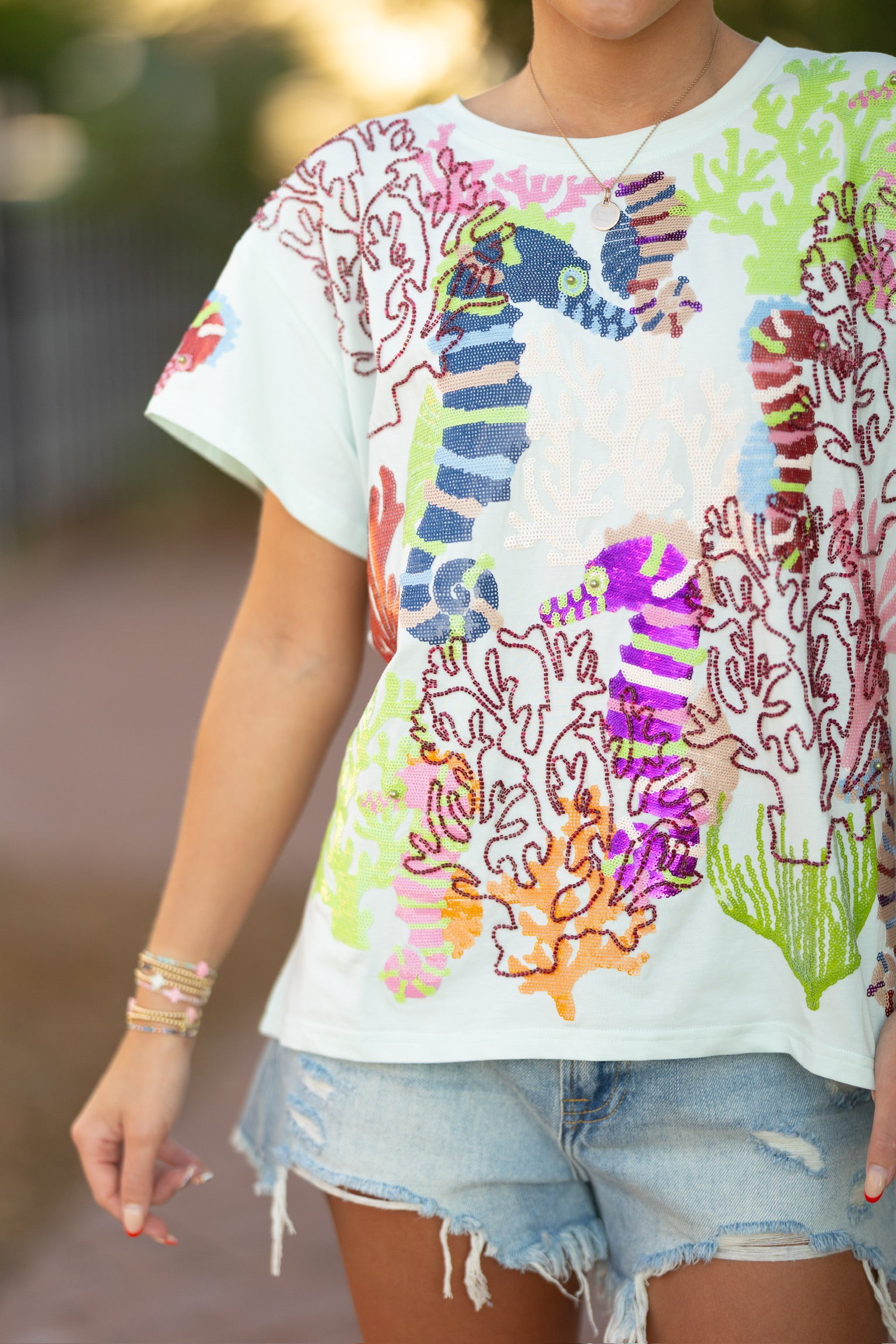The top is a casual, light blue, short-sleeve featuring a vibrant and playful coral reef-inspired design. It is covered in multicolored embroidered or printed sea life motifs, including seaweed, coral, and a striped seahorse. The bright colors—such as purple, green, orange, and pink—give it a cheerful, tropical vibe. The relaxed fit and soft material make it a comfortable choice for a warm, sunny day.