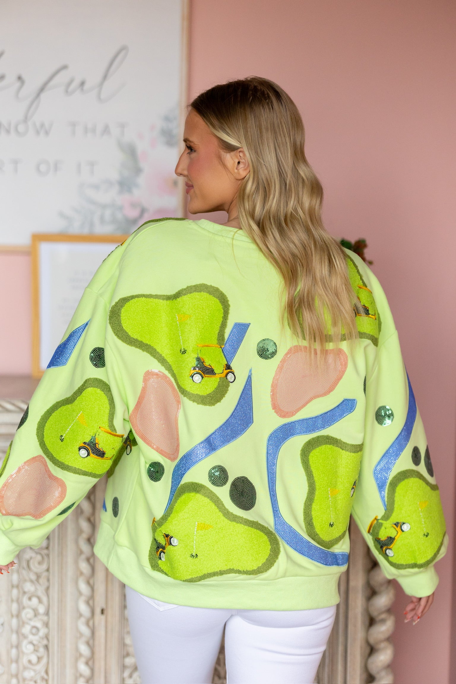 This Queen of Sparkles sweatshirt features a vibrant green base, designed to mimic the look of a golf course. Covered in playful, sequin-adorned golf carts, it brings a fun and glamorous twist to sporty style. The relaxed fit and cozy fabric make it perfect for casual wear or a breezy day on the green. Eye-catching and whimsical, it’s a must-have for anyone who loves golf with a side of sparkle.