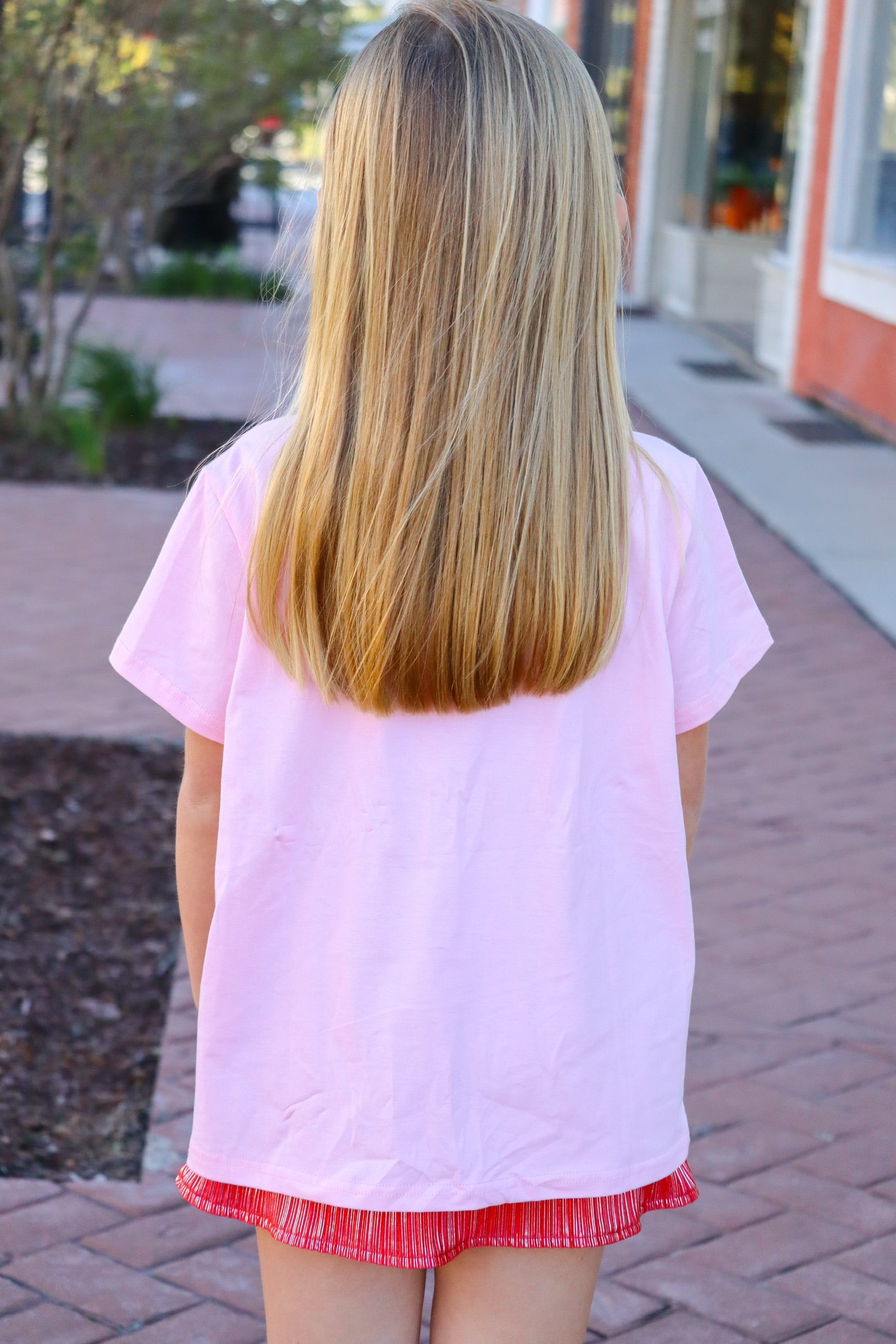 The QOS Kids Light Pink Gingerbread House Tee is a sweet and festive top perfect for the holiday season. Made from soft, breathable fabric, it features a charming gingerbread house graphic on a light pink background, adding a playful and cheerful touch. The classic tee silhouette offers a comfortable, relaxed fit, making it ideal for school, holiday parties, or everyday wear. Cute, cozy, and full of seasonal charm, this tee brings a touch of holiday magic to any little one’s wardrobe.