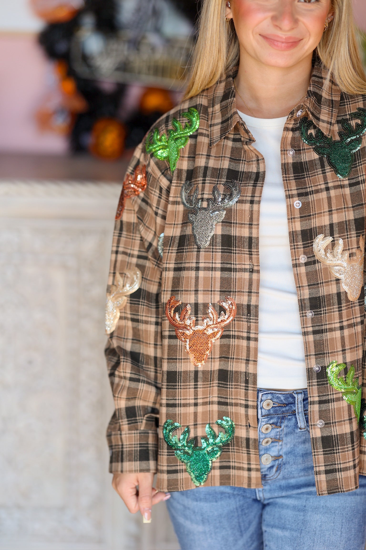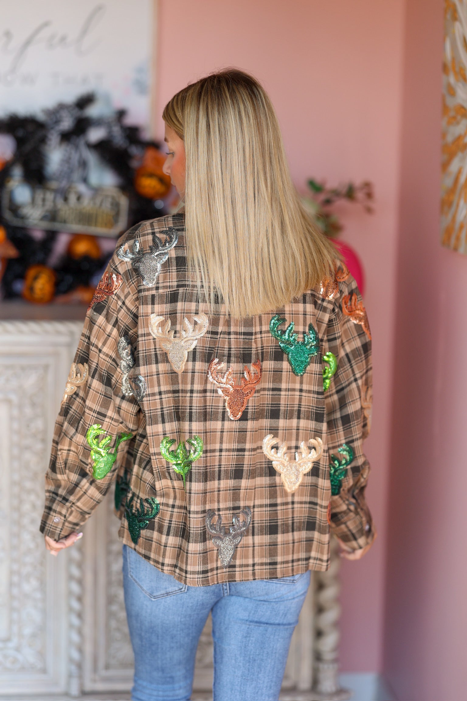 The QOS Plaid Deer Button Up is a statement shirt that blends playful seasonal charm with everyday wearability. Featuring a classic plaid backdrop and deer-head detailing, this long-sleeve button-up offers a bold, festive touch to your wardrobe. With a structured collar, full front button closure, and a tailored yet comfortable fit, it can be worn buttoned for a polished look or layered open over a tee for casual styling. Available in multiple sizes and crafted to stand out, it's ideal for fall events, holiday gatherings, or just making your everyday outfit a little more fun.