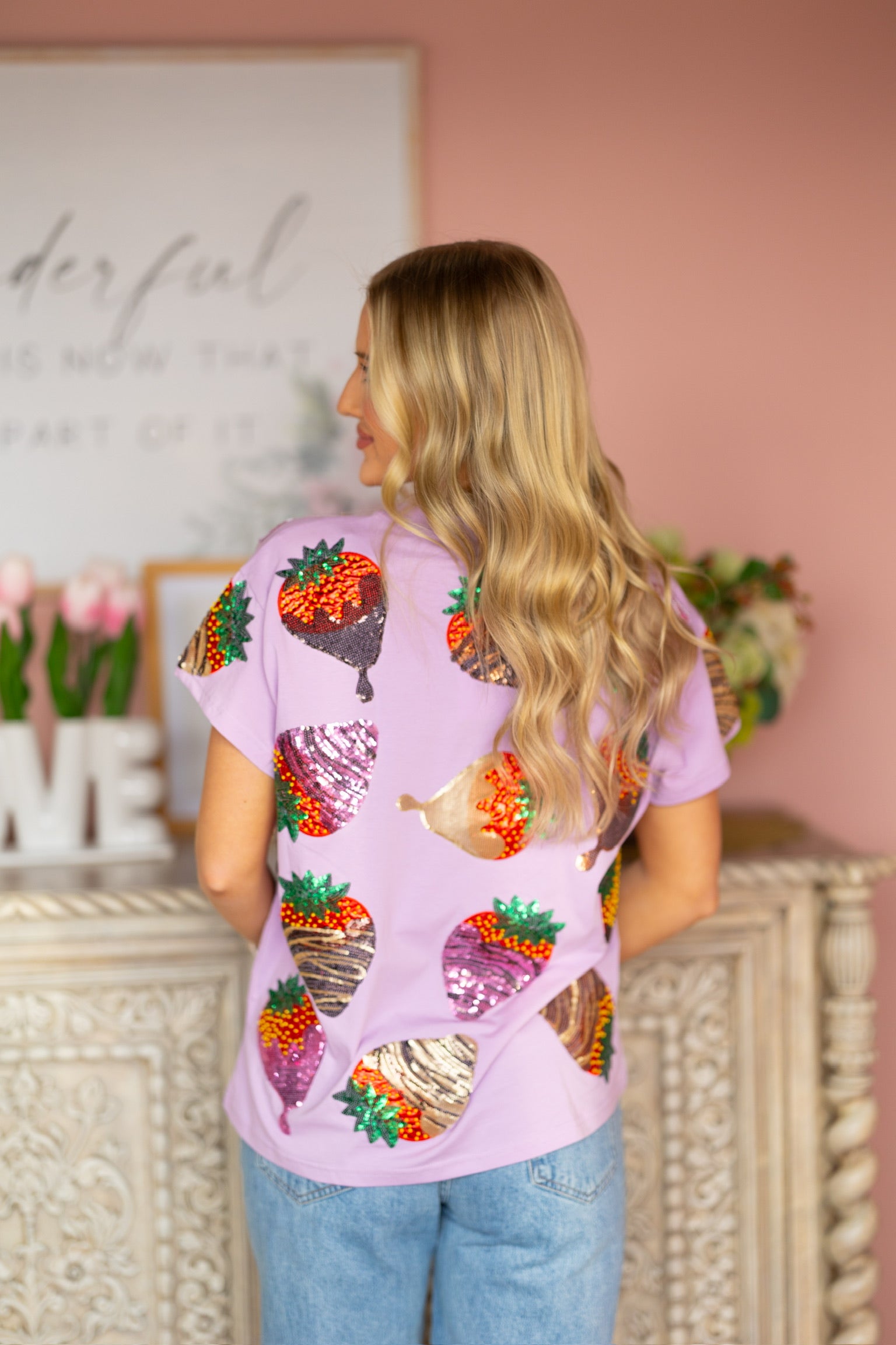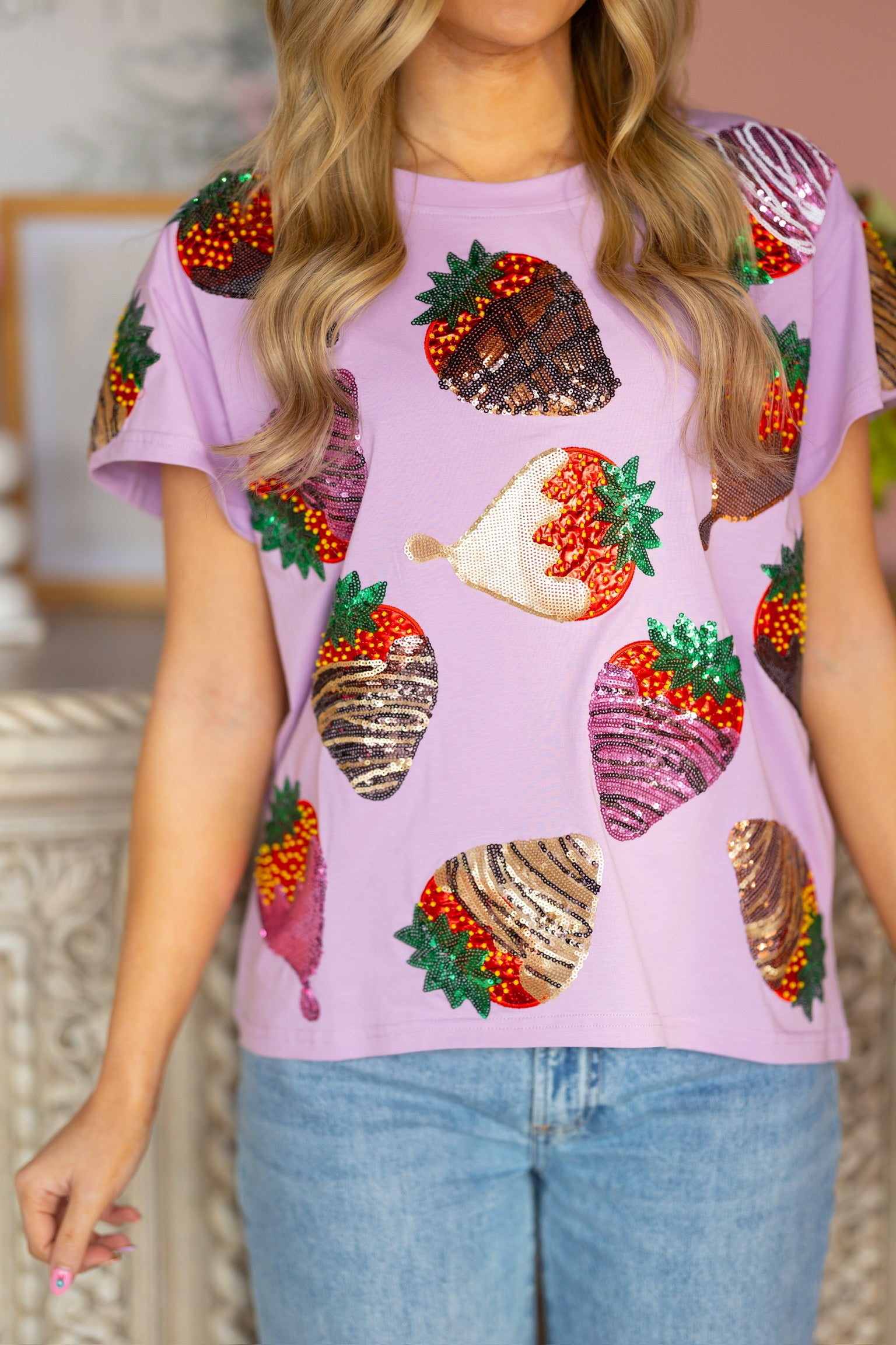 A lavender short-sleeve shirt with sequined chocolate-covered strawberries is a delightful and whimsical piece that merges playful charm with a hint of glamour. The shirt is typically made from a soft, breathable fabric like cotton or a cotton blend, offering a light and comfortable fit that is perfect for warmer weather or casual outings. The short sleeves provide a relaxed, easygoing look, while the slightly fitted or relaxed silhouette keeps it versatile and flattering.The real star of this shirt is the unique, eye-catching design of sequined chocolate-covered strawberries. These strawberries are carefully embellished with shimmering sequins, creating a textured, eye-popping effect.