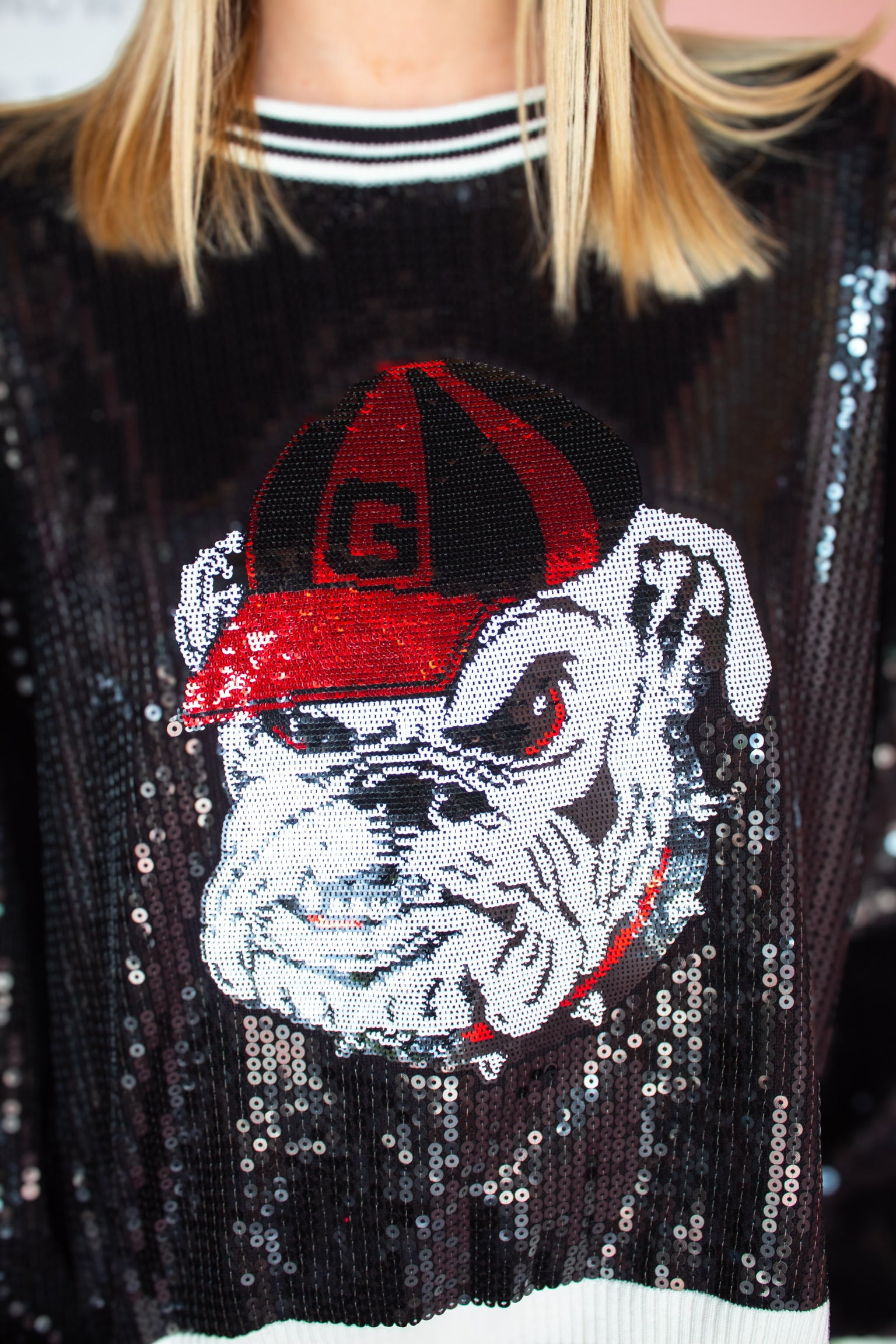 Make a bold statement with this cozy yet eye-catching sweater featuring Queen of Sparkles’ signature sequin detailing. A proud bulldog design shines across the front, perfect for showing team spirit or adding playful glam to your look. Soft, comfortable, and effortlessly standout, it’s ideal for game days or casual wear with a touch of sparkle.