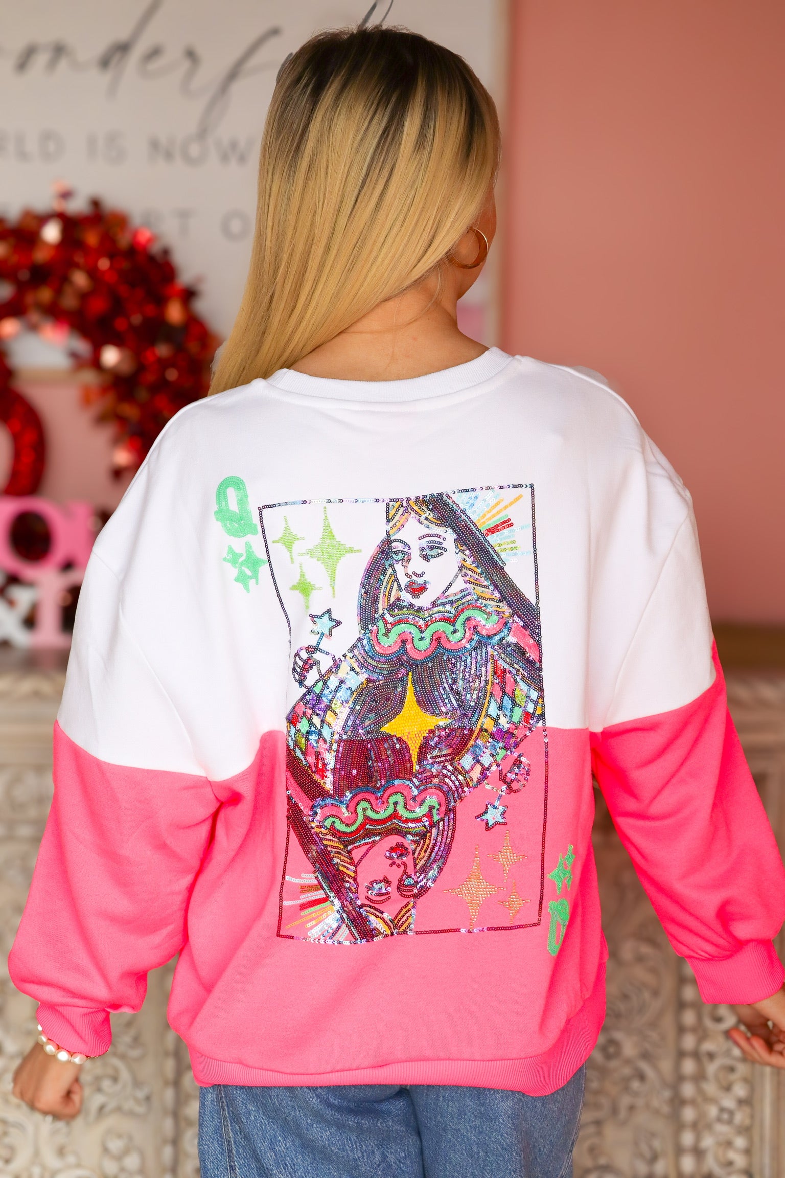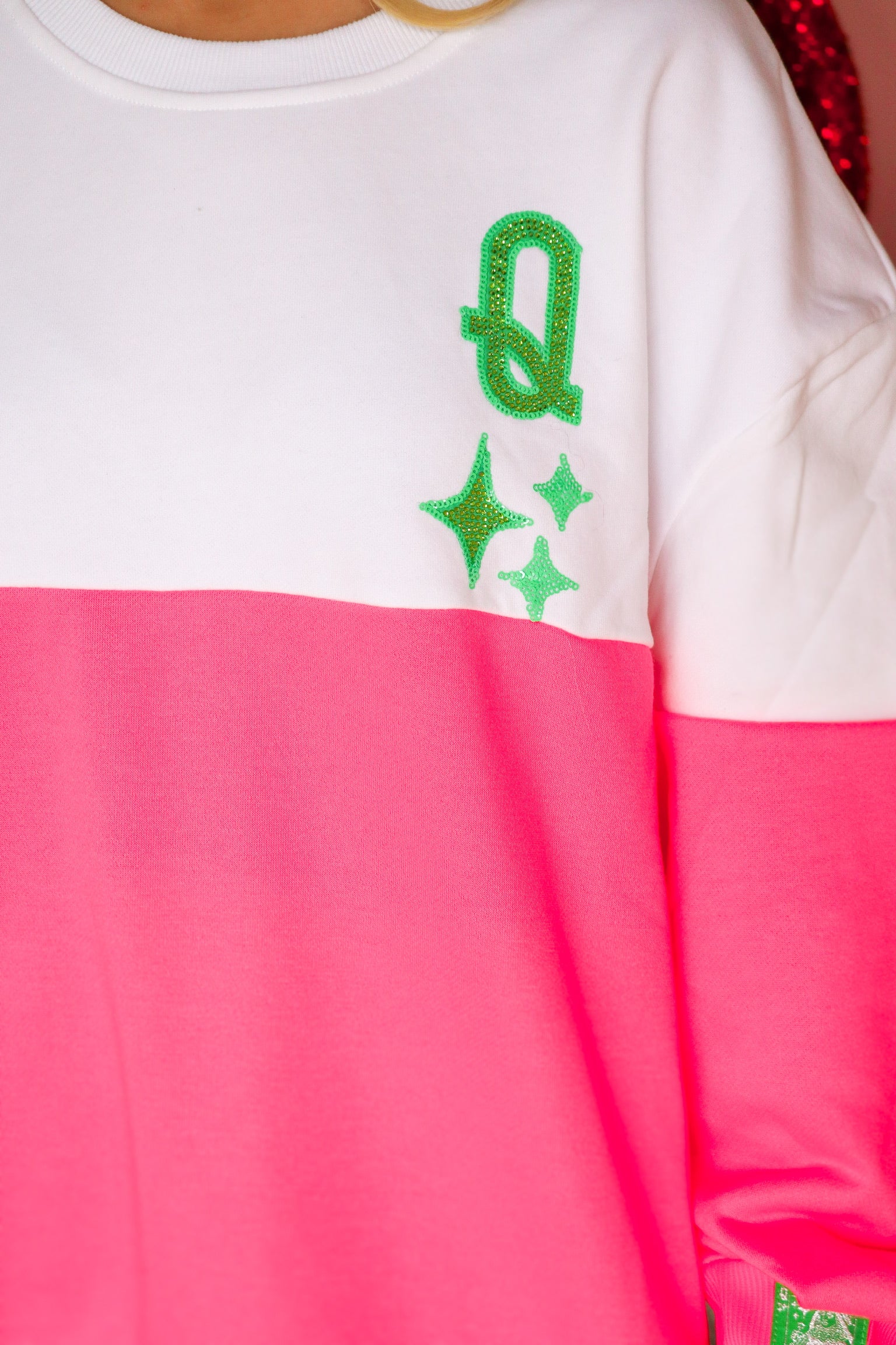 Stand out in the QOS White & Pink Color Block Logo Card Sweatshirt, featuring a fresh mix of crisp white and playful pink color blocking. Designed with the signature Queen of Sparkles logo card detail, this sweatshirt adds a bold, sporty touch to your everyday look. The relaxed fit and cozy feel make it perfect for casual days, whether paired with jeans, leggings, or your favorite lounge bottoms.